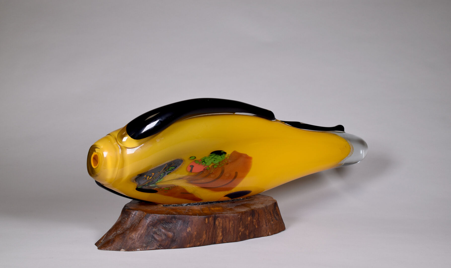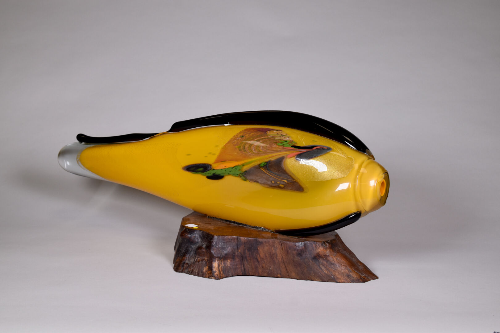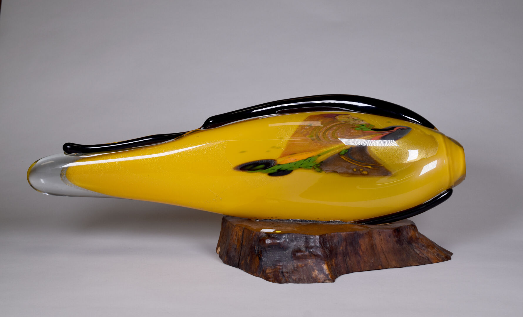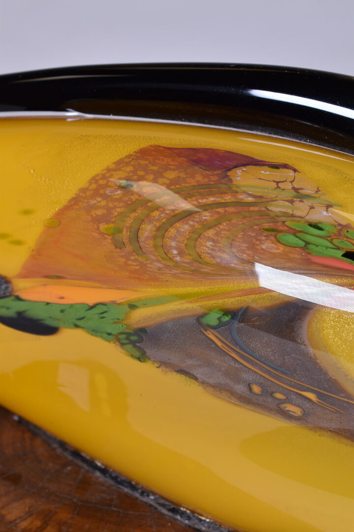 Important sujet en verre orange, noir et paillons or figurant un poisson posé sur un morceau de bois. XXe siècle. Haut. : 29 cm – Larg. : 70 cm – Prof. : 23 cm.