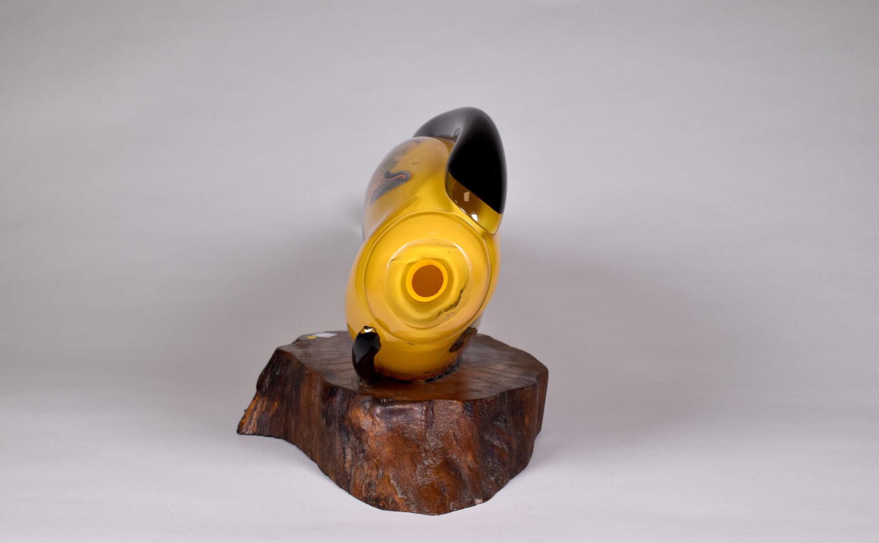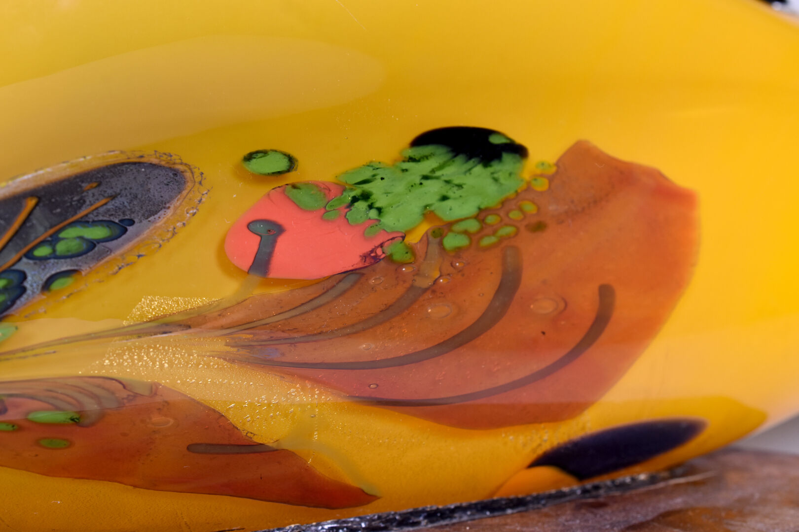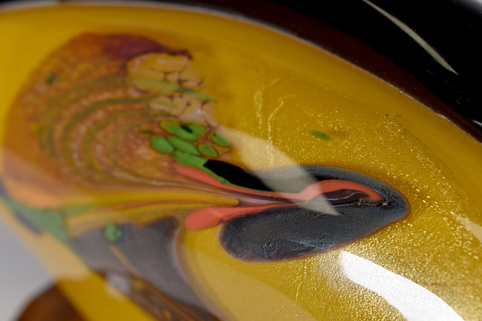 Important sujet en verre orange, noir et paillons or figurant un poisson posé sur un morceau de bois. XXe siècle. Haut. : 29 cm – Larg. : 70 cm – Prof. : 23 cm.