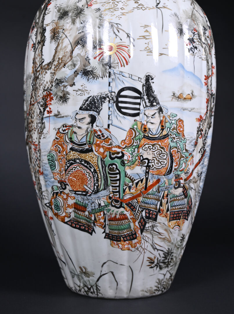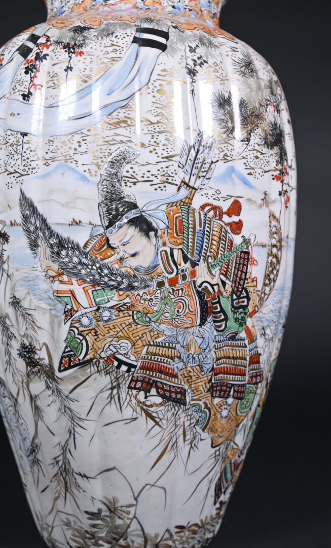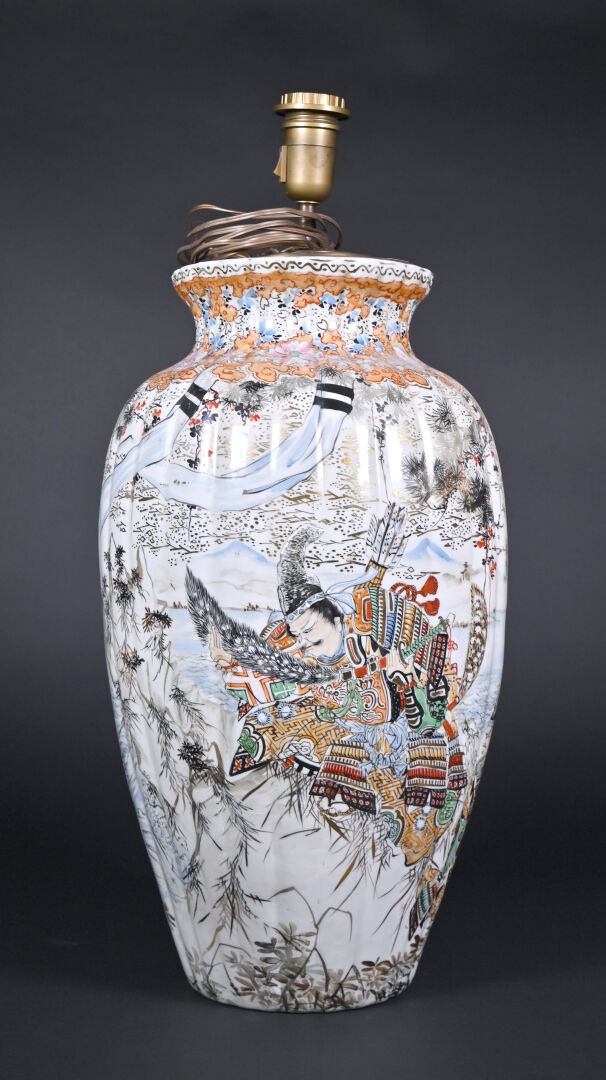 Important vase en porcelaine à décor émaillé en polychromie de guerriers et paysages. Japon, Satsuma, début du XXe siècle. Monté en lampe à l’électricité. Haut du vase : 53 cm.