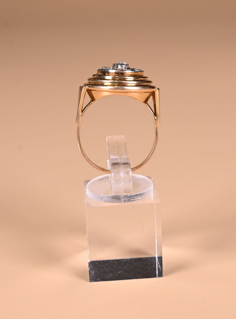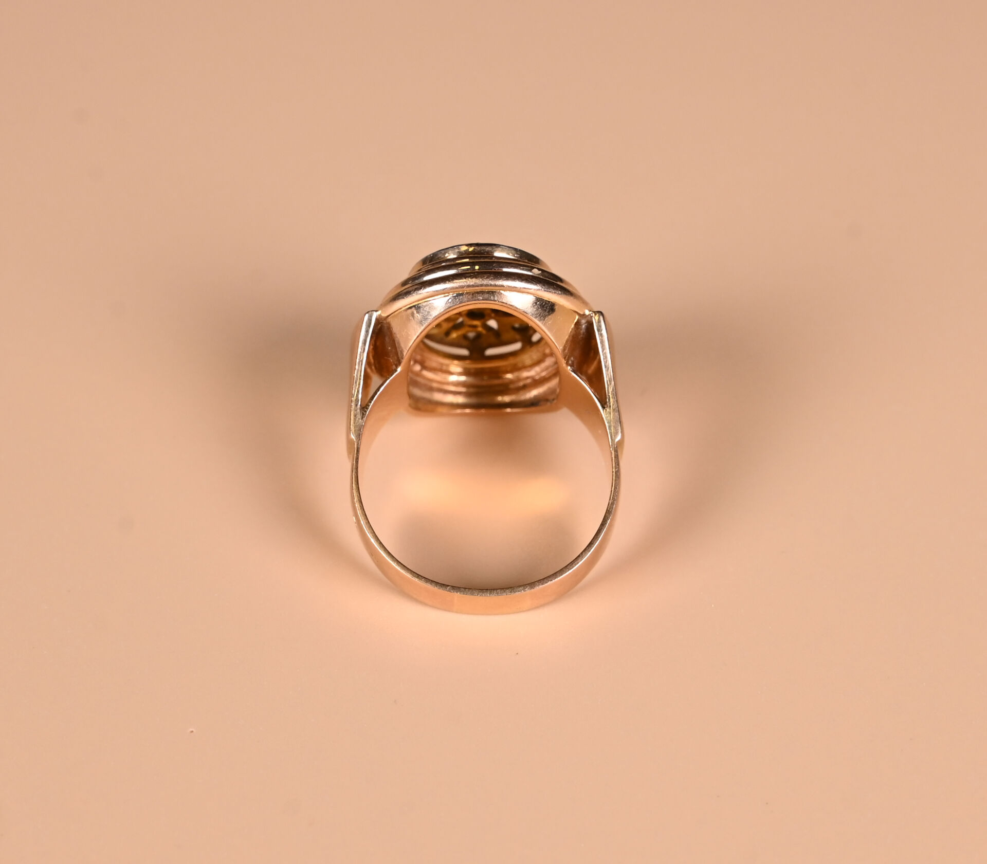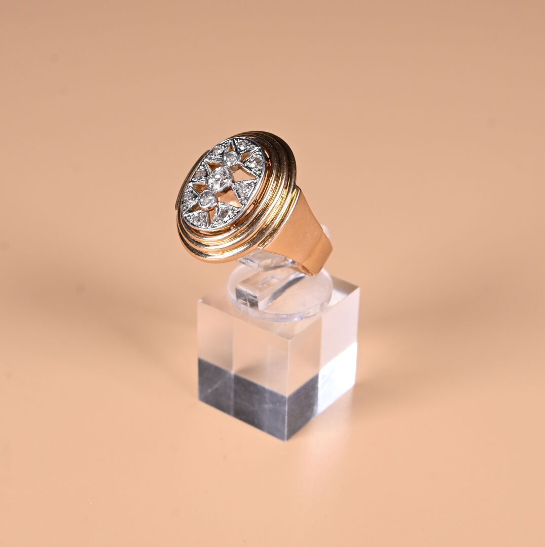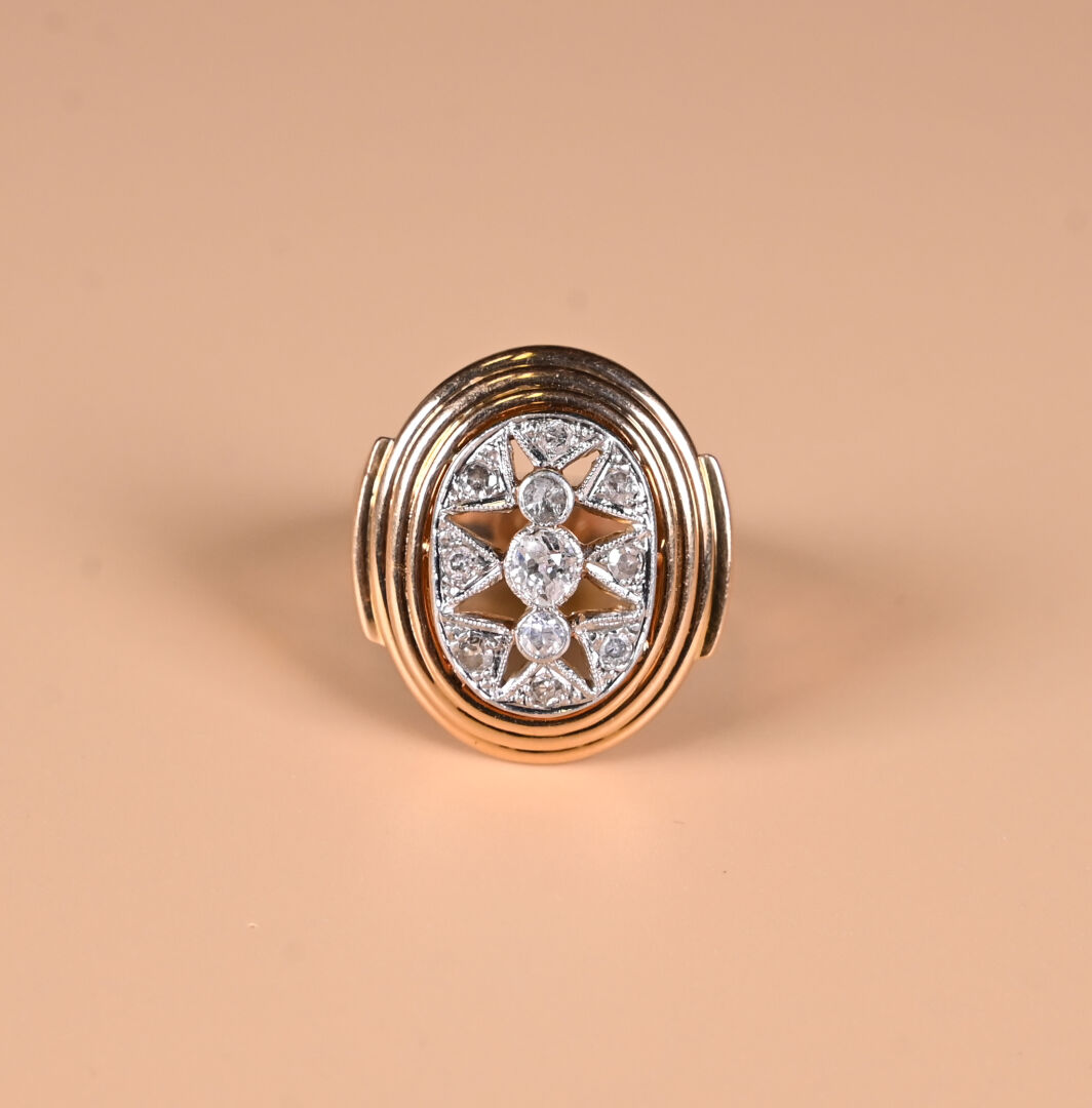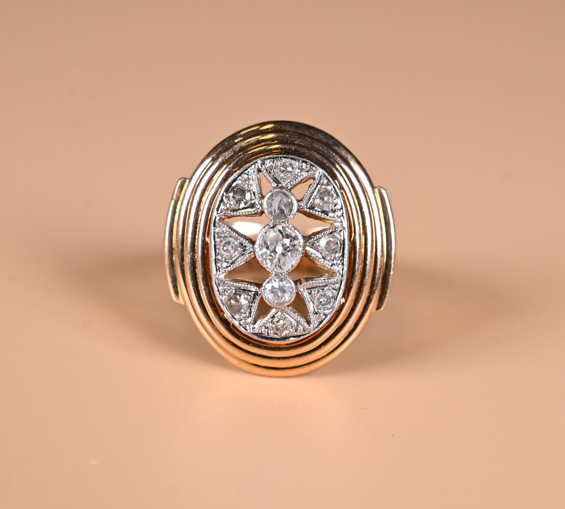 Importante bague en or jaune 18K 750/1000e, le plateau ovale à gradin ajouré serti de diamants de taille ancienne (égrisures). TDD. : 61. Poids brut. : 14,51 g.