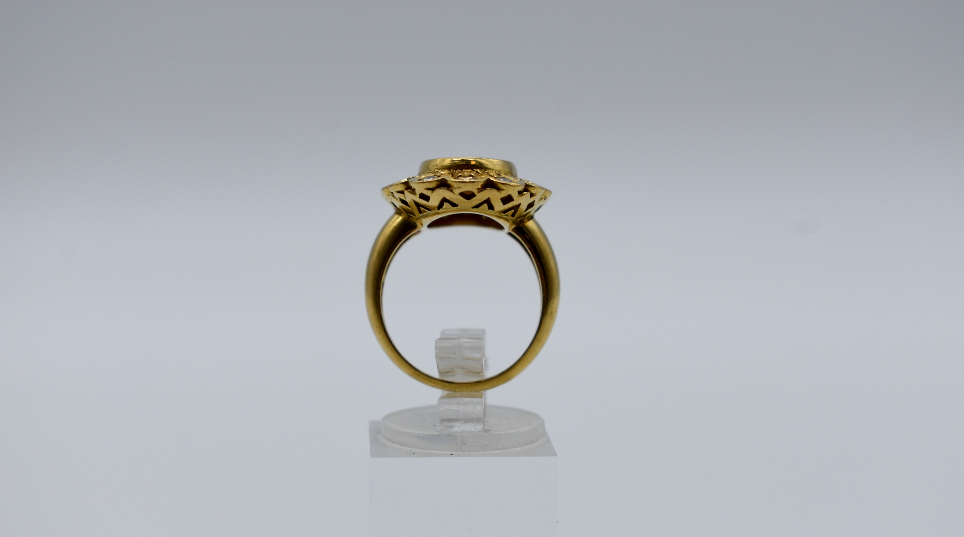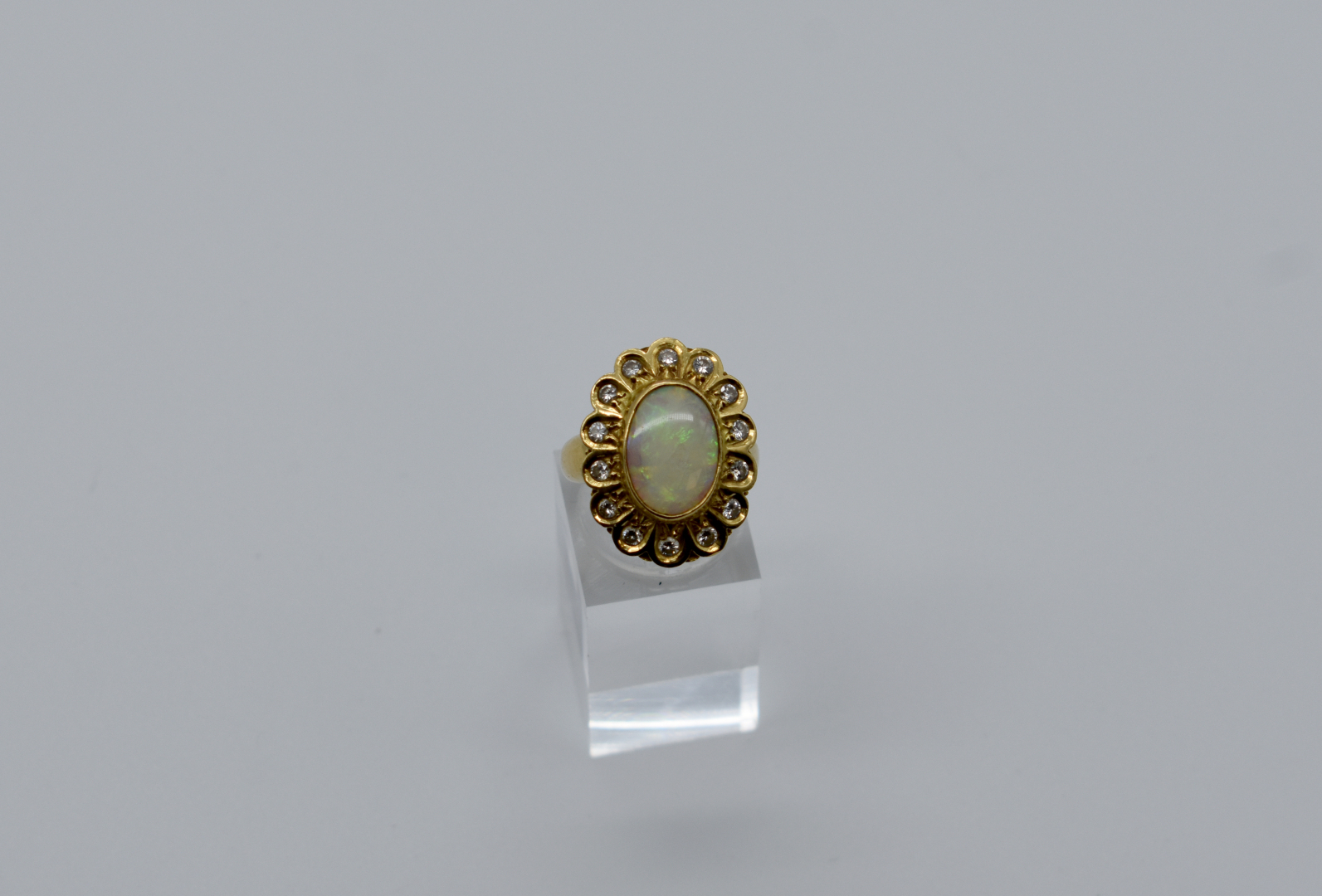 Importante bague margueritte en or jaune 18k 750/1000e ornée en son centre d’une opale dans un entourage de diamants de taille brillants d’environ 0.05 carat. TDD 54. Poids brut : 10,25 g.