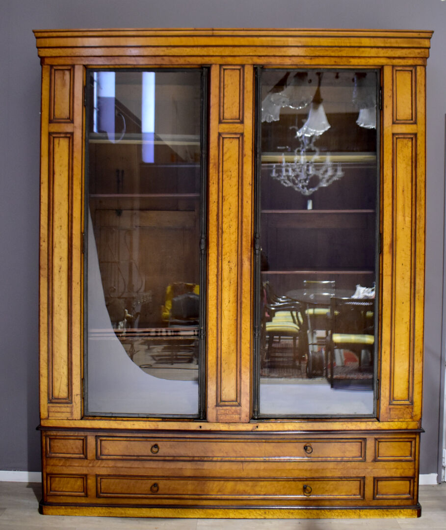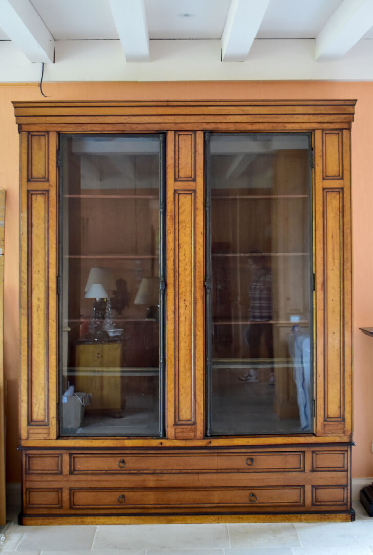 Importante bibliothèque en placage de loupe d’orme, bois noirci et ferronnerie. Elle ouvre à deux larges portes vitrées et deux tiroirs en partie basse. Travail moderne. Haut. : 244 cm – Larg. : 196 cm – Prof. : 42 cm.