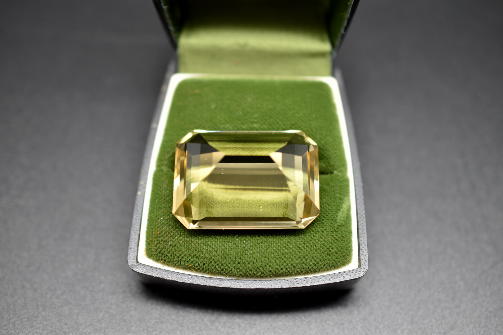 Importante citrine non montée de taille émeraude. Aucune information sur un éventuel traitement. Poids : 11,90 g soit environ 59 carats.
