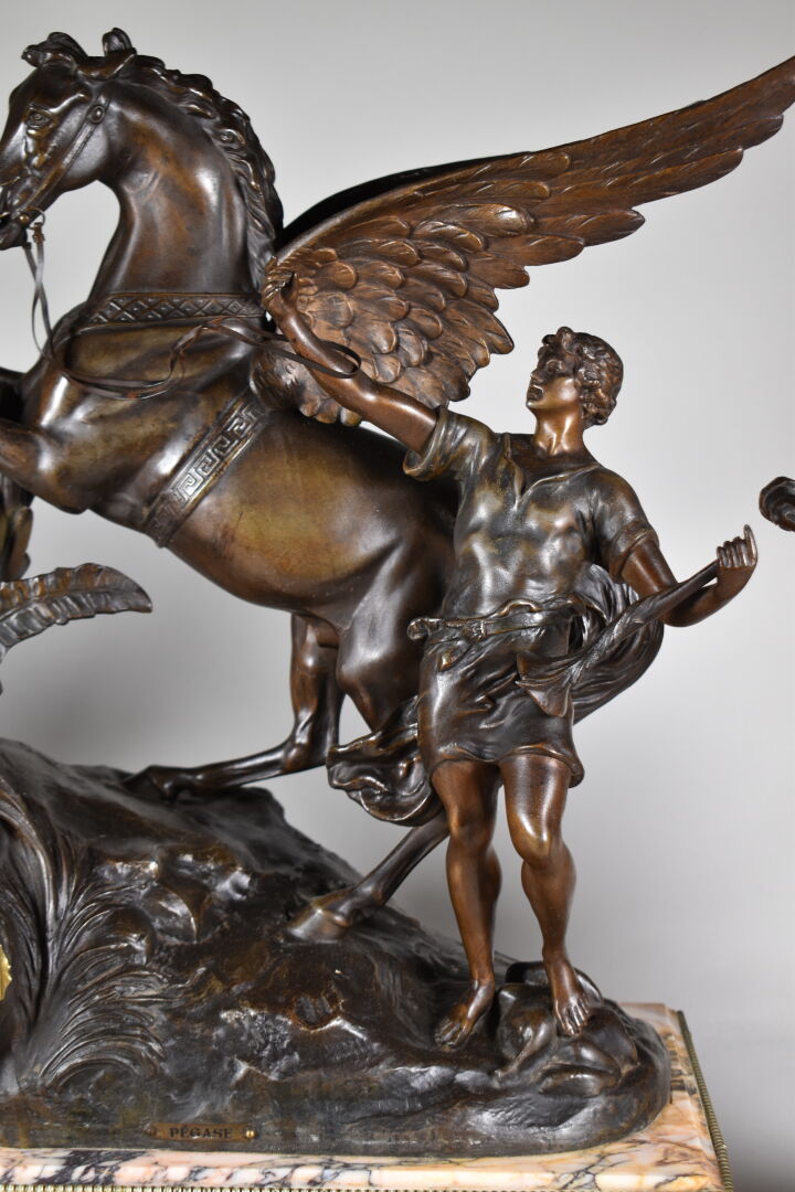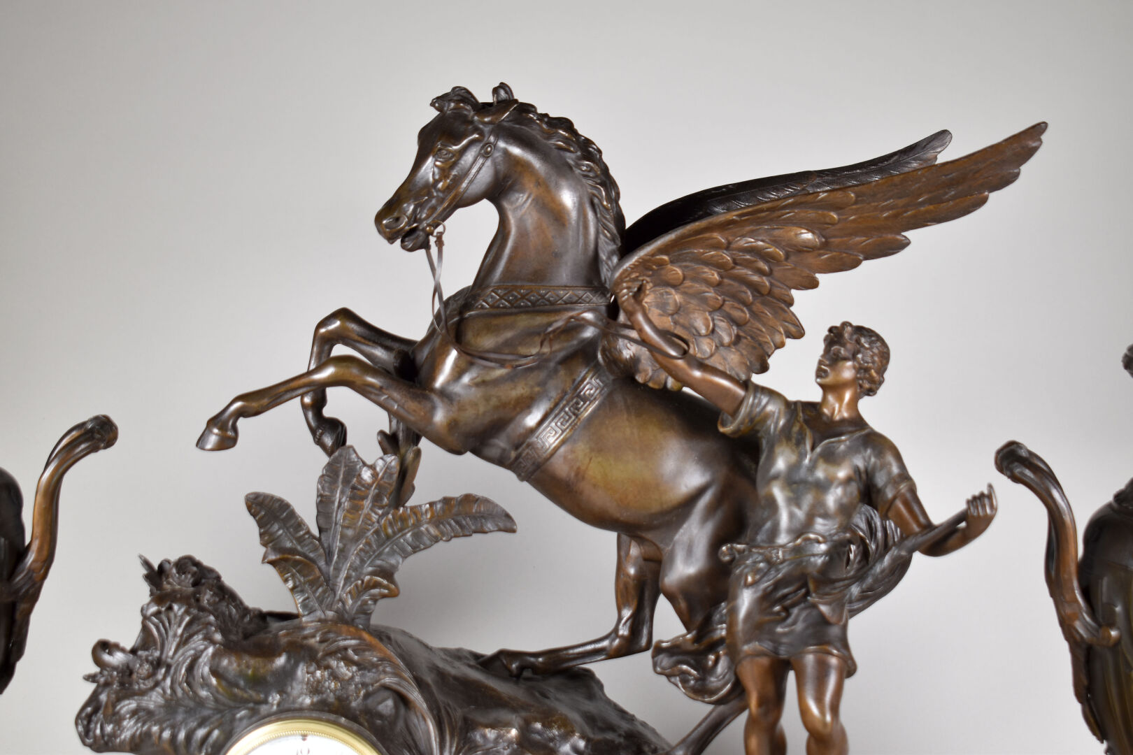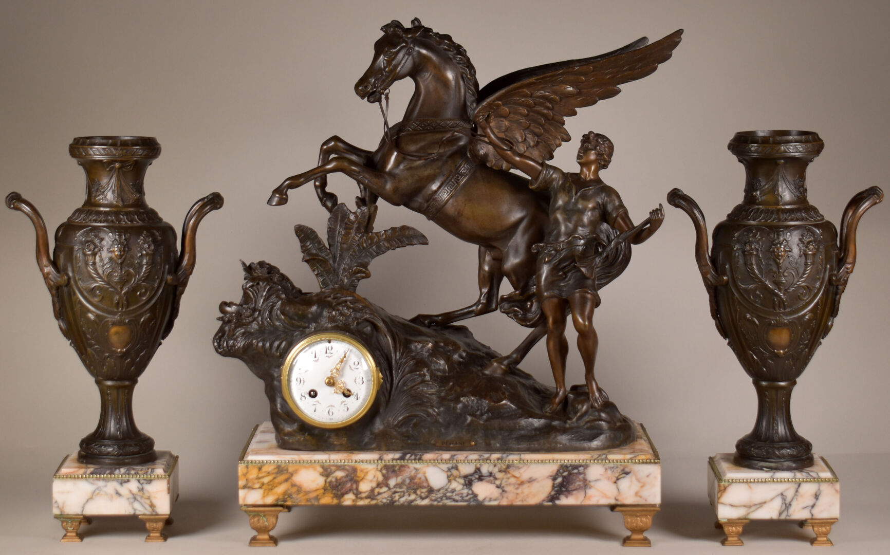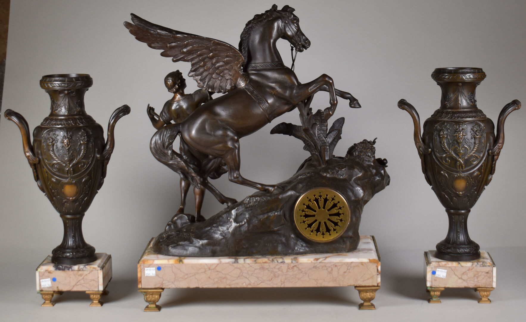 Importante garniture de cheminée en régule et bronze patiné brun, socle de marbre brèche jaune et violet. Elle comprend une pendule ornée d’un régule patiné brun représentant Pégase d’après René VARNIER et une paire de vases balustre à anses en bronze patiné brun à décor d’acanthes, rubans et mascarons. Fin du XIXe siècle. Dim. pendule. : Haut. : 60 cm – Larg. : 49 cm – Prof. : 23 cm.