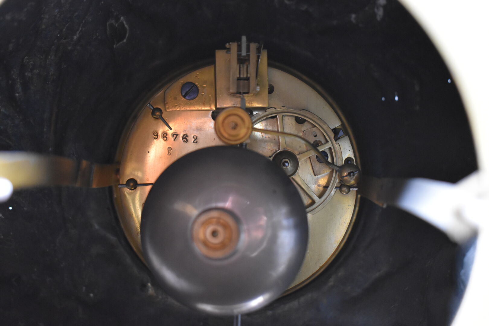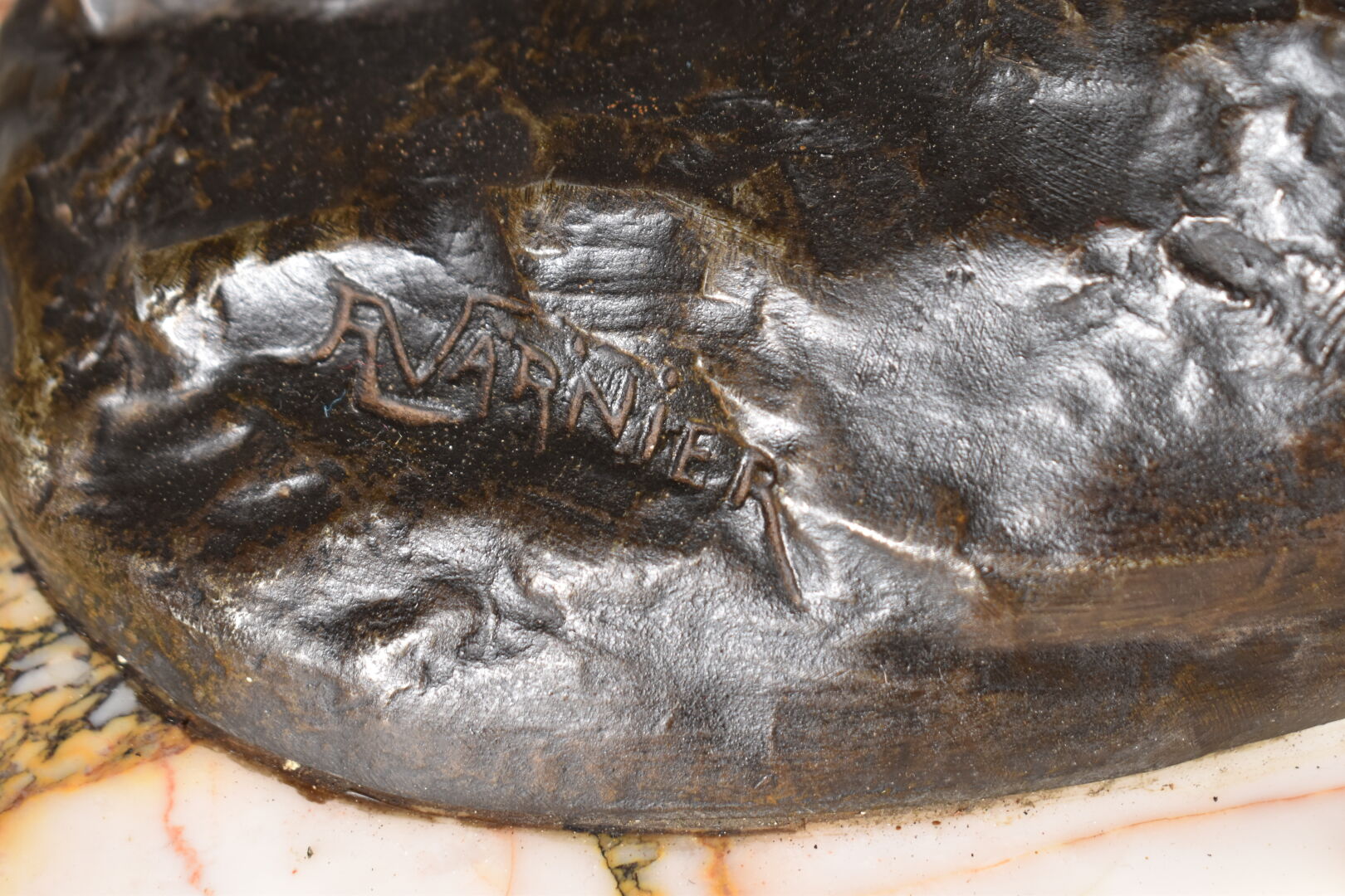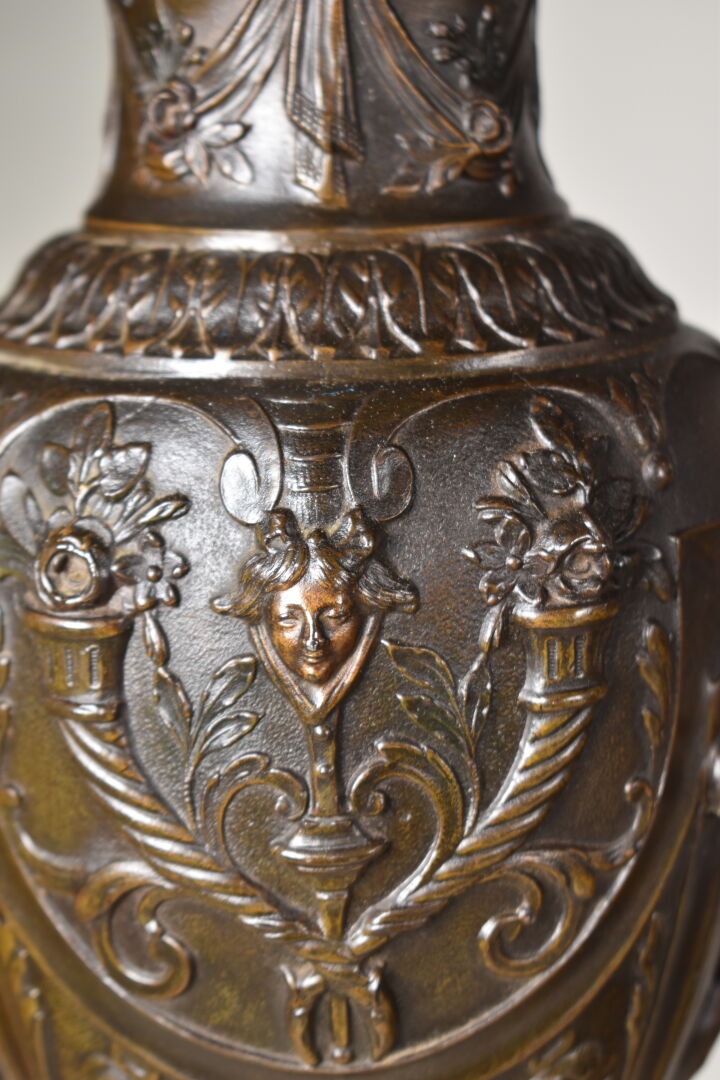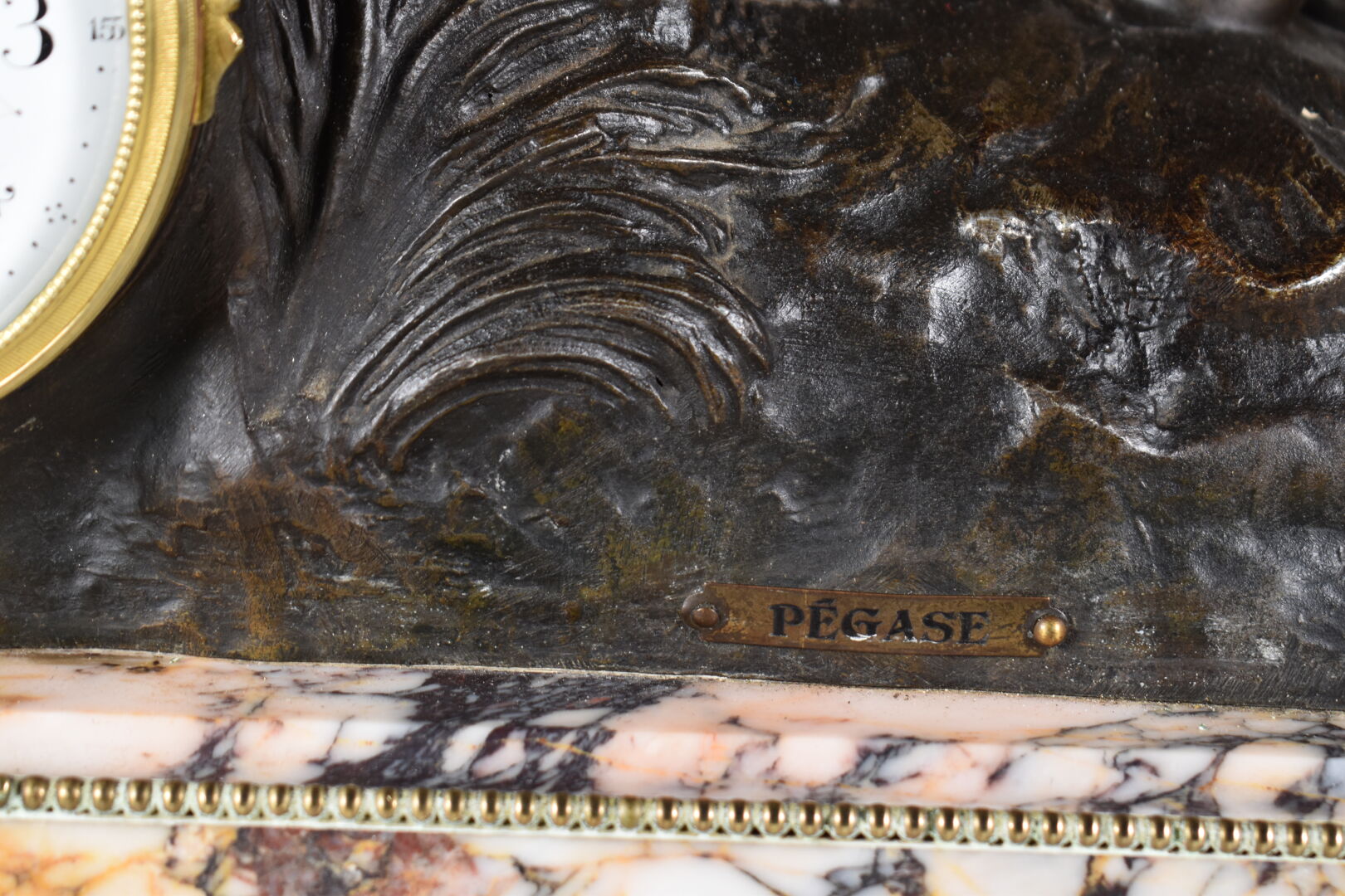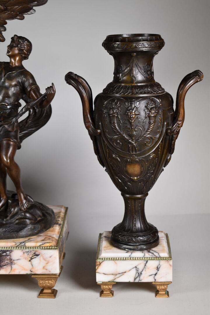 Importante garniture de cheminée en régule et bronze patiné brun, socle de marbre brèche jaune et violet. Elle comprend une pendule ornée d’un régule patiné brun représentant Pégase d’après René VARNIER et une paire de vases balustre à anses en bronze patiné brun à décor d’acanthes, rubans et mascarons. Fin du XIXe siècle. Dim. pendule. : Haut. : 60 cm – Larg. : 49 cm – Prof. : 23 cm.