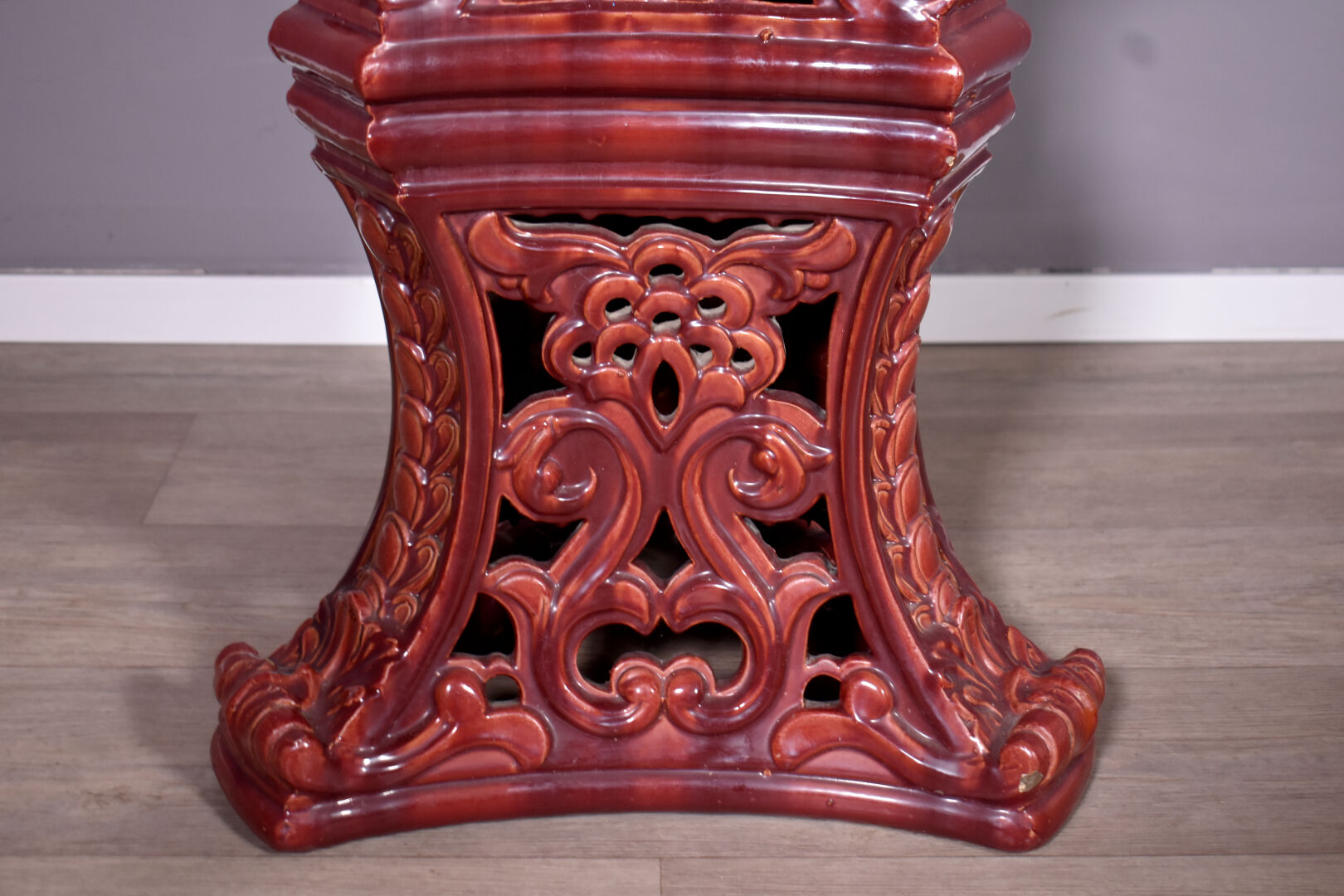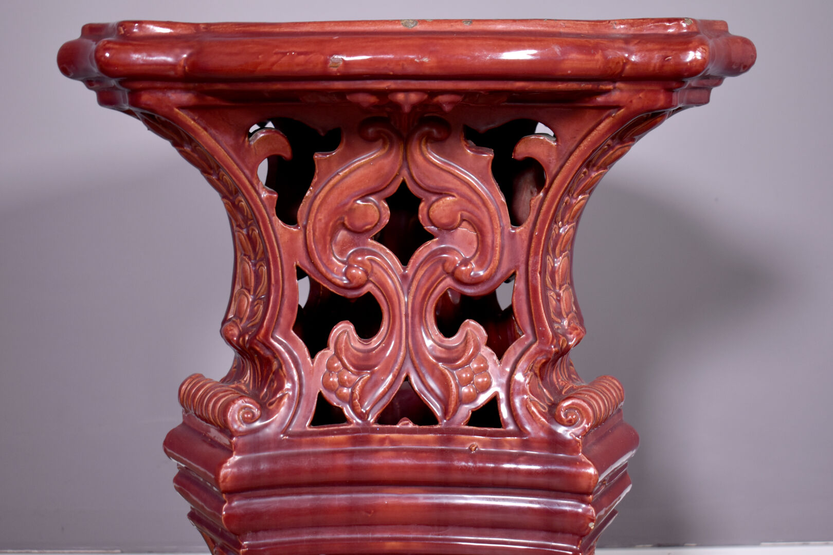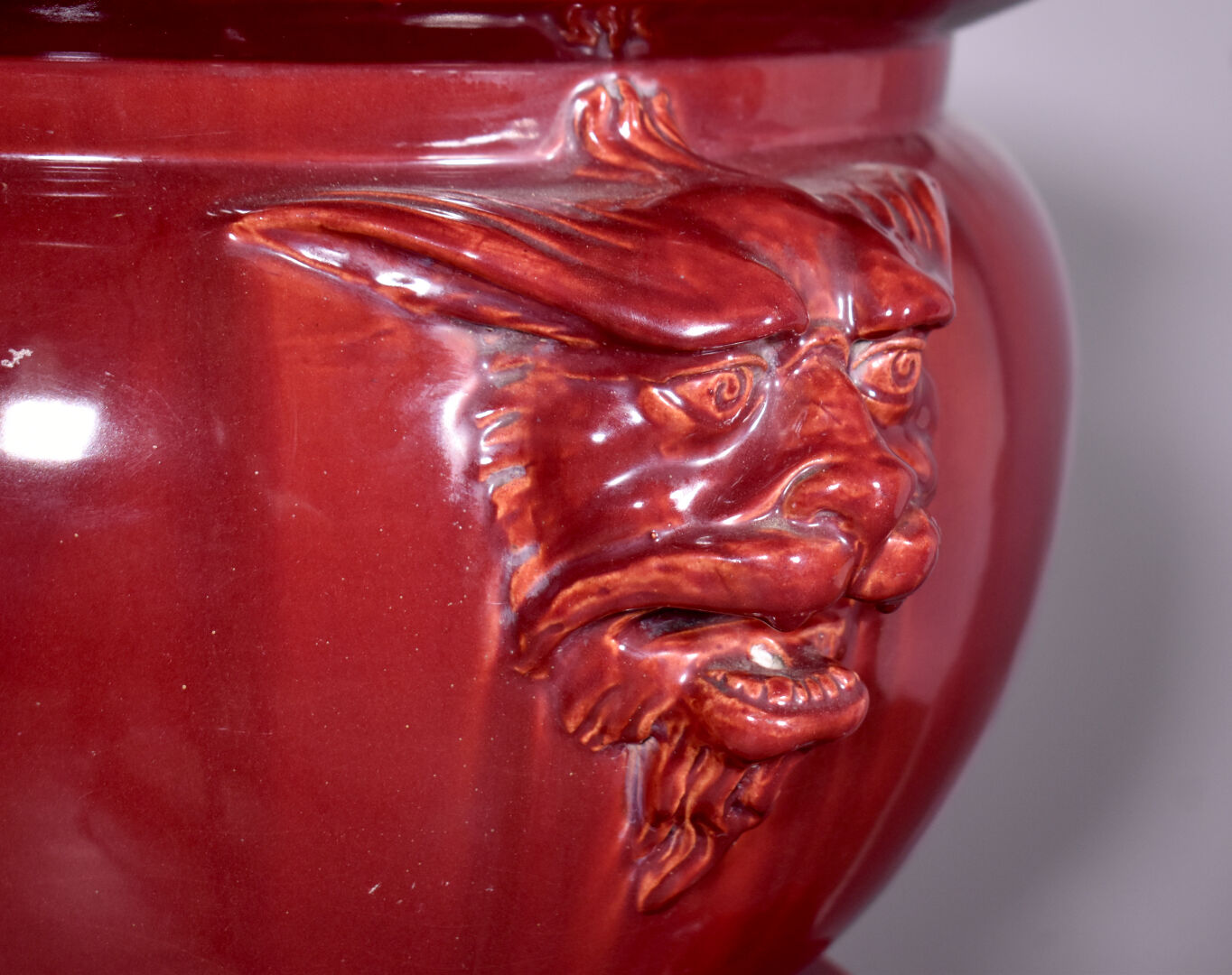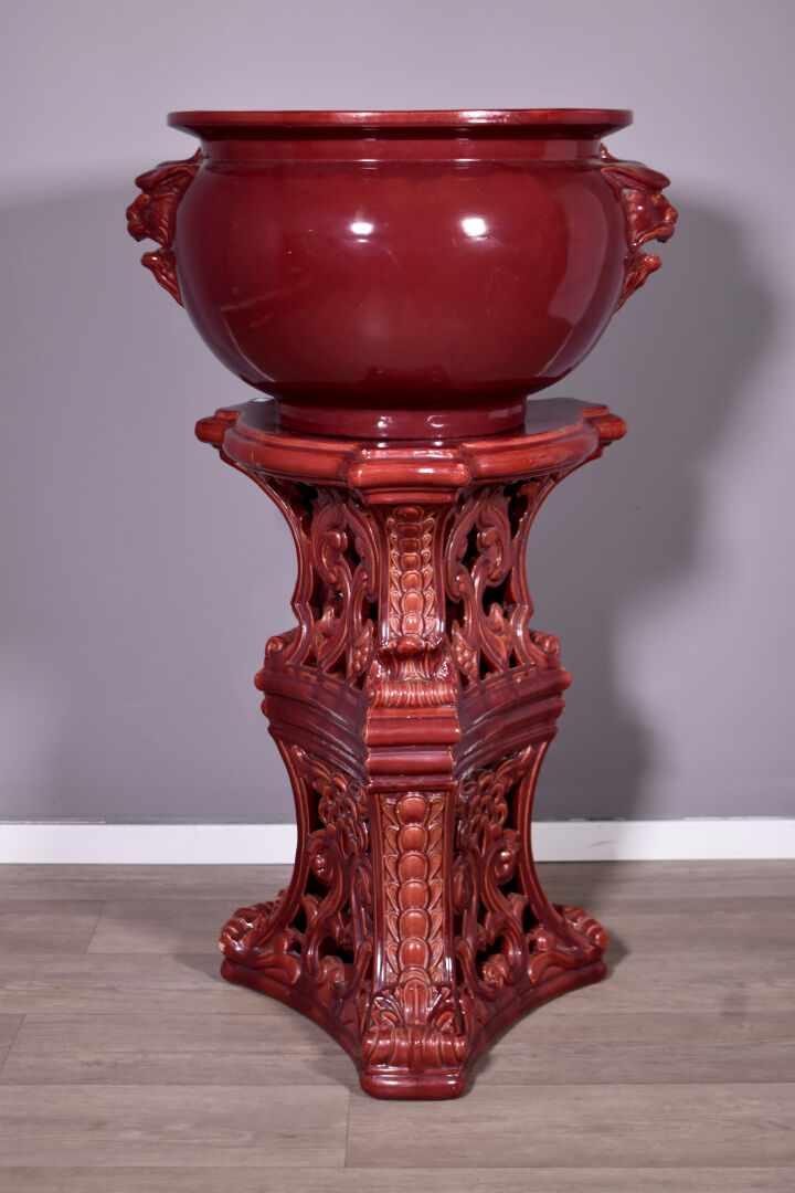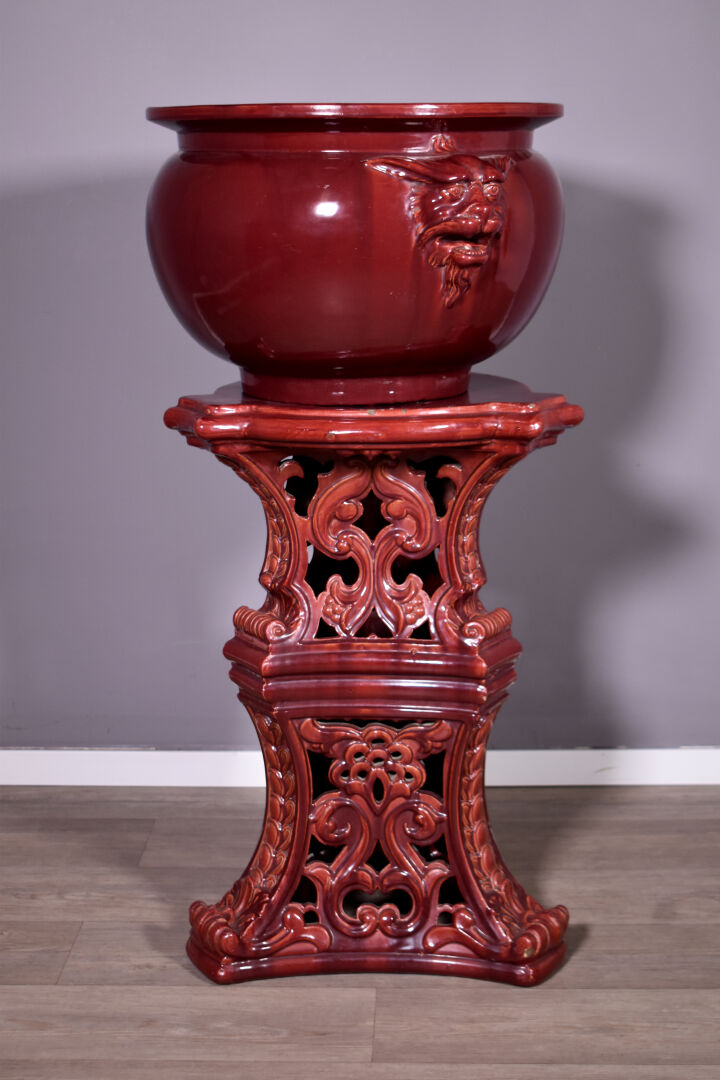 Importante jardinière en barbotine émaillée rouge sang de boeuf, les anses à mascarons de chimères, le piètement ajouré d’entrelacs d’acanthes (quelques petits éclats, une restauration à un fèle). Travail européen, vers 1900. Haut. : 111 cm.