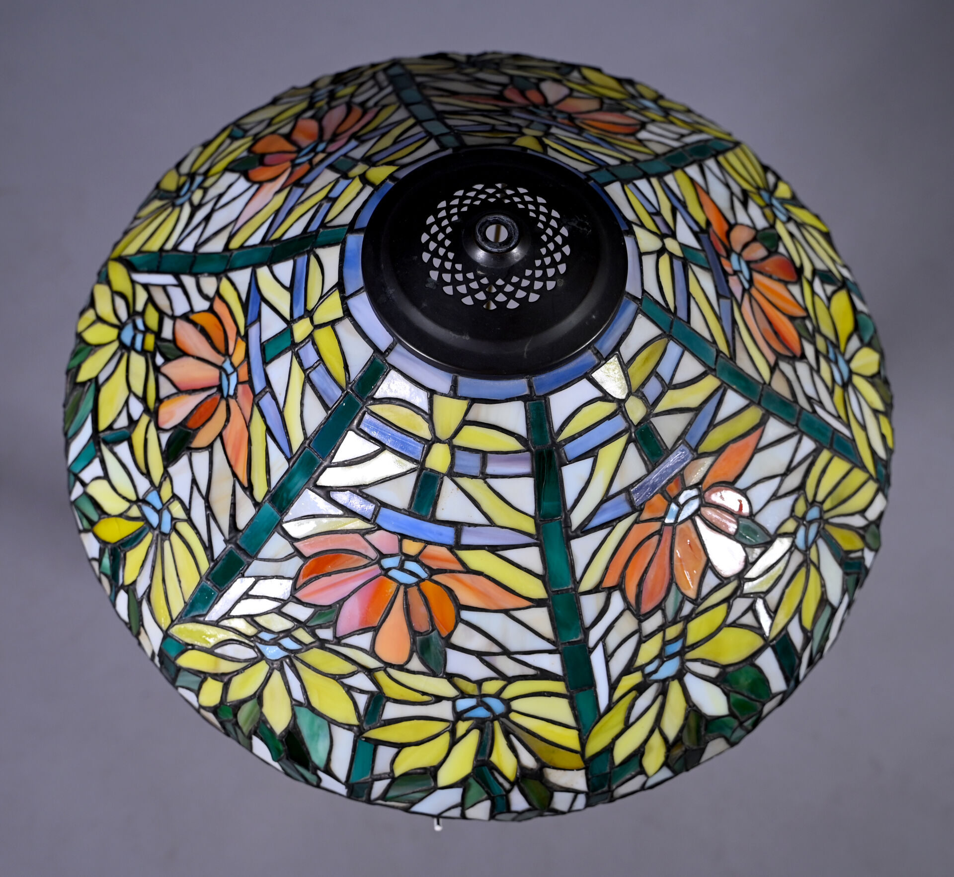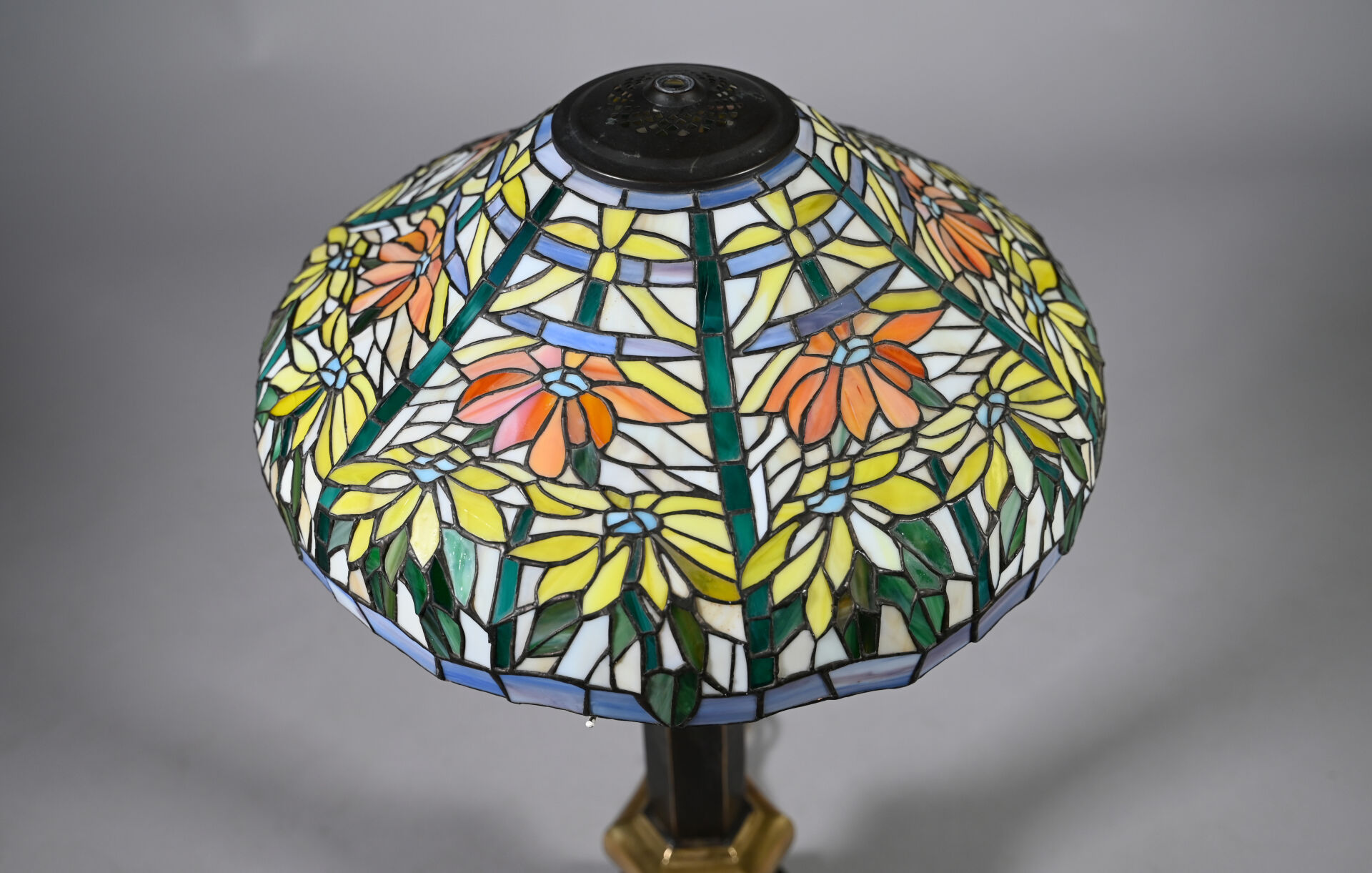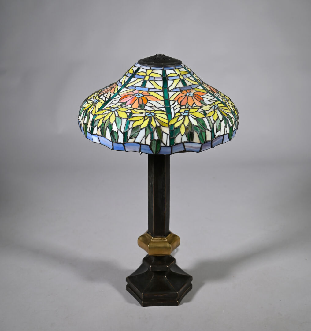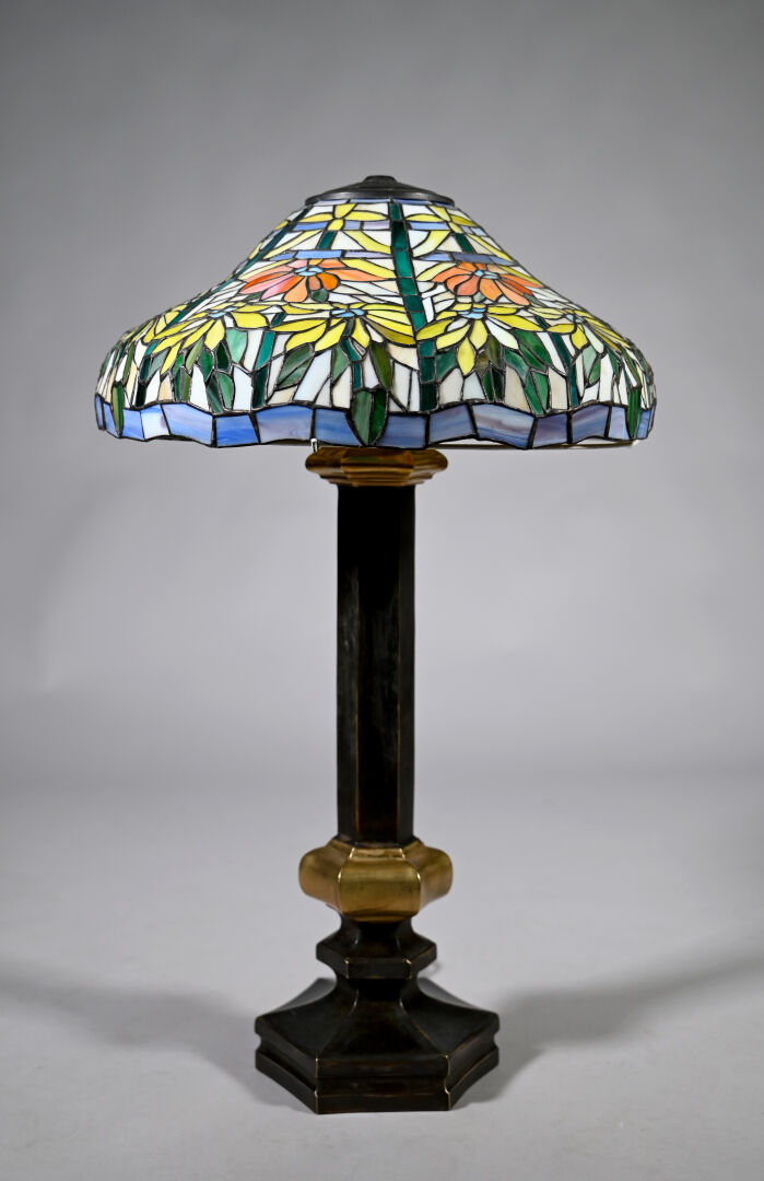 Importante lampe à poser en bronze patiné brun et doré, le fût à cotes pincées, la base hexagonale, l’abat-jour en pâte de verre travaillée à la façon d’un vitrail (un élément recollé). Dans le goût de Tiffany. XXe siècle. Haut. : 80 cm.