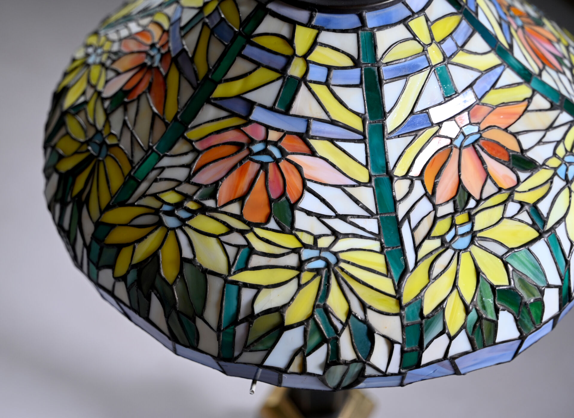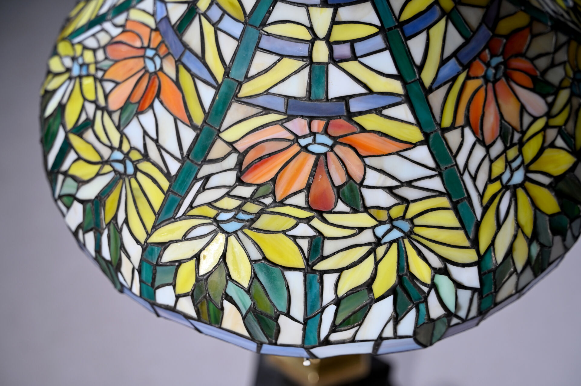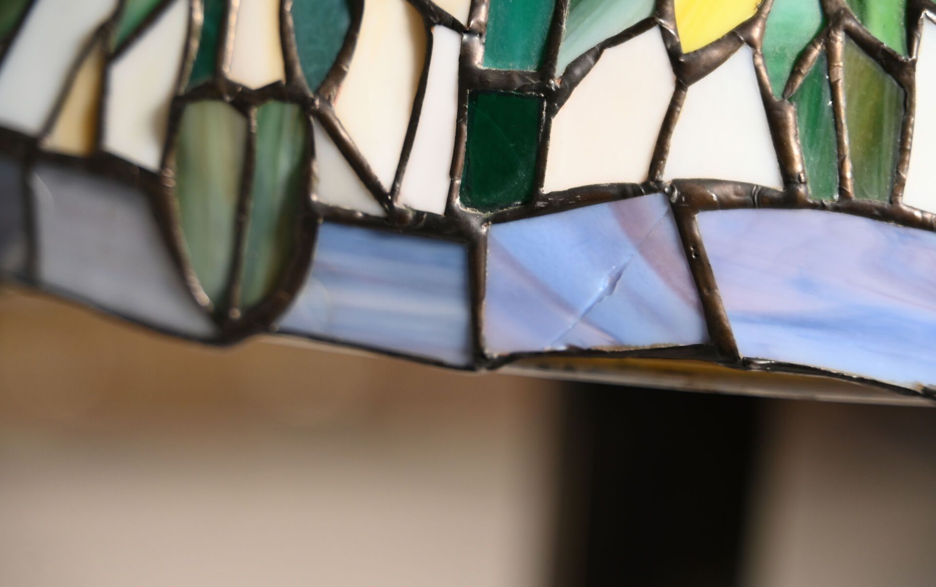 Importante lampe à poser en bronze patiné brun et doré, le fût à cotes pincées, la base hexagonale, l’abat-jour en pâte de verre travaillée à la façon d’un vitrail (un élément recollé). Dans le goût de Tiffany. XXe siècle. Haut. : 80 cm.