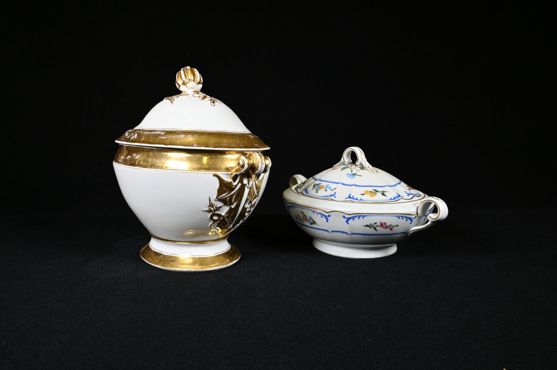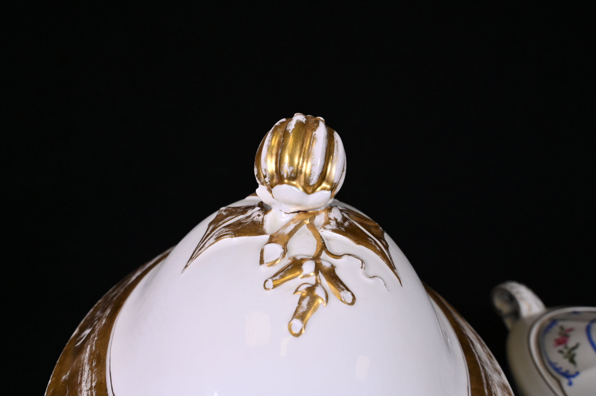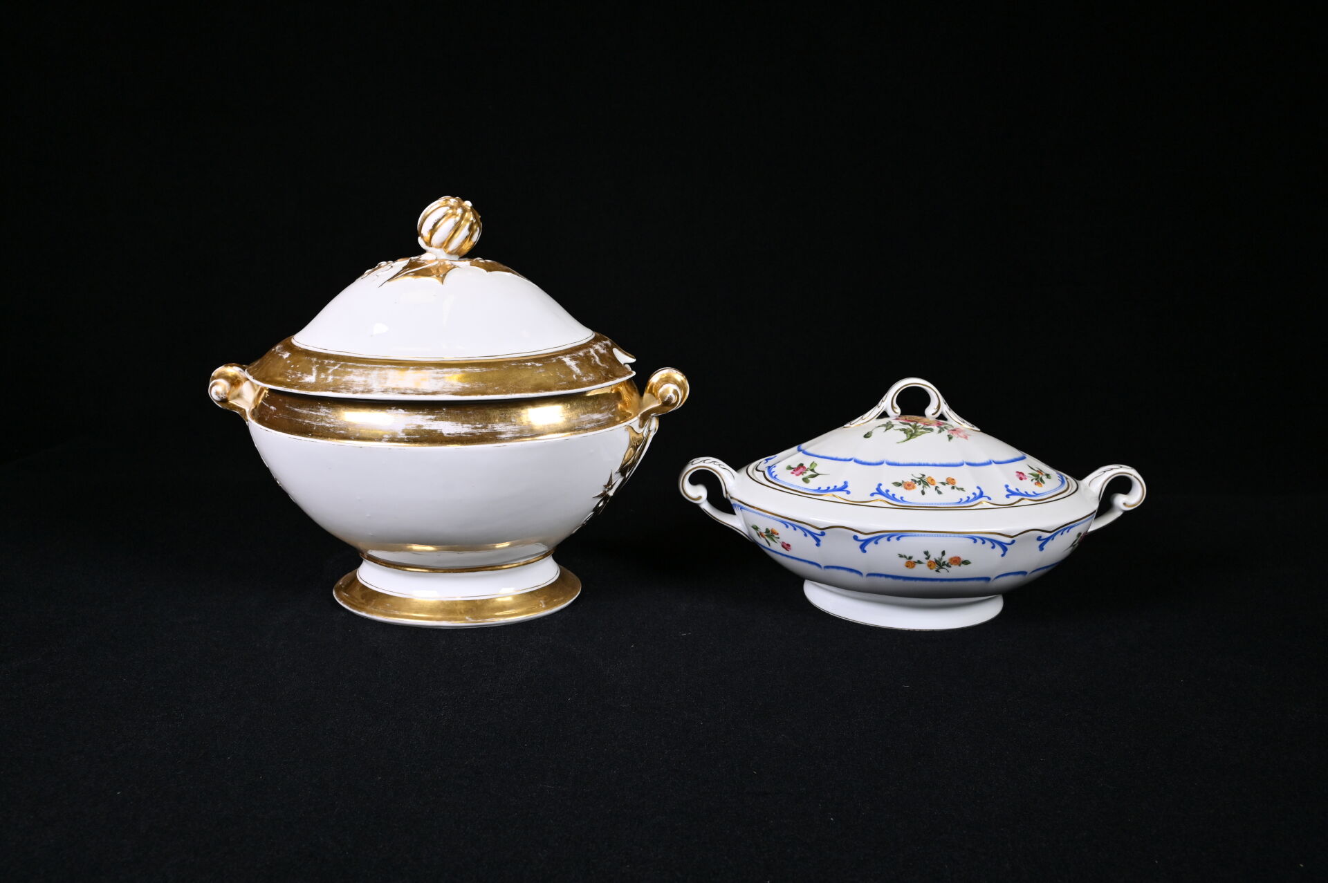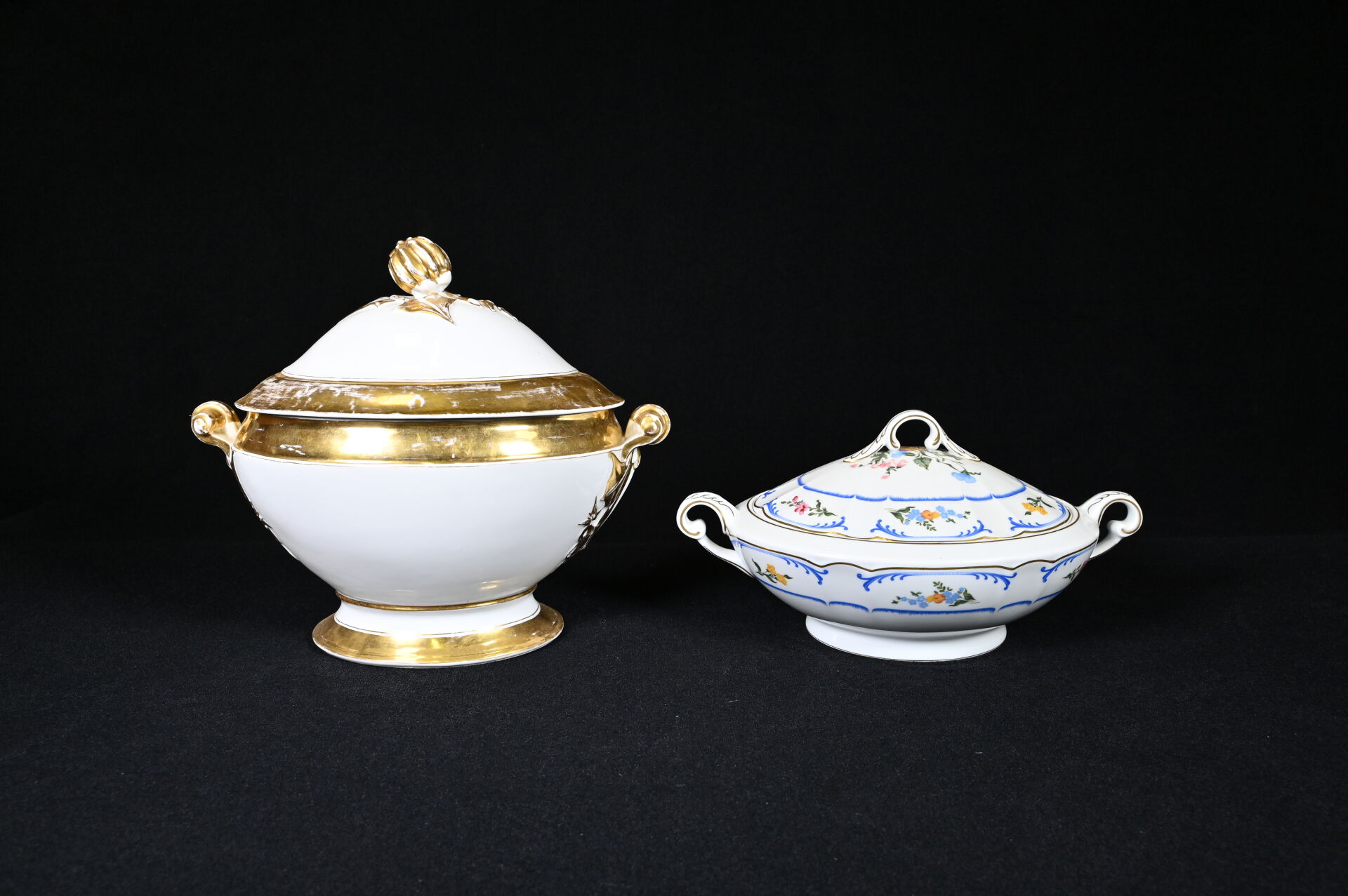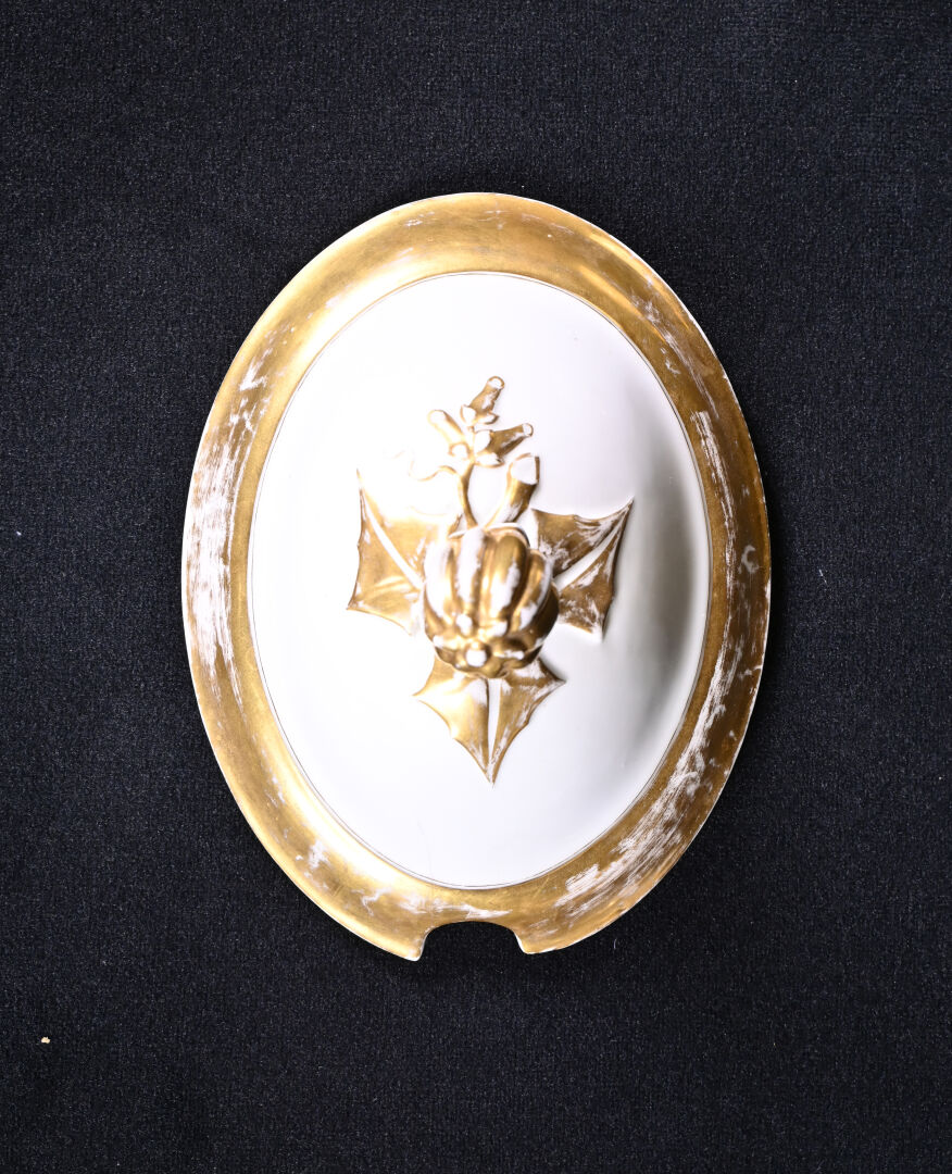 Importante soupière en porcelaine blanche et or, la prise du couvercle formée d’un fruit (un fèle de cuisson et fèle transversal). Probablement Paris, fin du XIXe siècle. Haut. : 31 cm. On joint une seconde soupière en porcelaine, moderne. CH. FIELD HAVILAND.