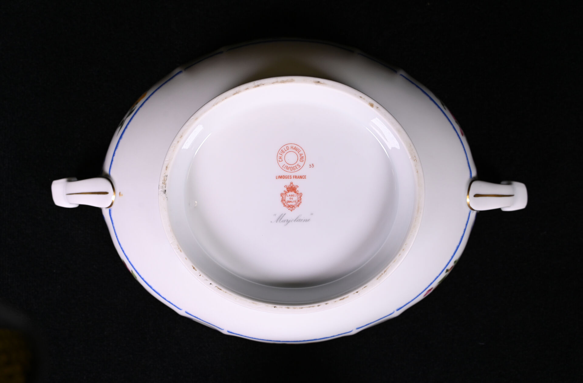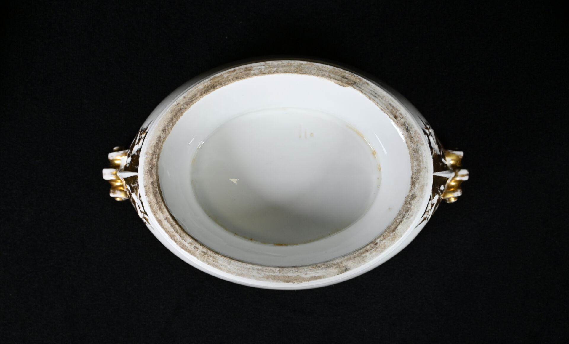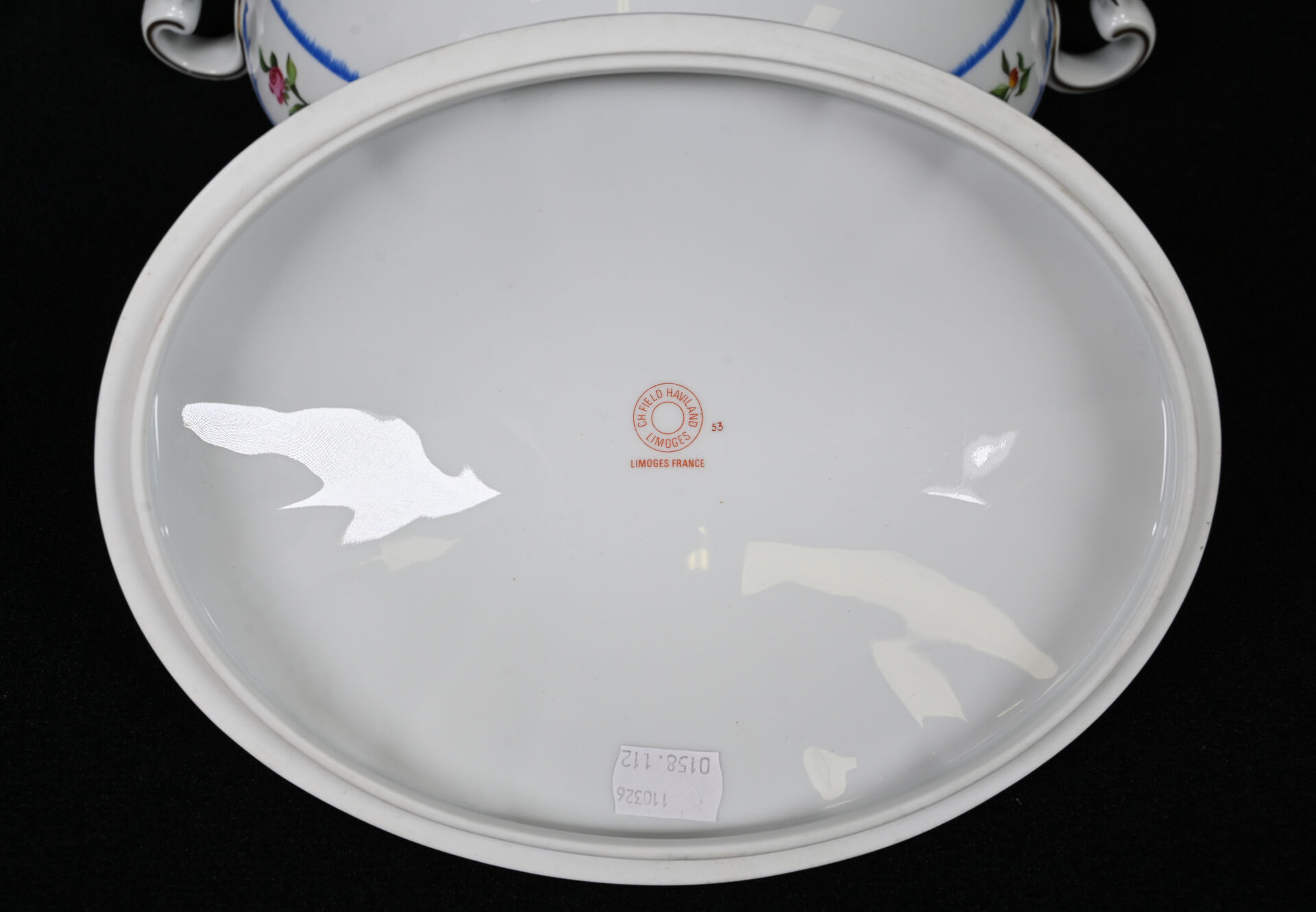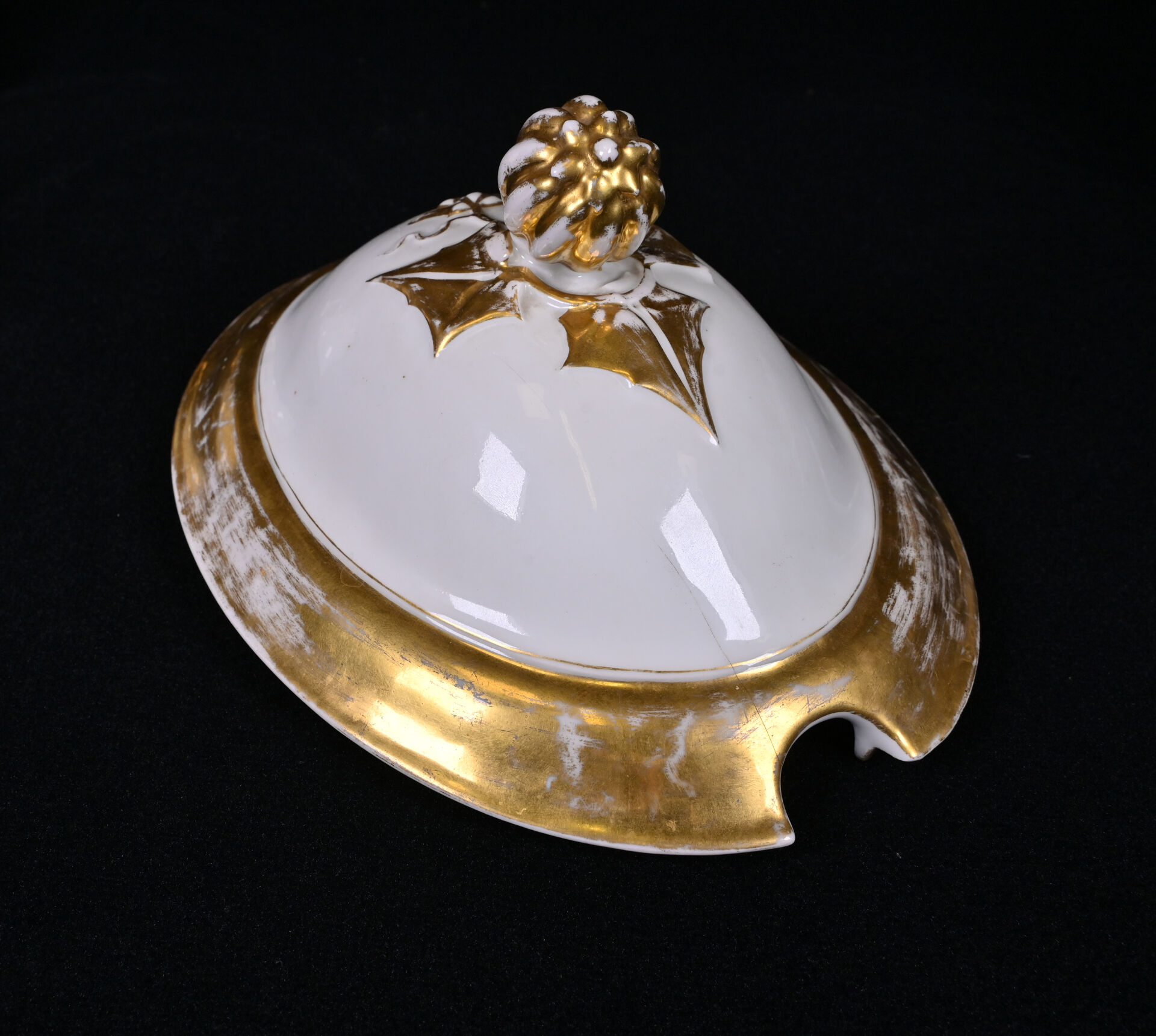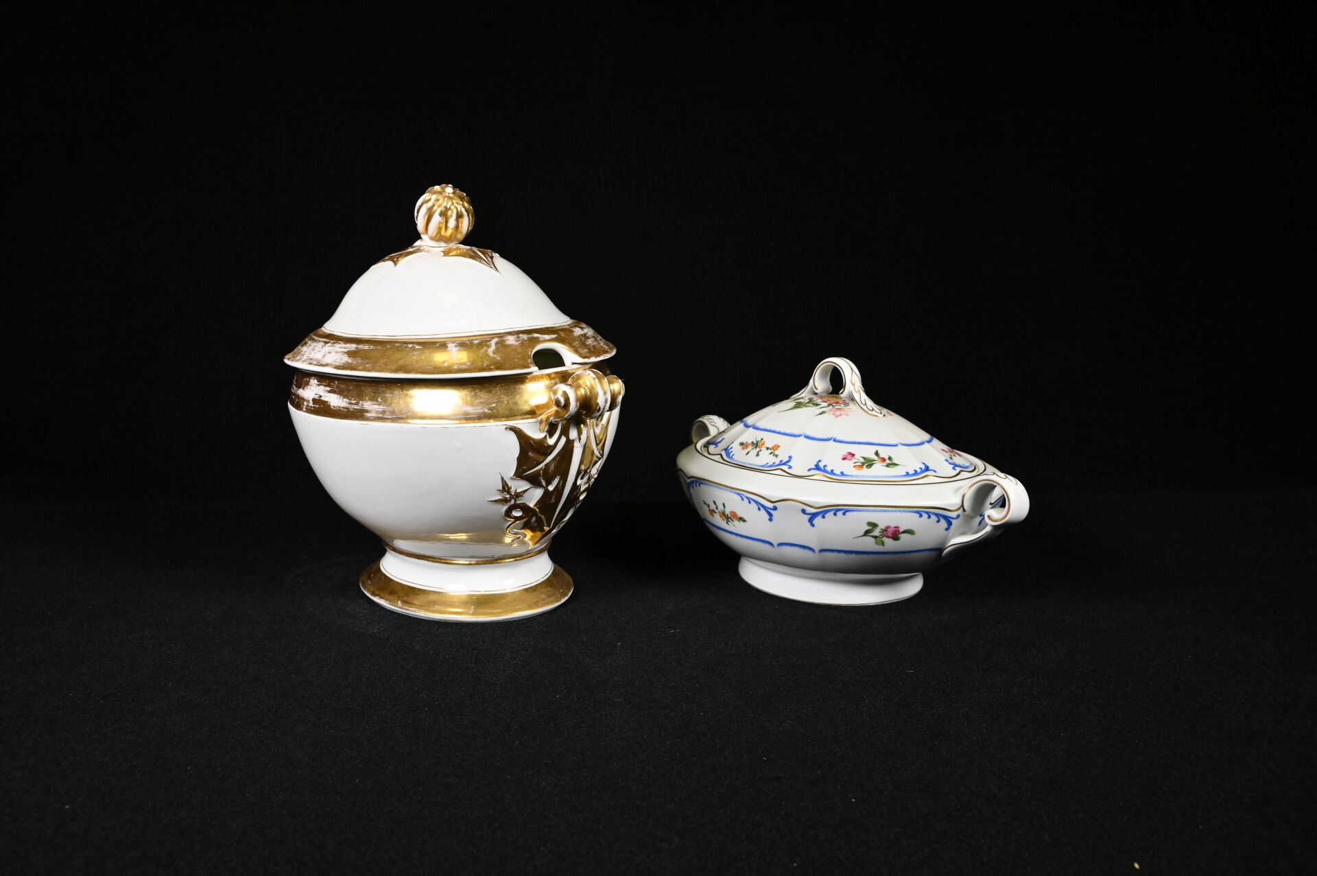 Importante soupière en porcelaine blanche et or, la prise du couvercle formée d’un fruit (un fèle de cuisson et fèle transversal). Probablement Paris, fin du XIXe siècle. Haut. : 31 cm. On joint une seconde soupière en porcelaine, moderne. CH. FIELD HAVILAND.