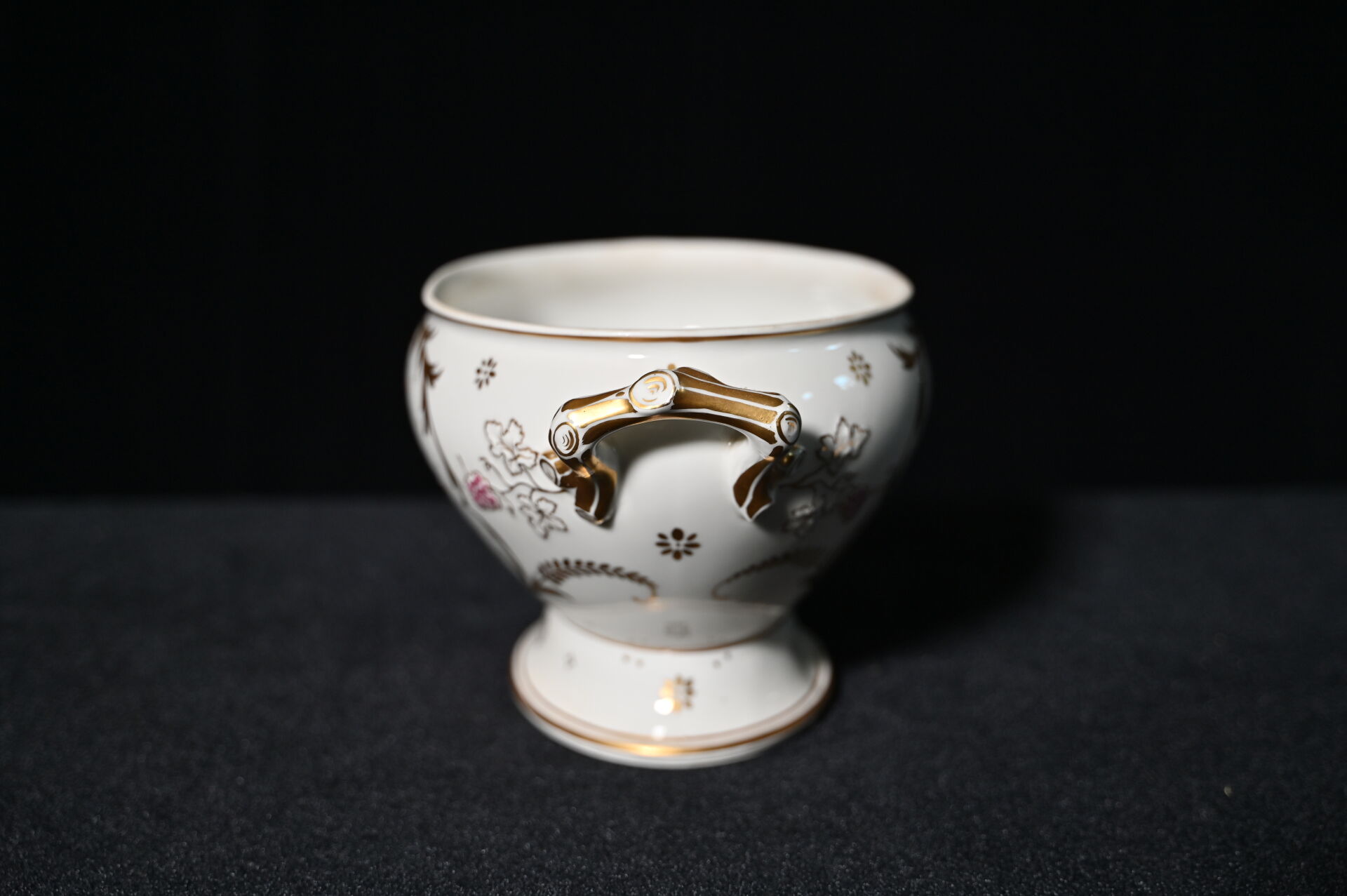Importante soupière et son plateau en porcelaine blanche à décor en polychromie de fleurs et dorure, les anses et la prise du couvercle en forme de branches (quelques usures à la dorure). Limoges ou Paris ? Début du XXe siècle. Haut. totale : 31 cm.