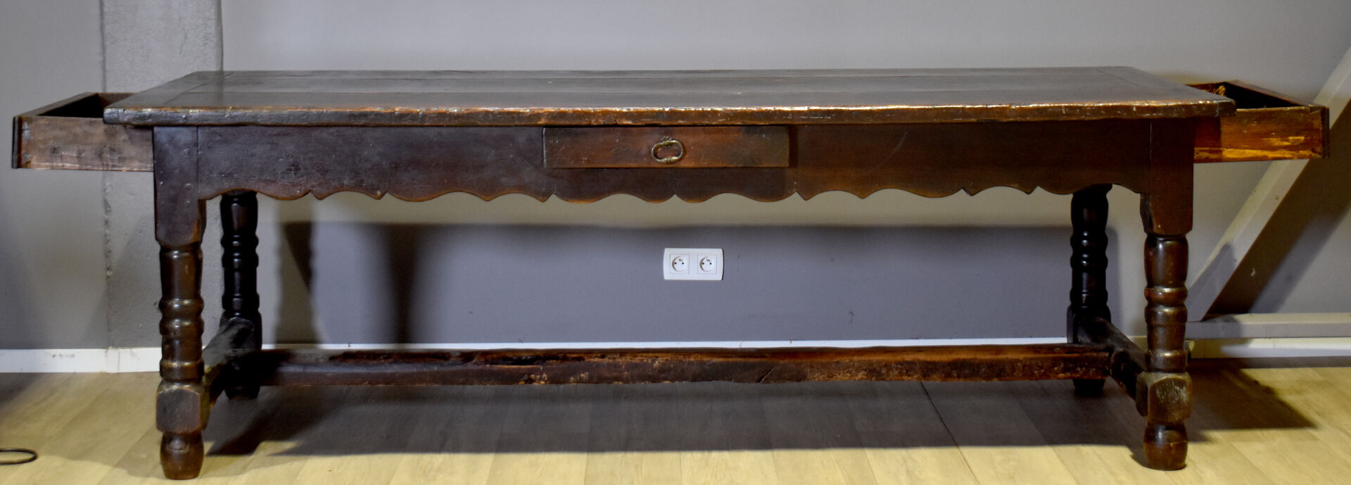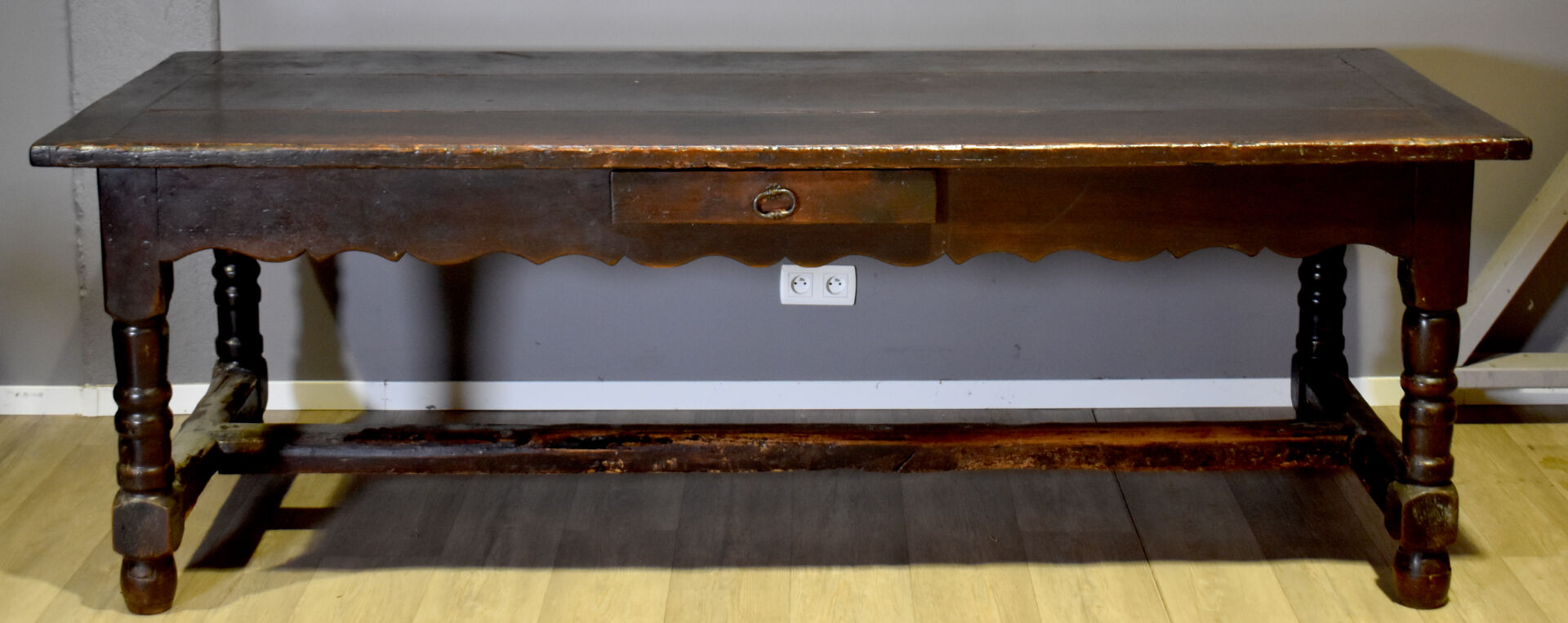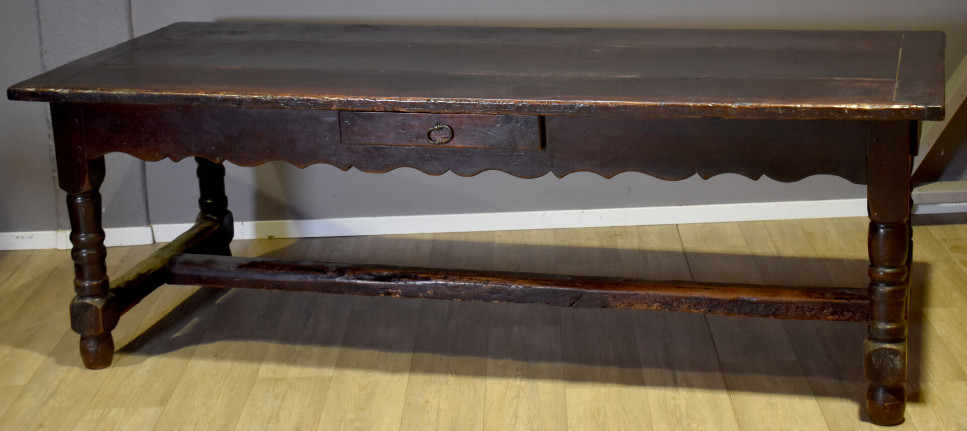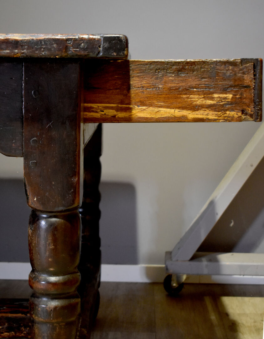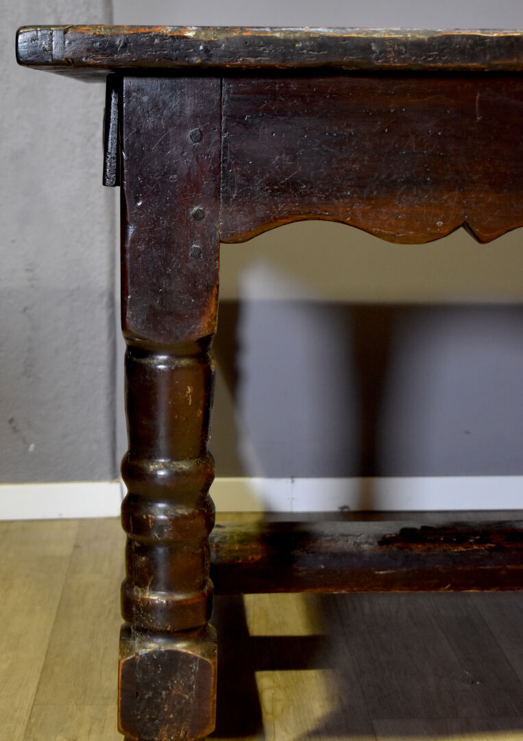 Importante table de monastère en chêne à ceinture violonée ouvrant par trois tiroirs et reposant sur quatre pieds tournés réunis par une entretoise en H. En partie du XVIIIe siècle. Haut. : 78 cm – Larg. : 230 cm – Prof. : 95 cm.
