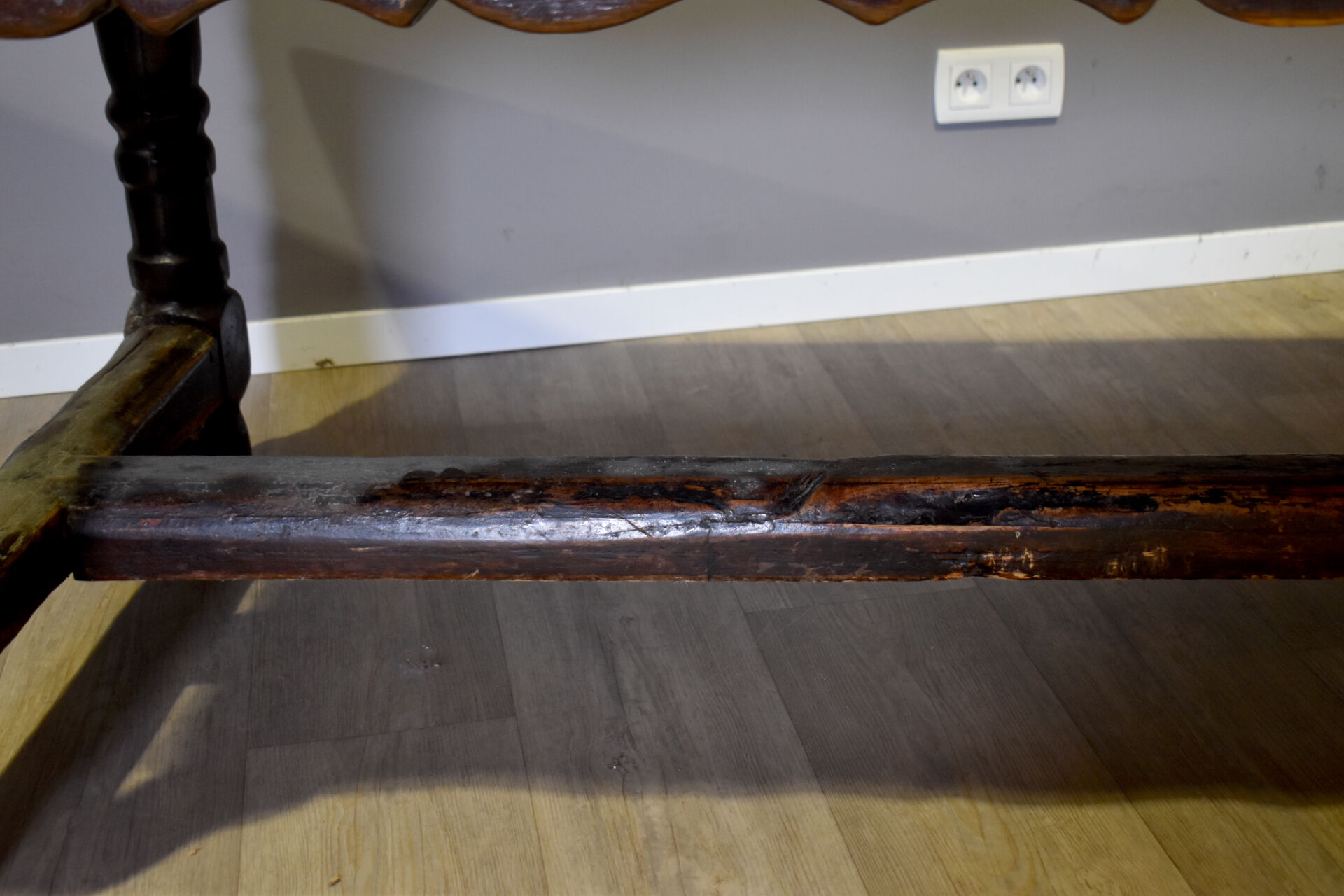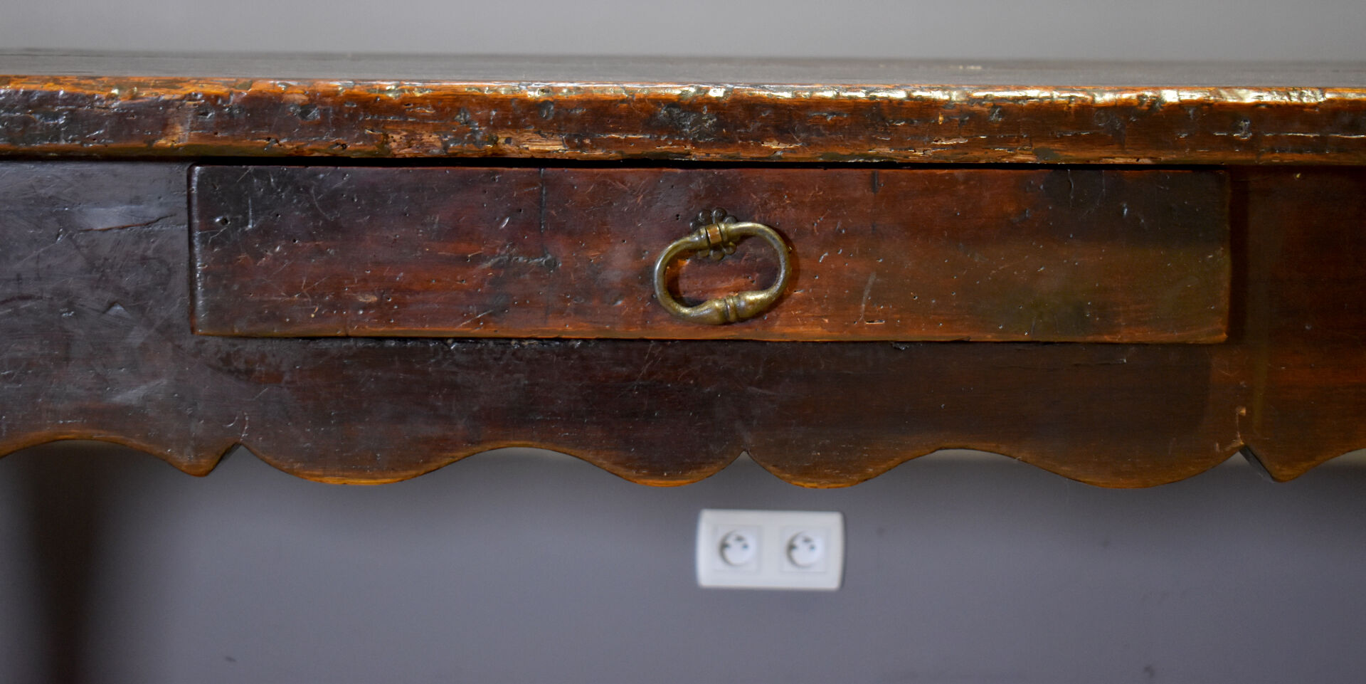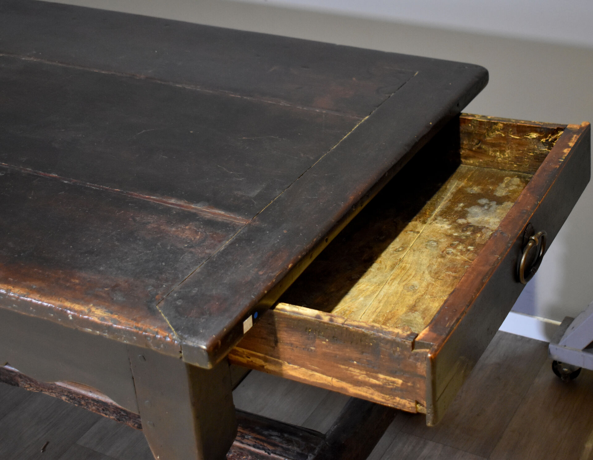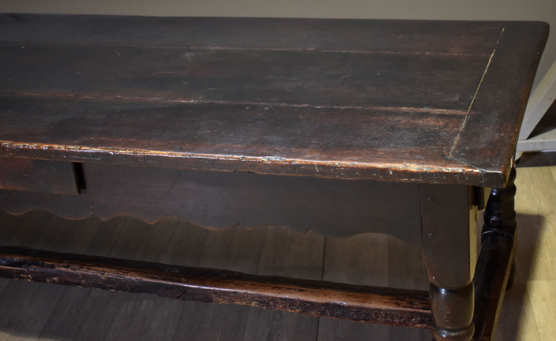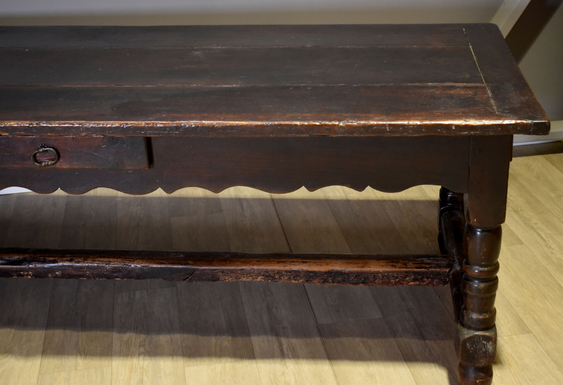 Importante table de monastère en chêne à ceinture violonée ouvrant par trois tiroirs et reposant sur quatre pieds tournés réunis par une entretoise en H. En partie du XVIIIe siècle. Haut. : 78 cm – Larg. : 230 cm – Prof. : 95 cm.