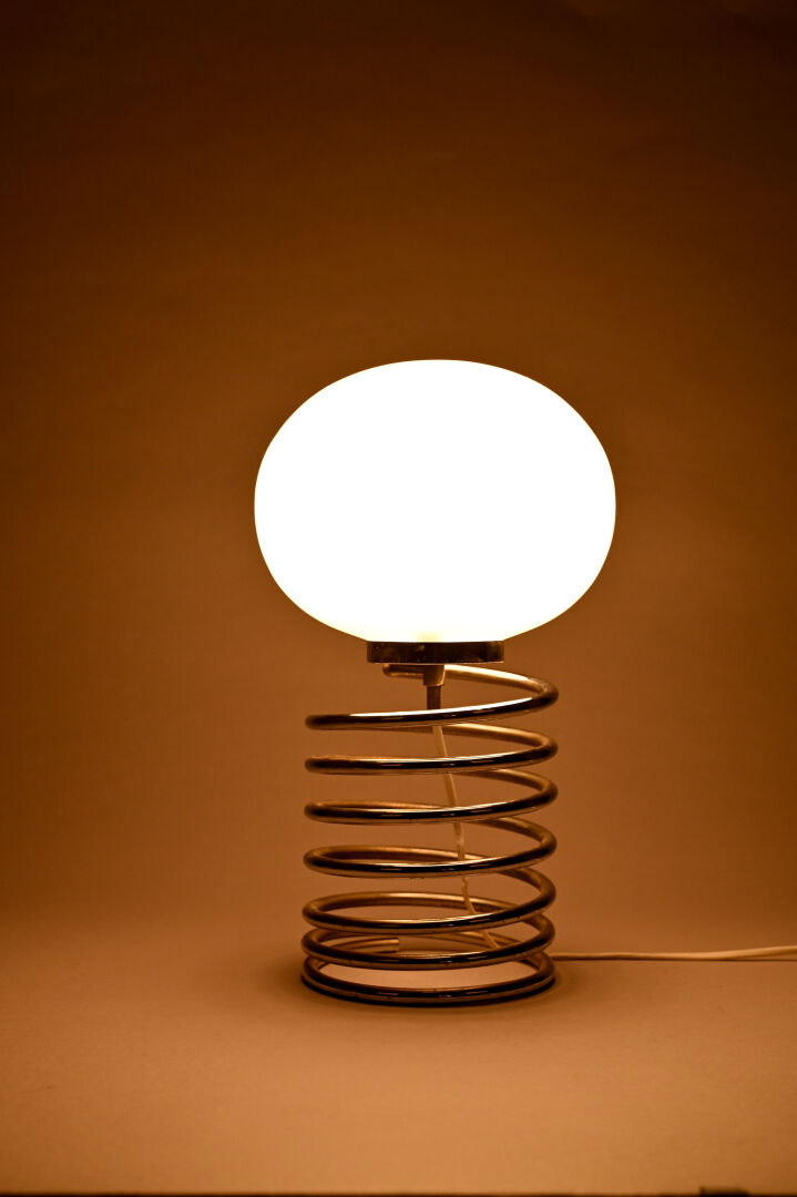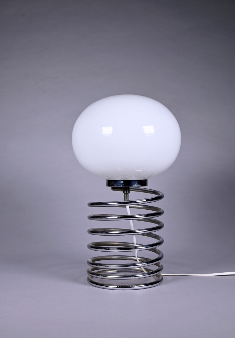 Ingo MAURER (Né en 1932). Lampe à poser modèle ressort en métal tubulaire chromé. Globe de verre. Haut. : 40 cm.