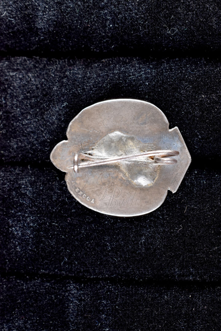 Insigne en argent italien de mutilé de guerre Première Guerre Mondiale, globe entouré de feuilles de chêne et de laurier surmontant une croix de Savoie couronnée et surmontée d’une étoile. Épingle ressoudée en acier. État 1-. Poids brut : 0,16g.