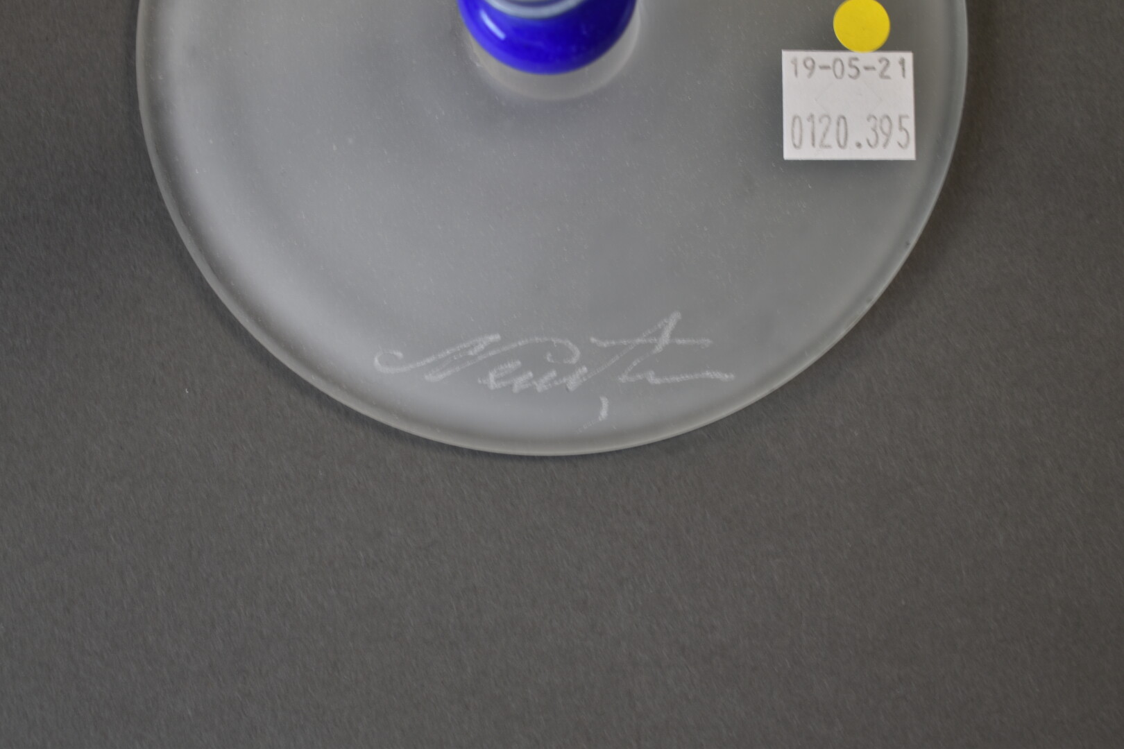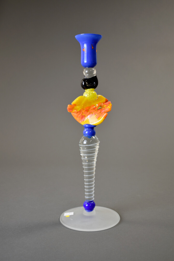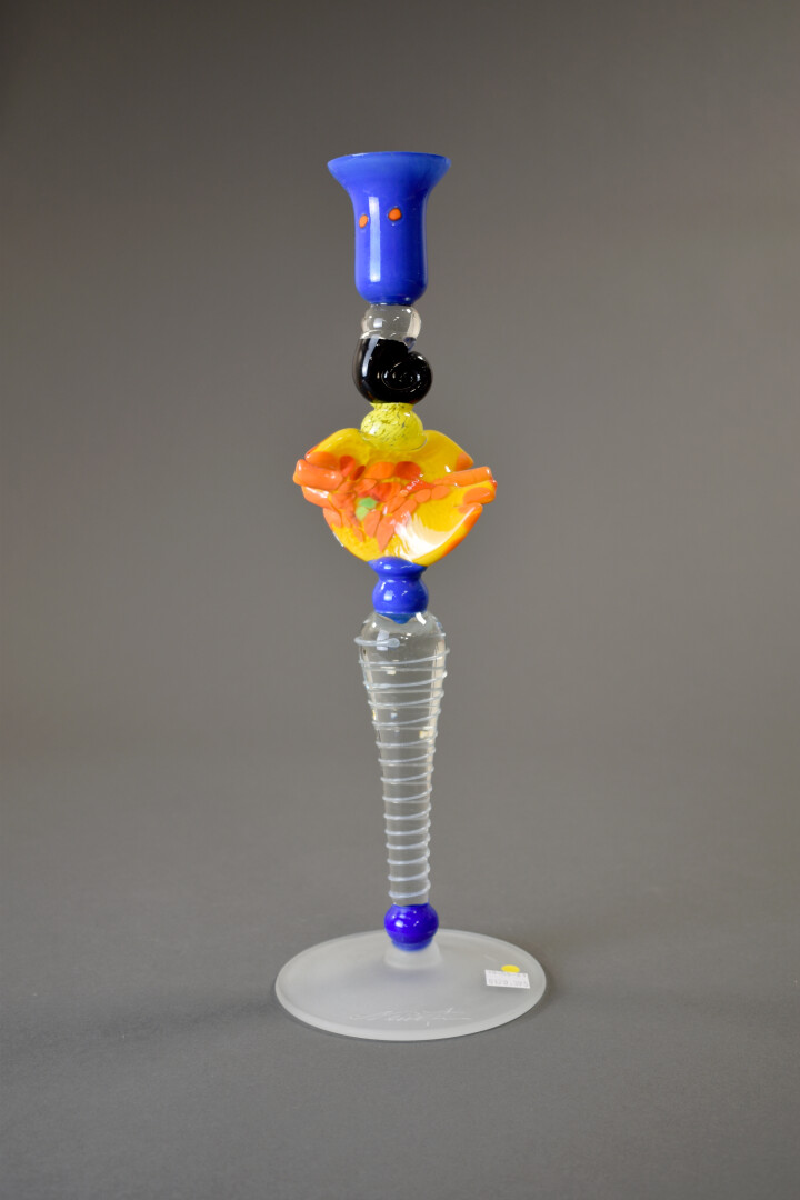 IOAN NEMTOI. Chandelier en verre orange, bleu et dépoli. Le fût balustre, la base circulaire. Signé. Haut. : 38 cm.