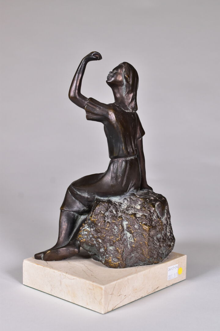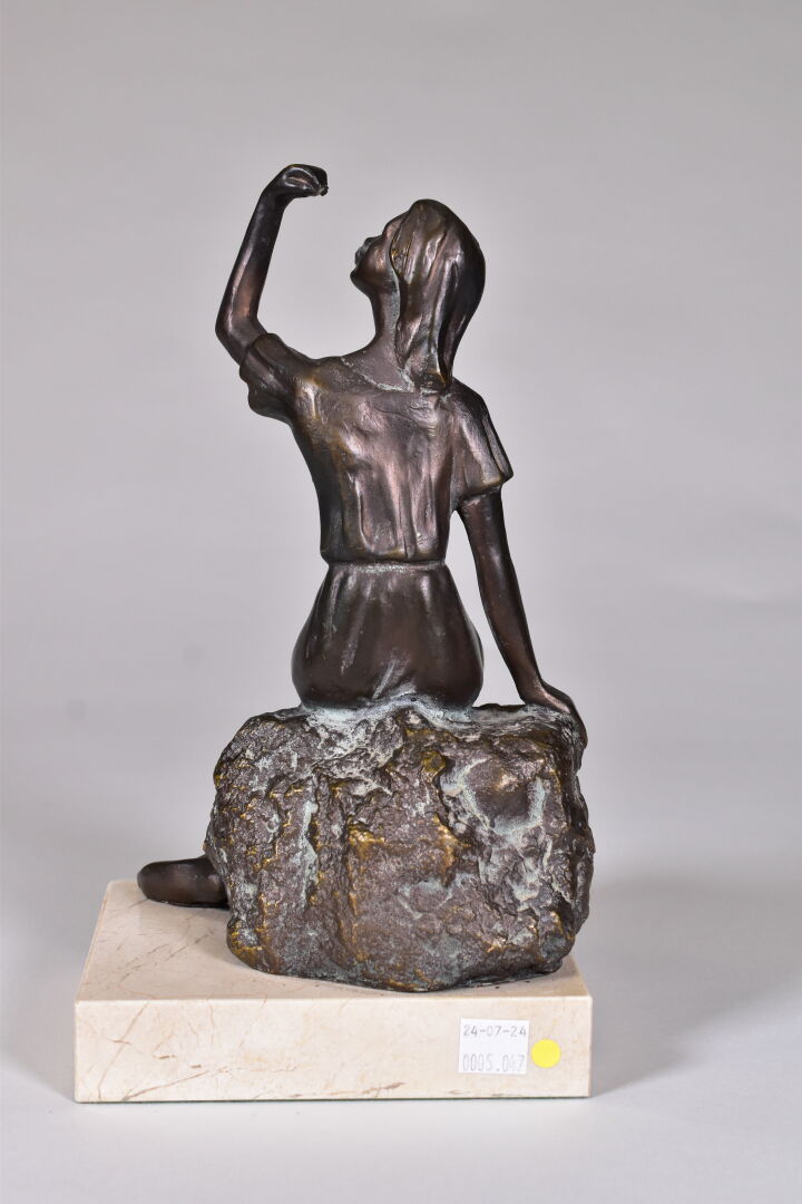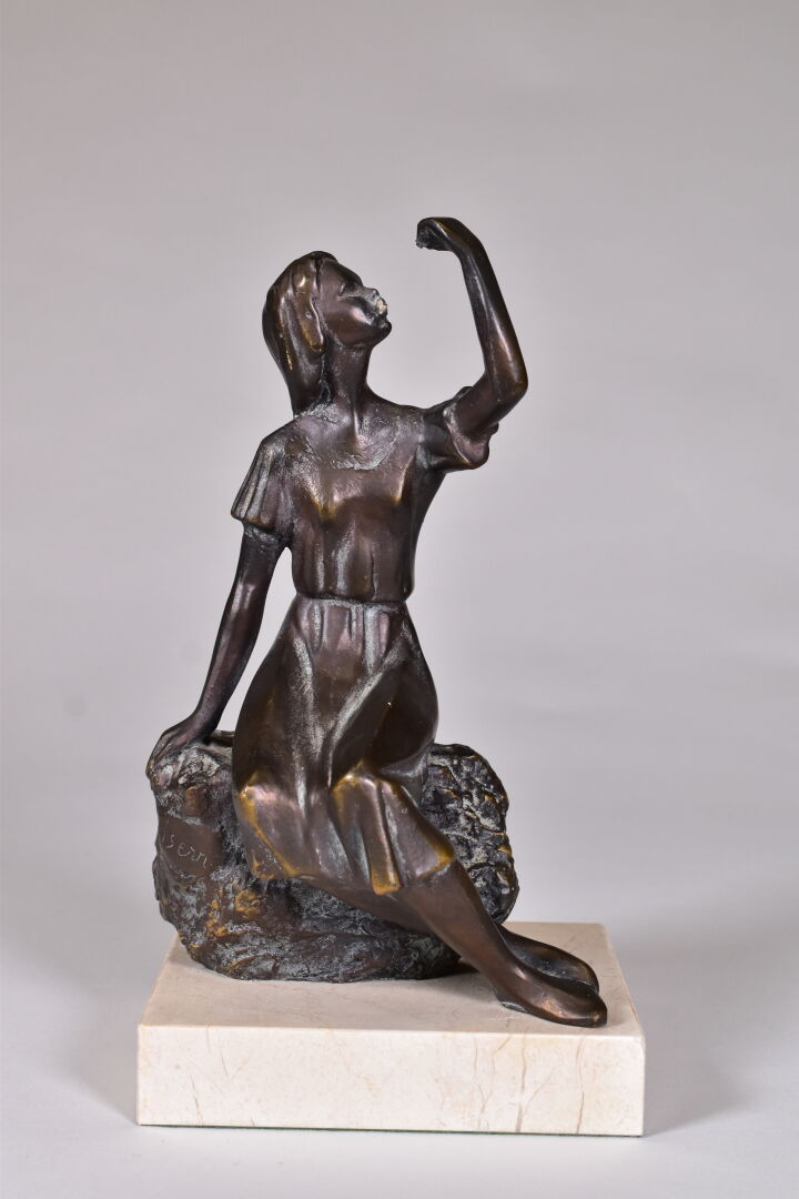 ISERN ? (XXe siècle). Sculpture en métal patiné brun représentant une femme assise sur un rocher. Signé à la base. Socle de marbre blanc. Haut. : 28 cm.