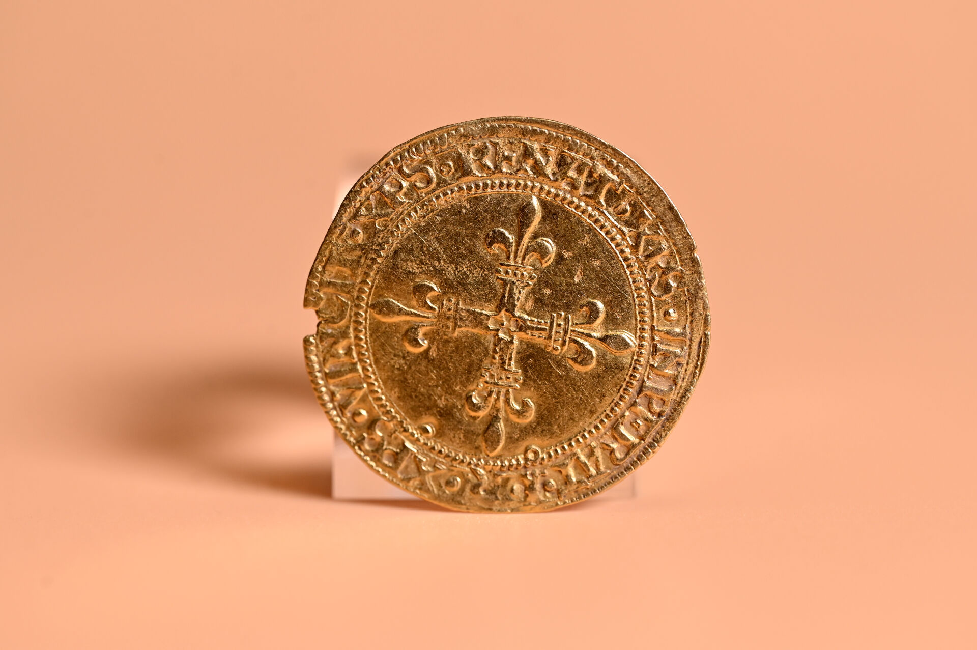 ISSUE D’UN TRÉSOR. FRANCOIS Ier (1515-1547). Ecu d’or au soleil du Dauphiné. 1er t. Romans. (Dy. 782). 3,38 g. Petit manque de métal, légère trace de pli, très légères traces sur la tranche sinon Très Beau. Expert : Cabinet Bourgey – Tél : 01 47 70 35 18