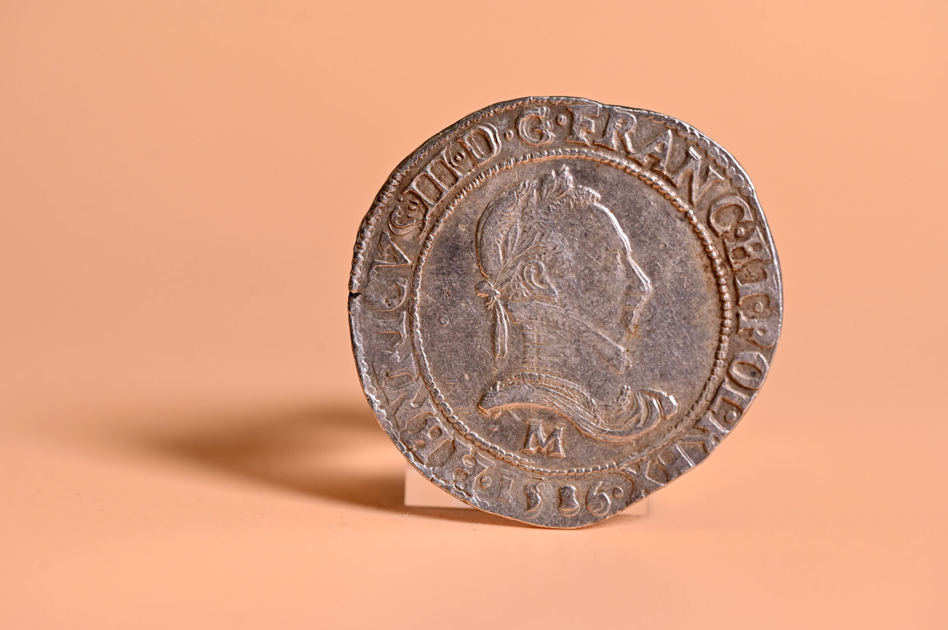 ISSUE D’UN TRÉSOR. HENRI III (1574-1589). Franc d’argent au col plat. Toulouse. 1586. (Dy. 1130). 13,98 g. Très légère encoche sur la tranche sinon Très Beau. Flan large. Expert : Cabinet Bourgey – Tél : 01 47 70 35 18