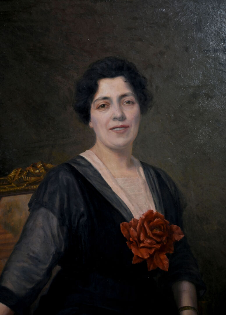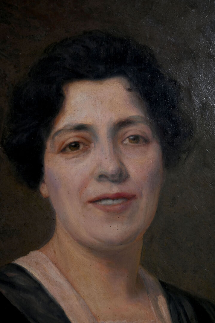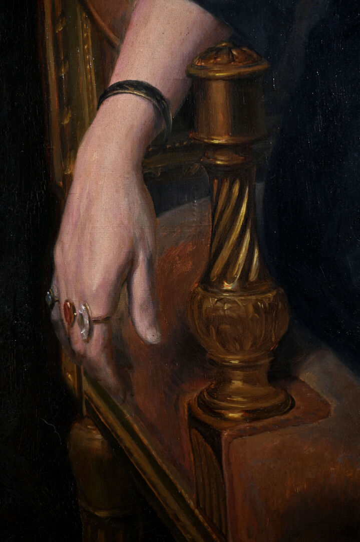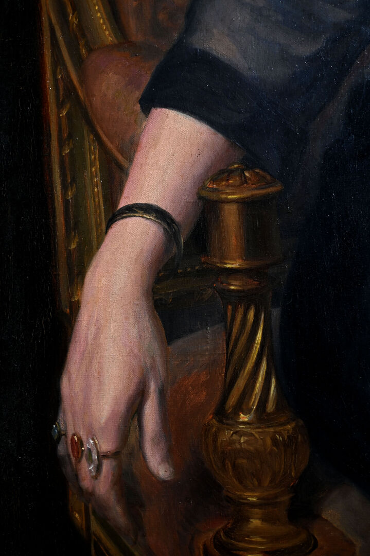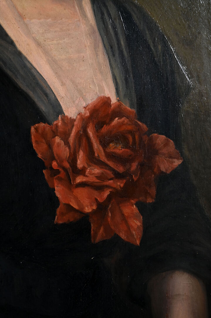 J. Edward LACOSTE (XIXe-XXe siècle). Portrait de femme en noir. Huile sur toile signée en bas à gauche (repeints). 121 x 91 cm.