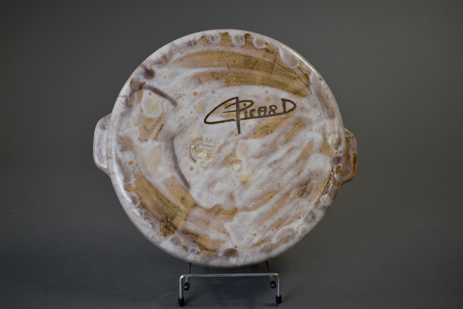 J.G PICARD. Plateau circulaire en céramique émaillé d’un soleil en orange et ocre sur fond crème. Signé sous la base. Diam.: 28 cm.