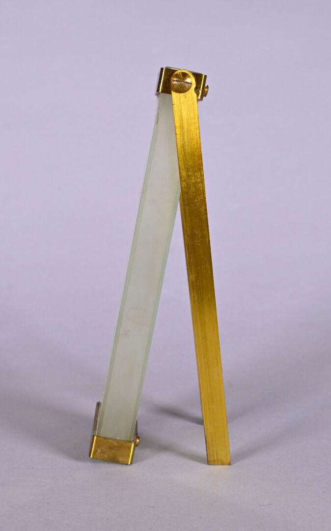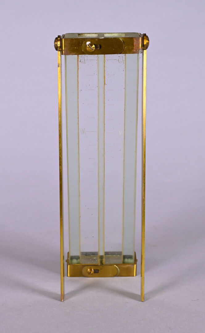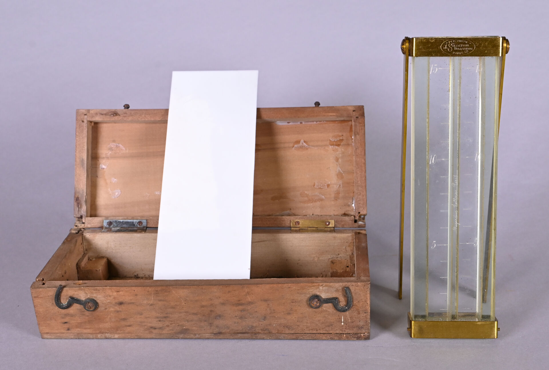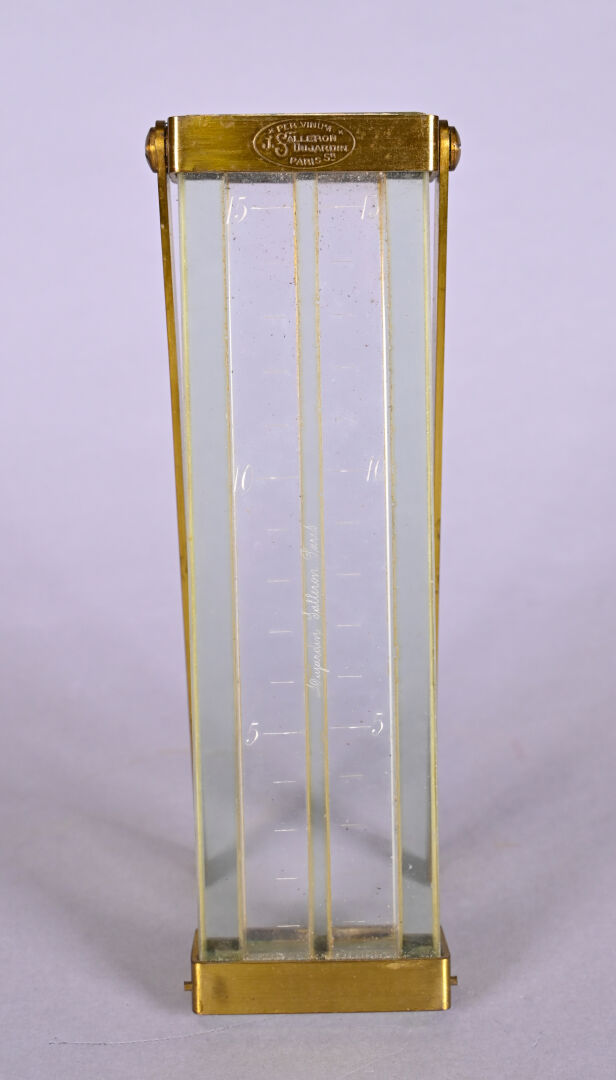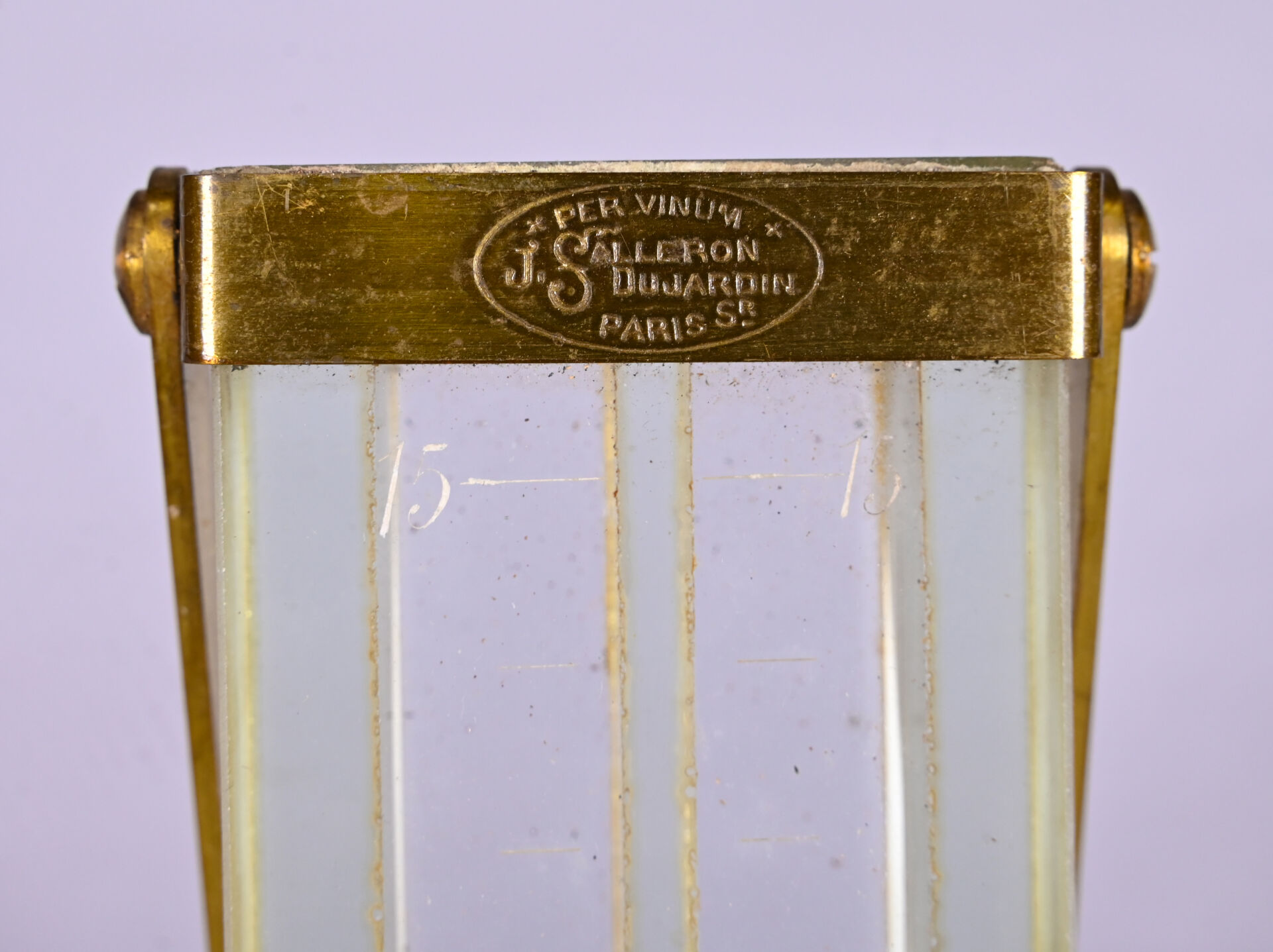 J. SALLERON-DUJARDIN. Niveau à bulle d’œnologie en laiton et verre, avec une plaque d’opaline blanche. Dans son coffret. Cachet du fabricant.