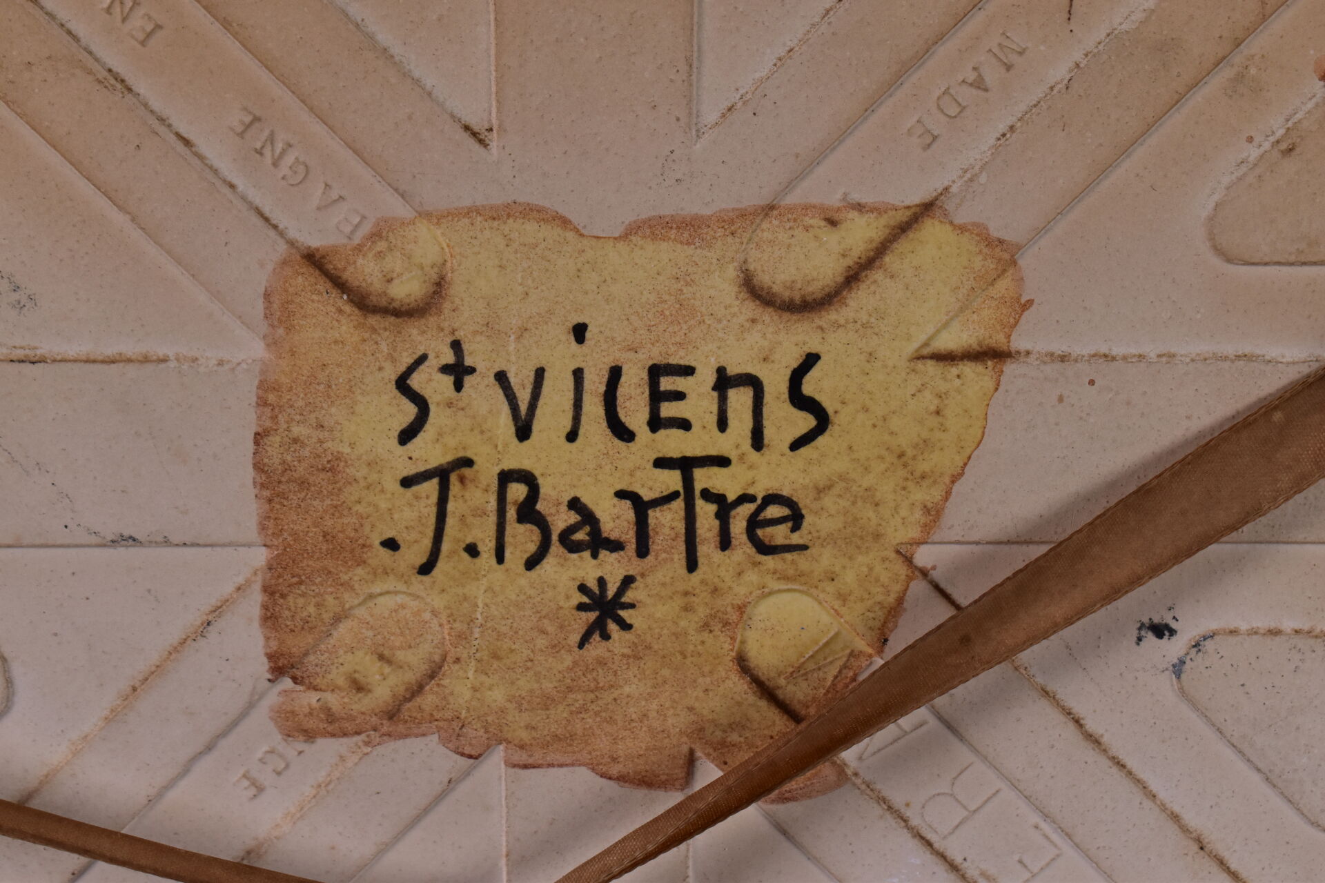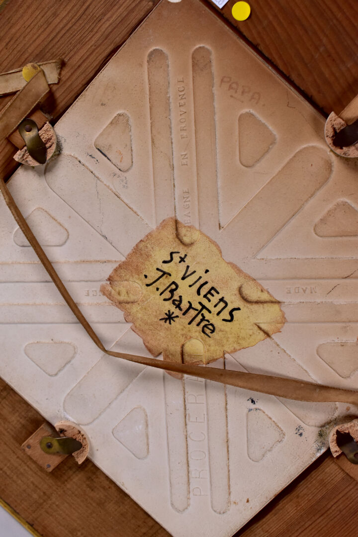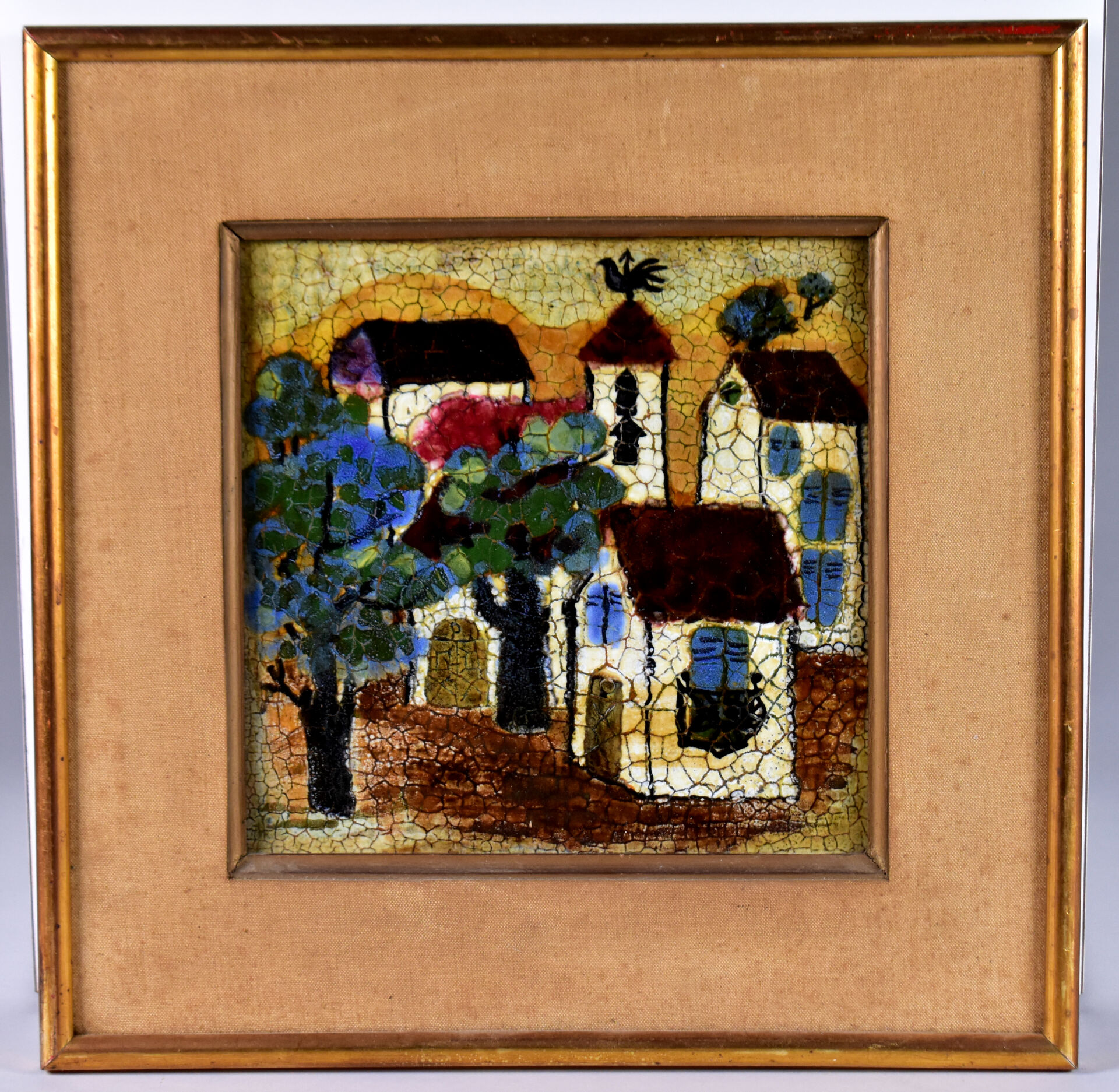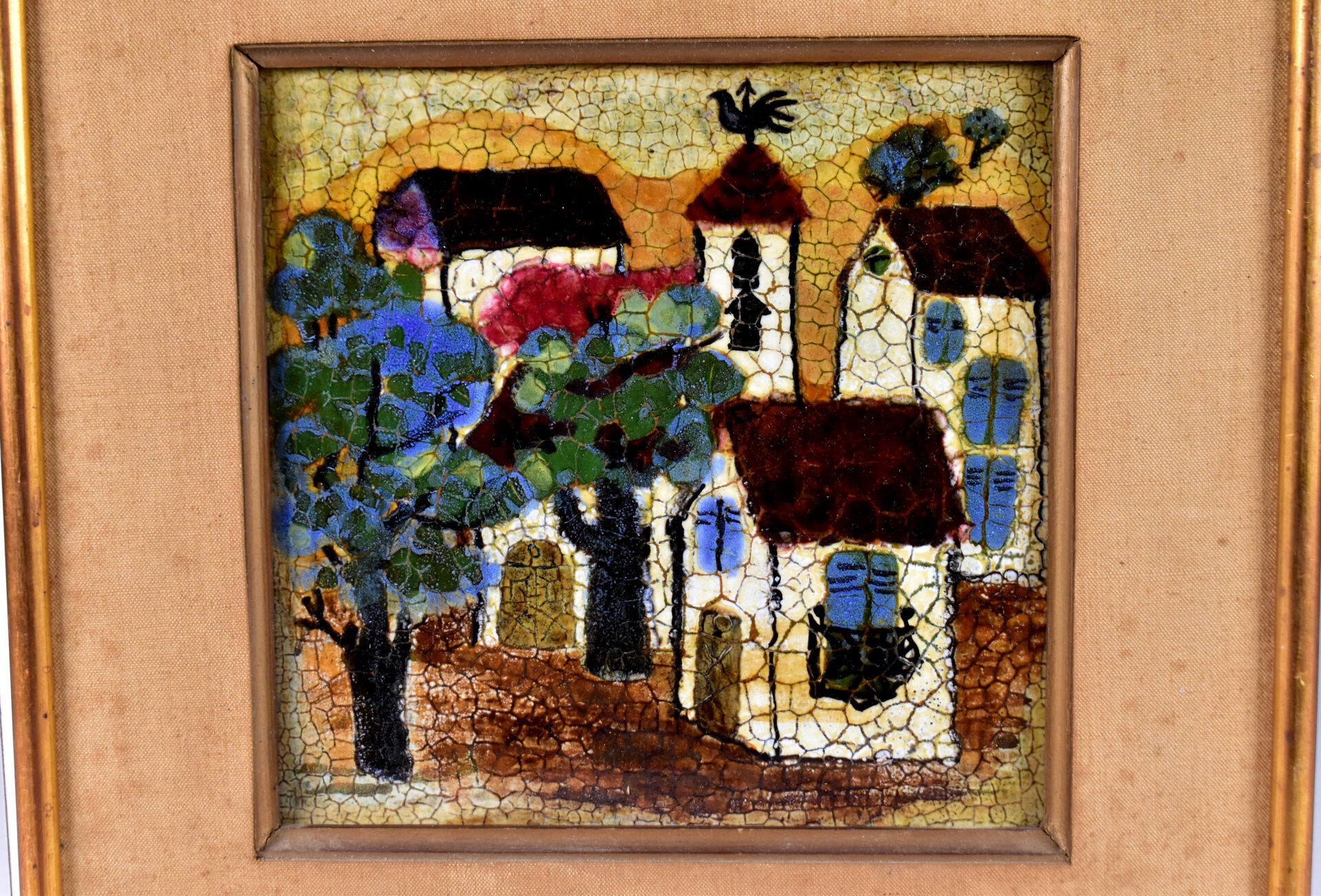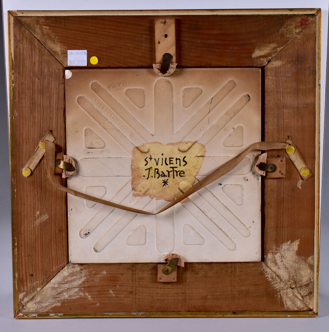 Jacqueline BARTRE à SANT VICENS. Carreau de céramique émaillé représentant un paysage au clocher, signé et situé au dos. 20,5 x 20,5 cm.
