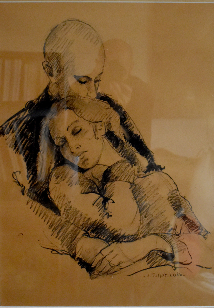 Jacqueline TOLLET-LOEB (Née en 1931). Etreinte. Dessin au fusain signé en bas à droite. 67 x 48 cm à vue.