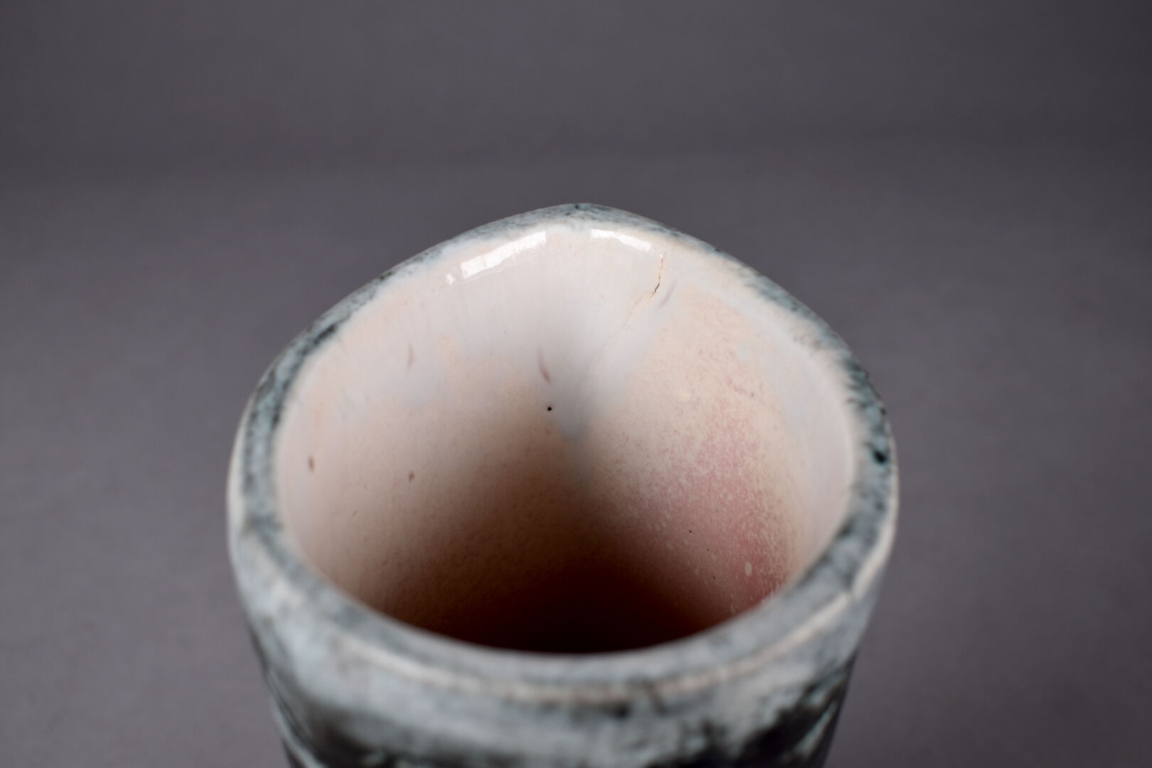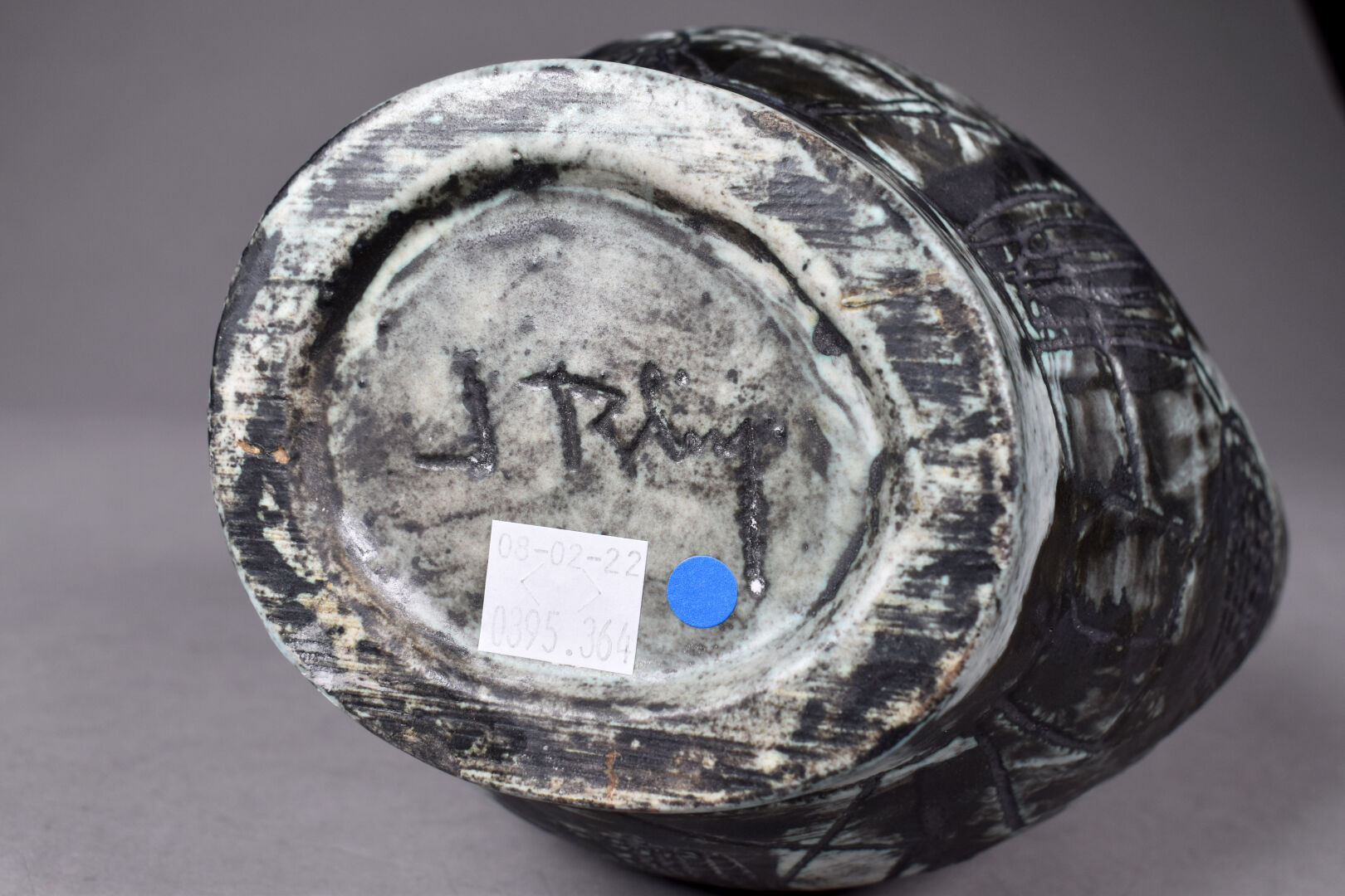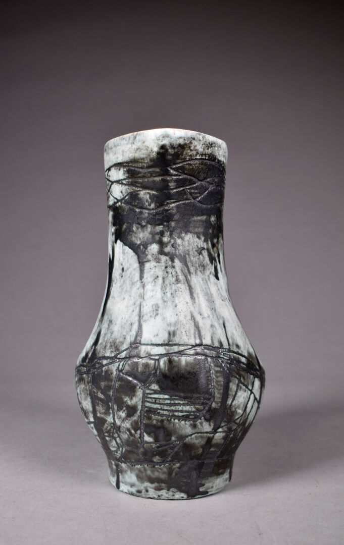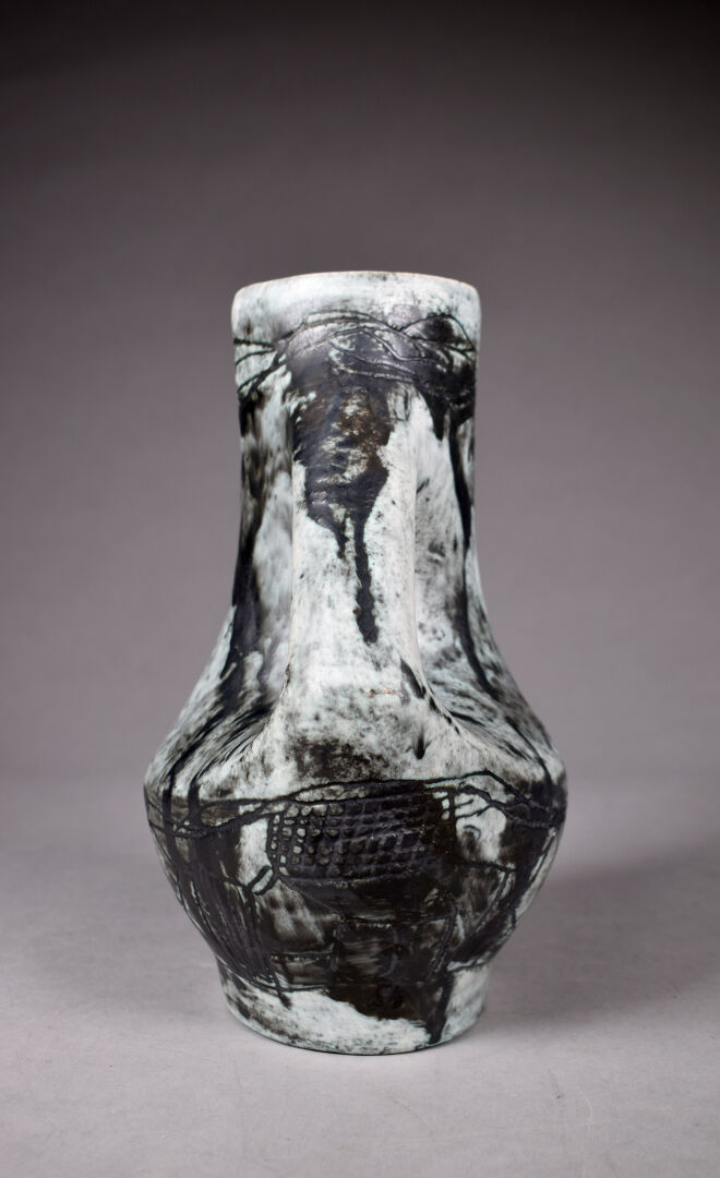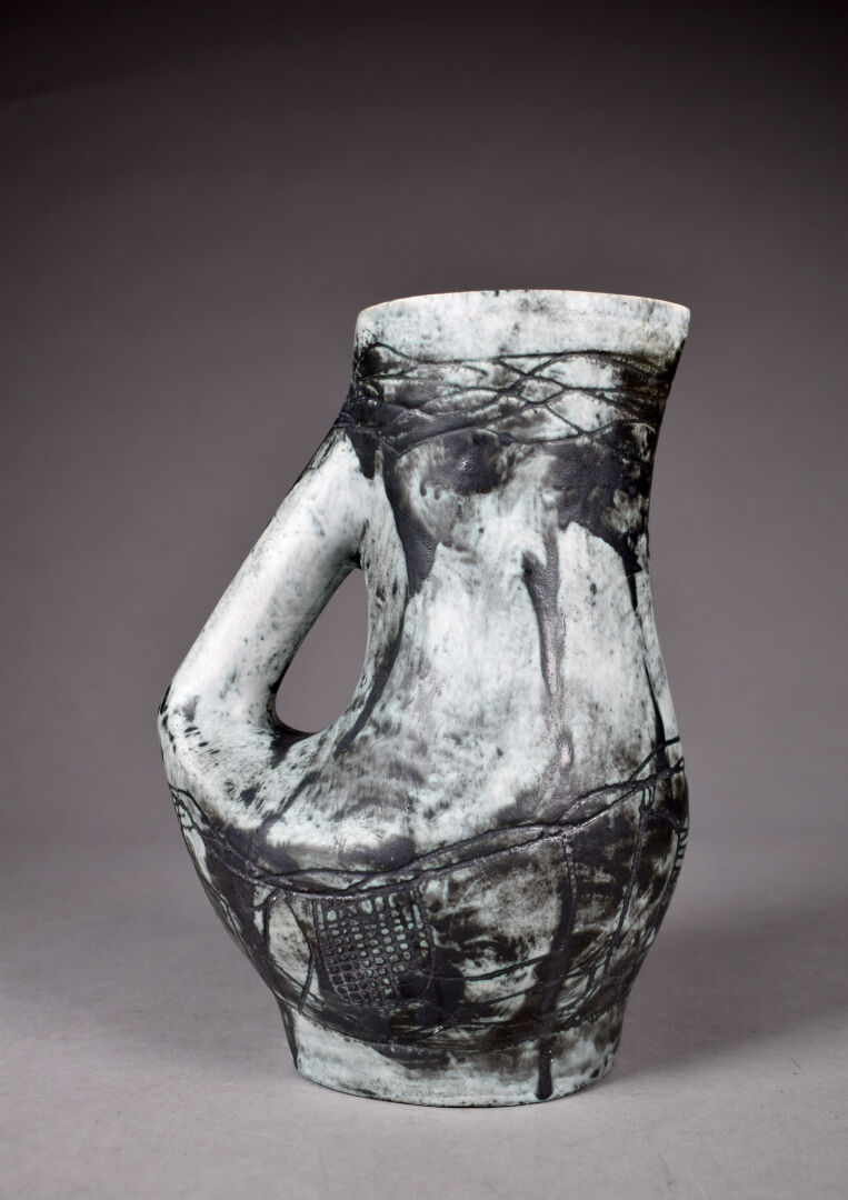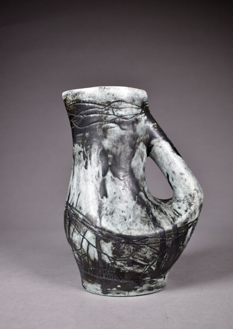 Jacques BLIN (1920-1995). Pichet dit « Poignée », (modèle 46 conçu en 1953) émail gris vert sur fond blanc anthracite. Signé sous la base « J. Blin ». Haut. : 24 cm.