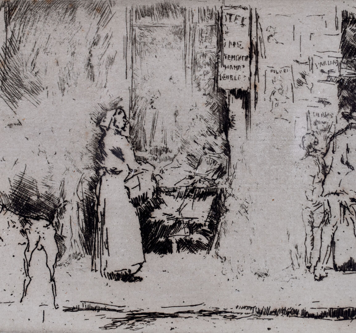 James WHISTLER (1834-1903). Newspaper stall, rue de Seine. Eau-forte sur papier vergé. Épreuve de l’état définitif coupée sur la marque du cuivre, avec tablette dans le bas. Petites rousseurs et piqûres. 8,2 (8,5) x 19,8cm. Cadre. Kennedey 432, Catalogue Glasgow 474 II/II.