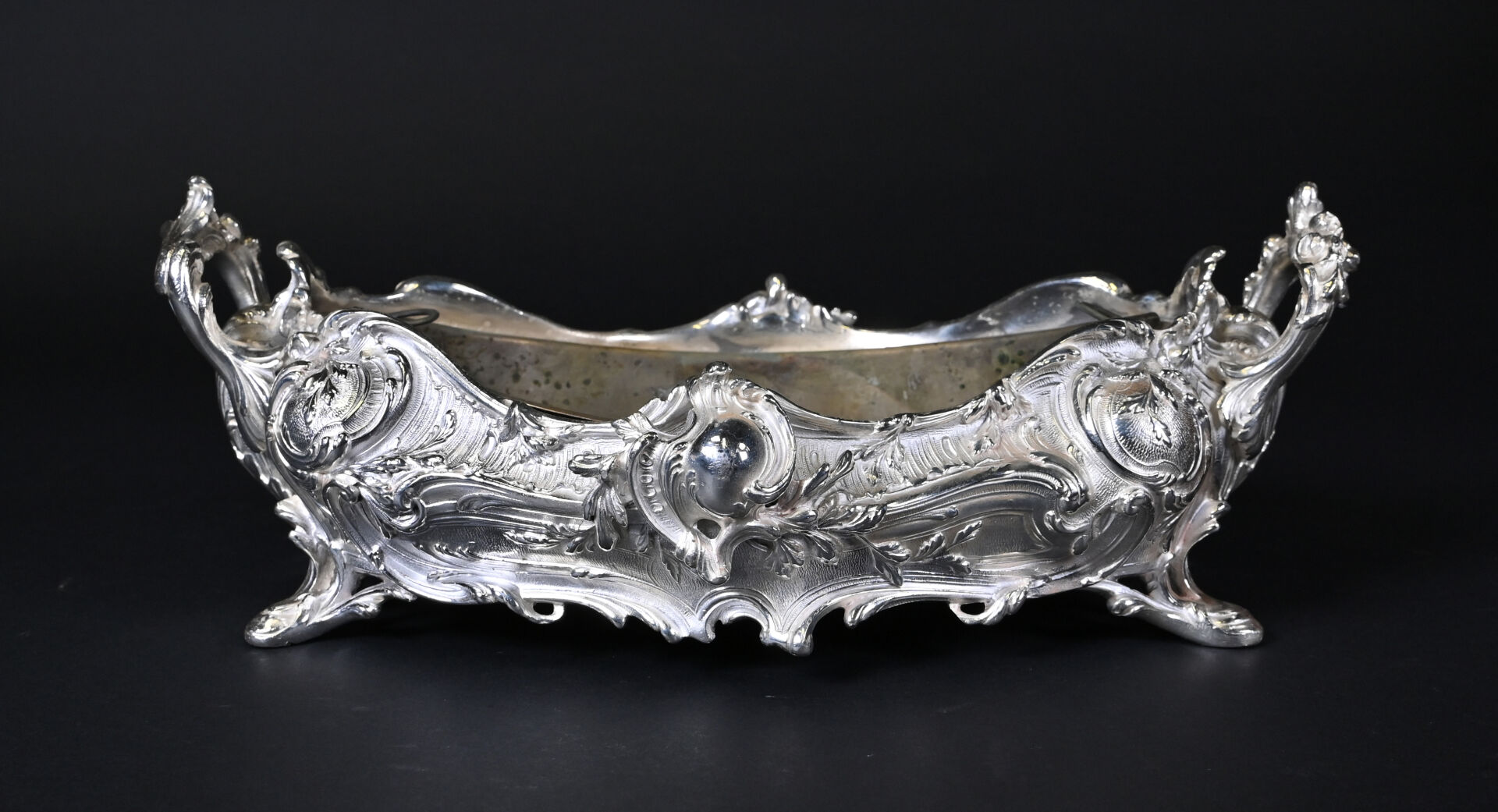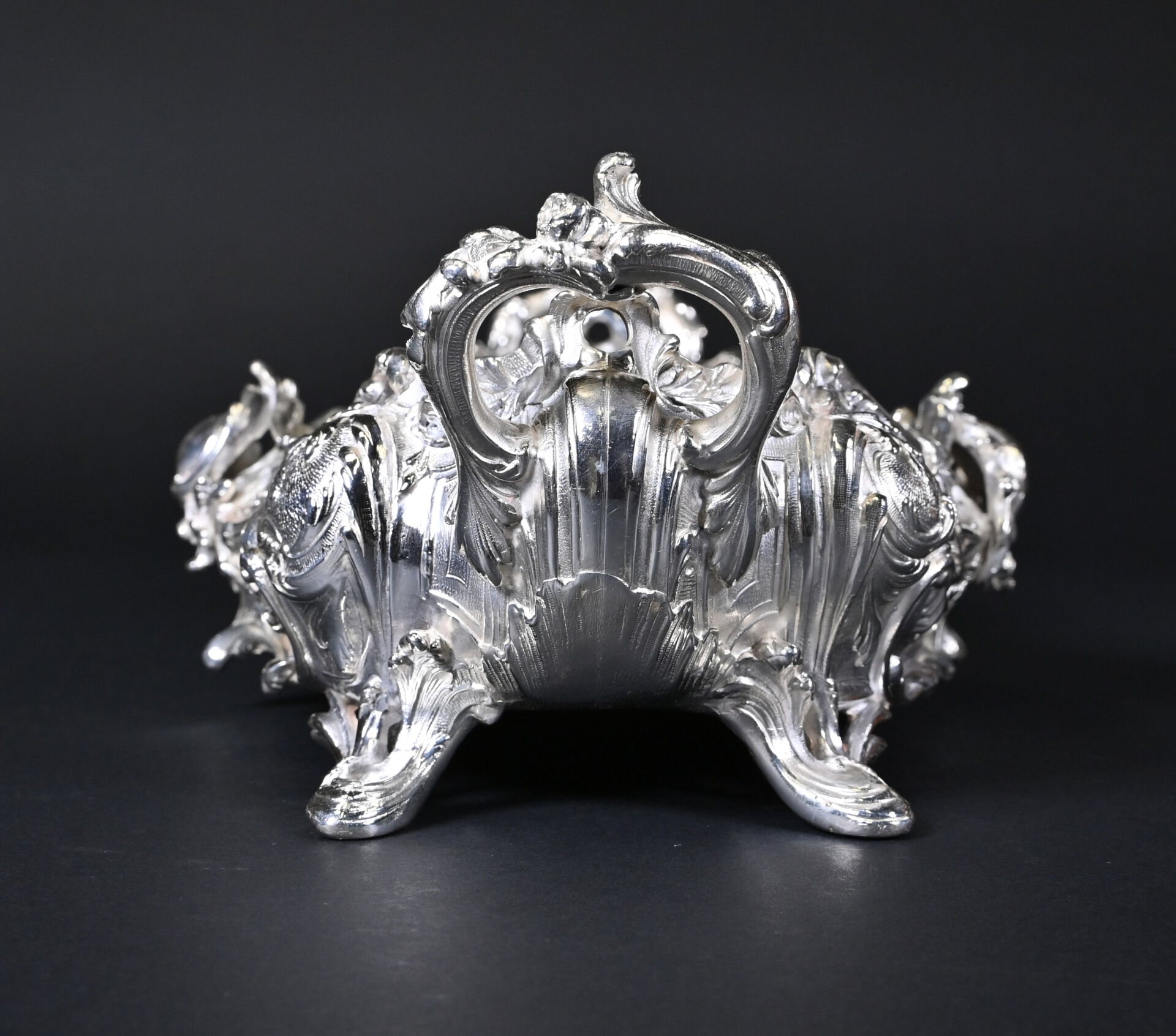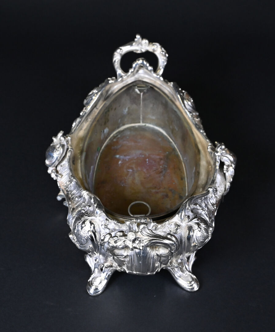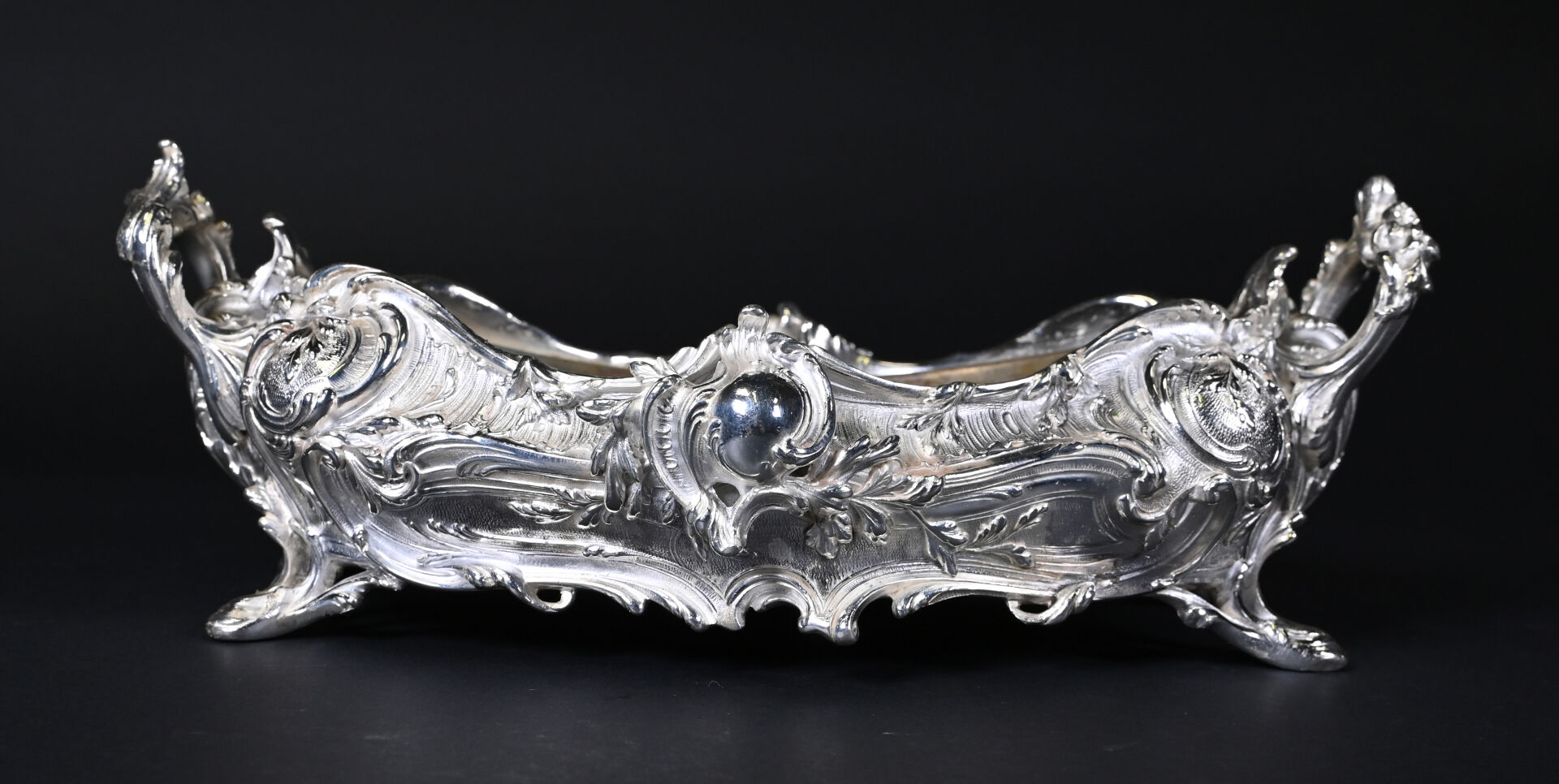 Jardinière de table à décor de rocailles en métal argenté. Style Louis XV. Haut. : 13 cm – Larg. : 34,5 cm – Prof. : 23 cm.