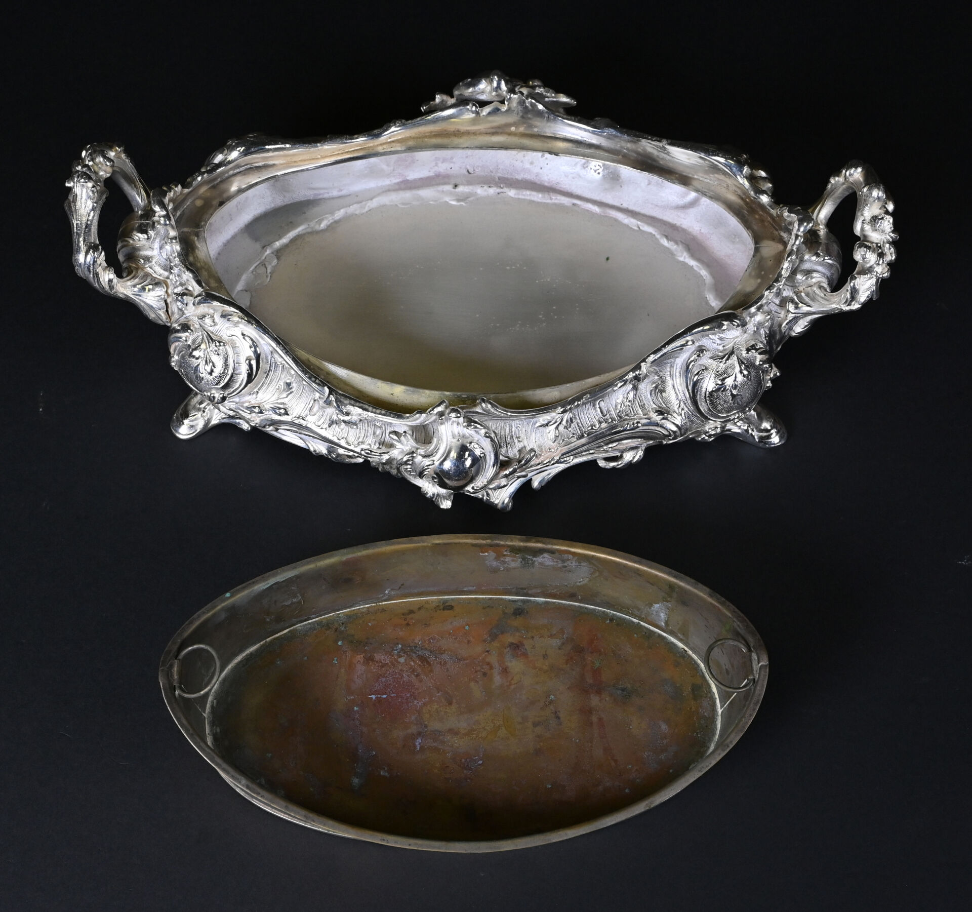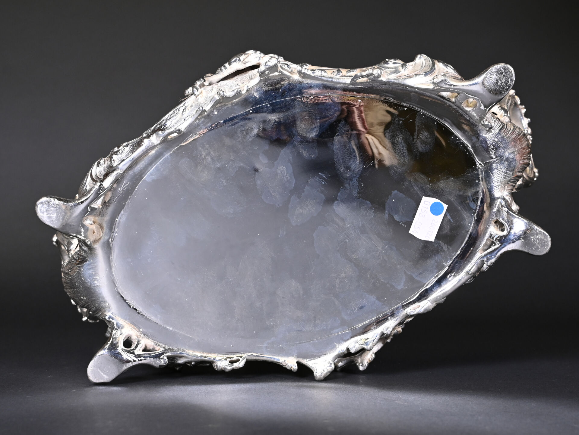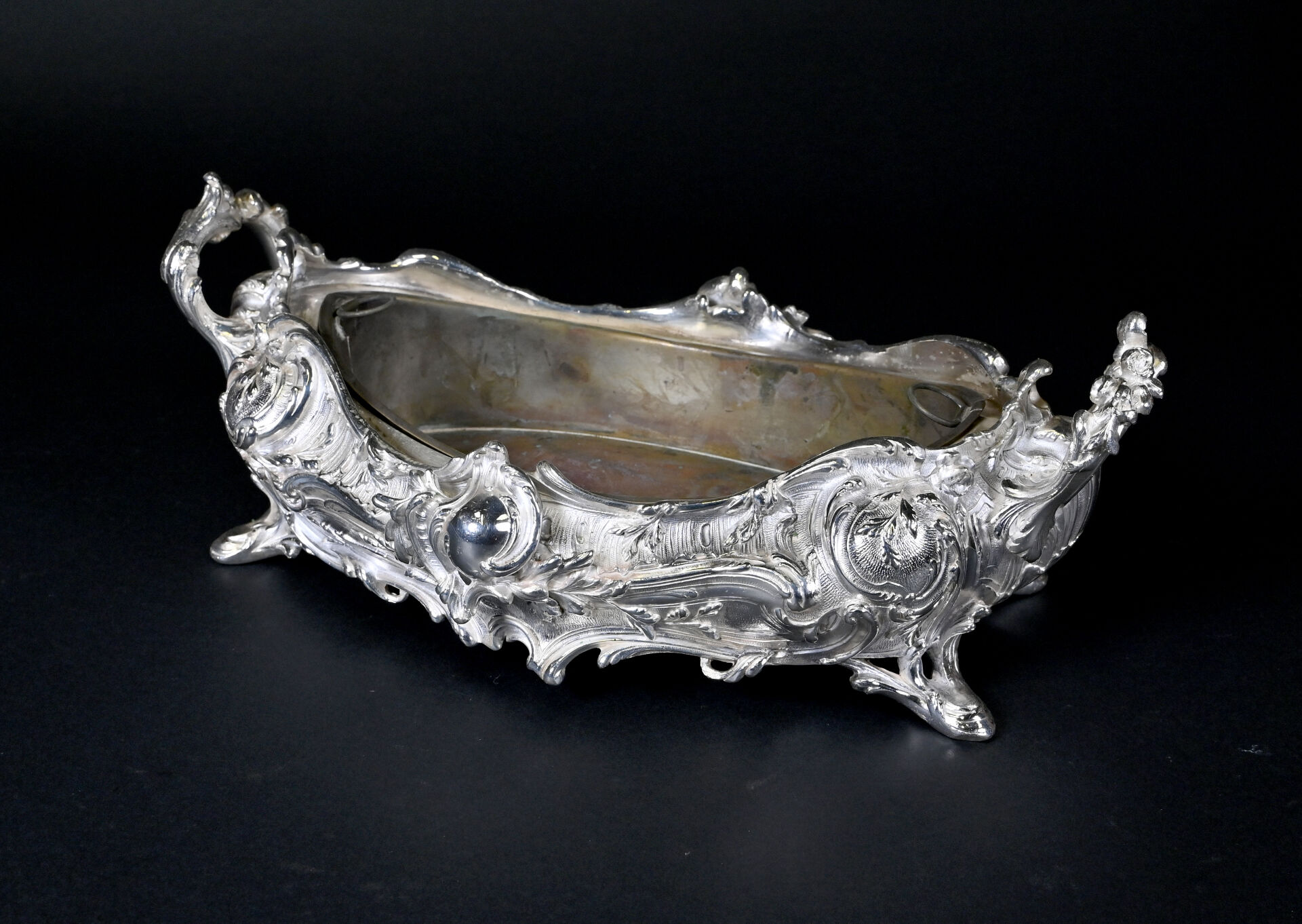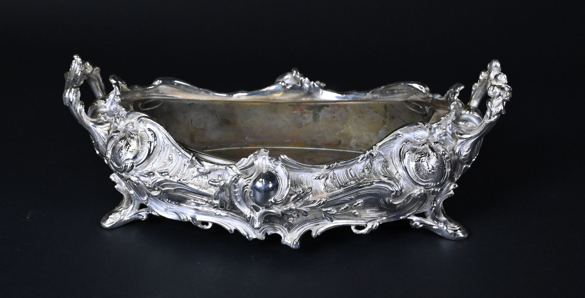 Jardinière de table à décor de rocailles en métal argenté. Style Louis XV. Haut. : 13 cm – Larg. : 34,5 cm – Prof. : 23 cm.