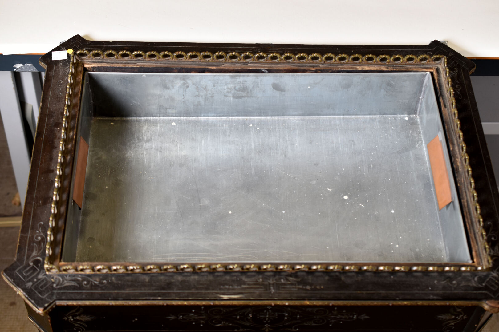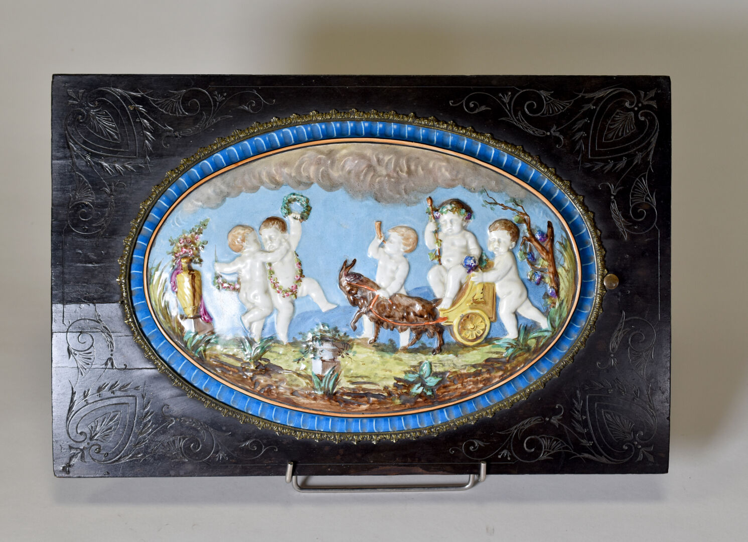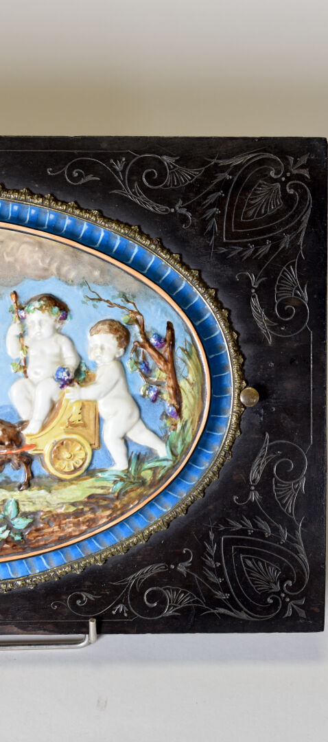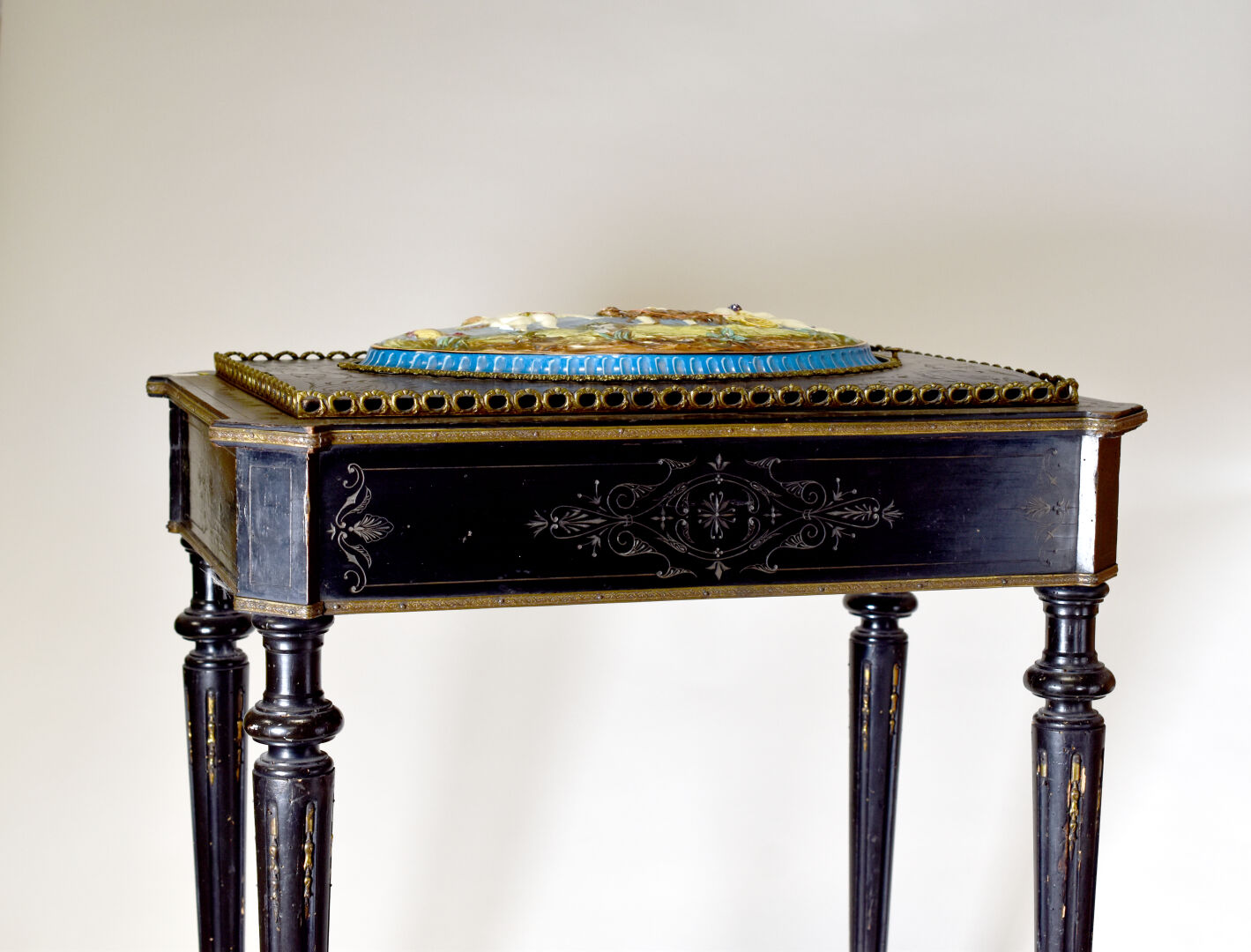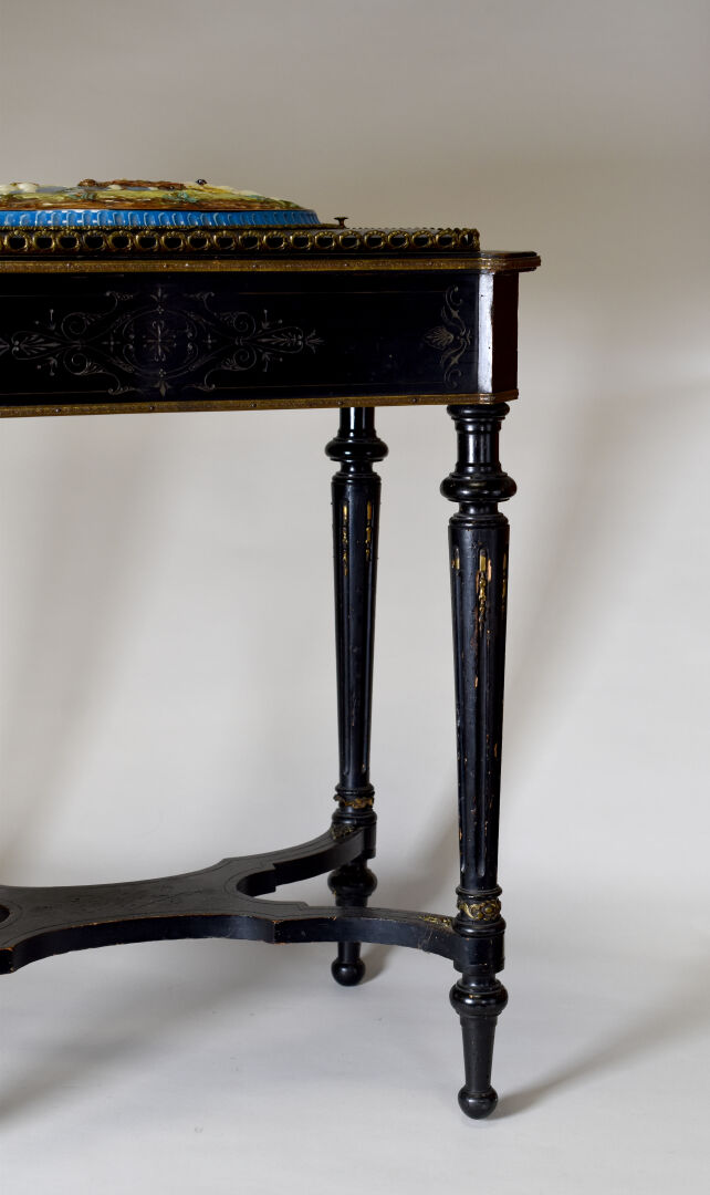 Jardinière en bois noirci à décor gravé. Le couvercle ceint d’une plaque de porcelaine émaillée en polychromie d’une bacchanale. Pieds fuselés cannelés rudentés. Intérieur en zinc. Époque Napoléon III. Haut. : 73 cm – Larg. : 41 cm – Prof. : 62 cm.