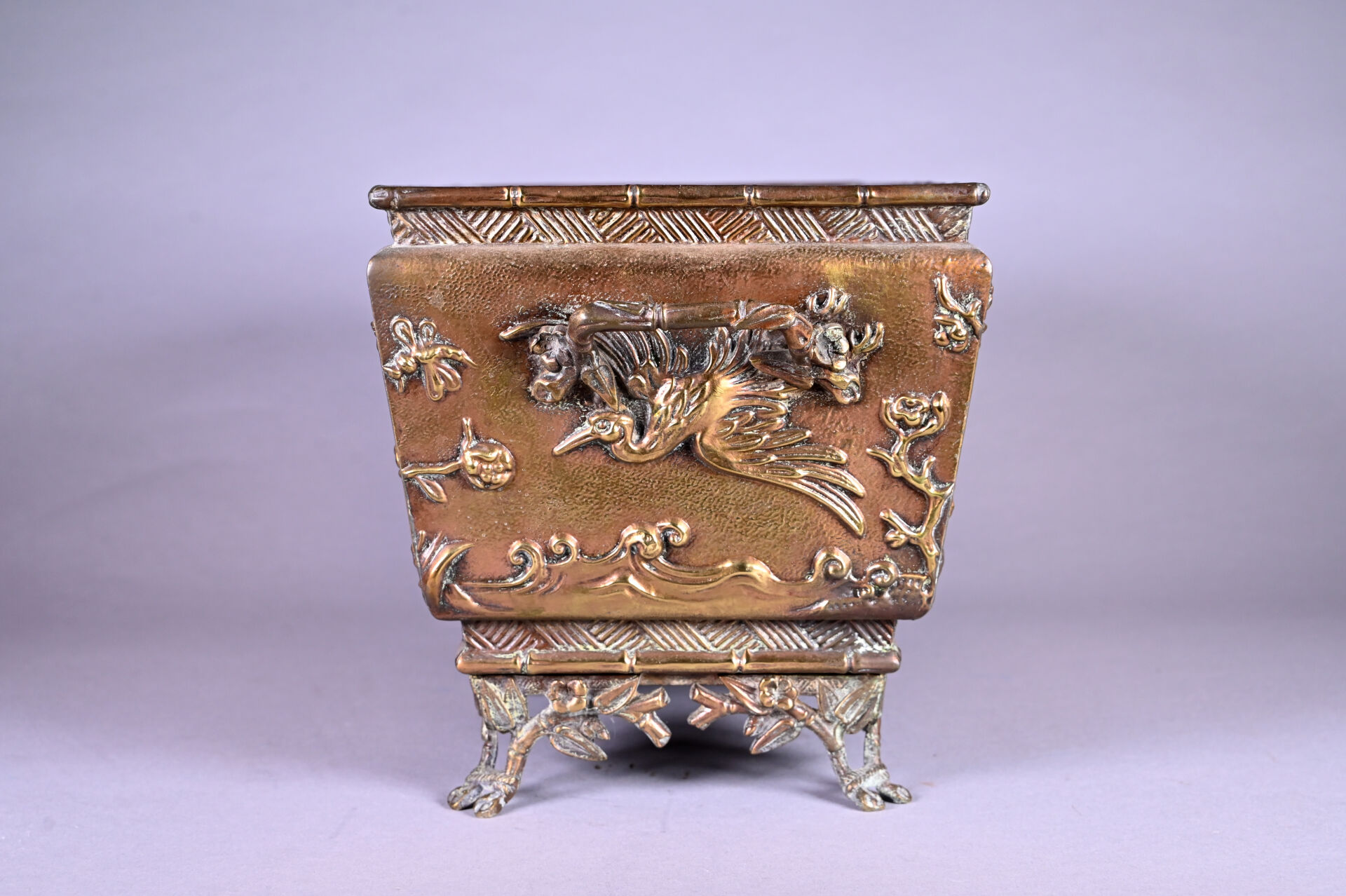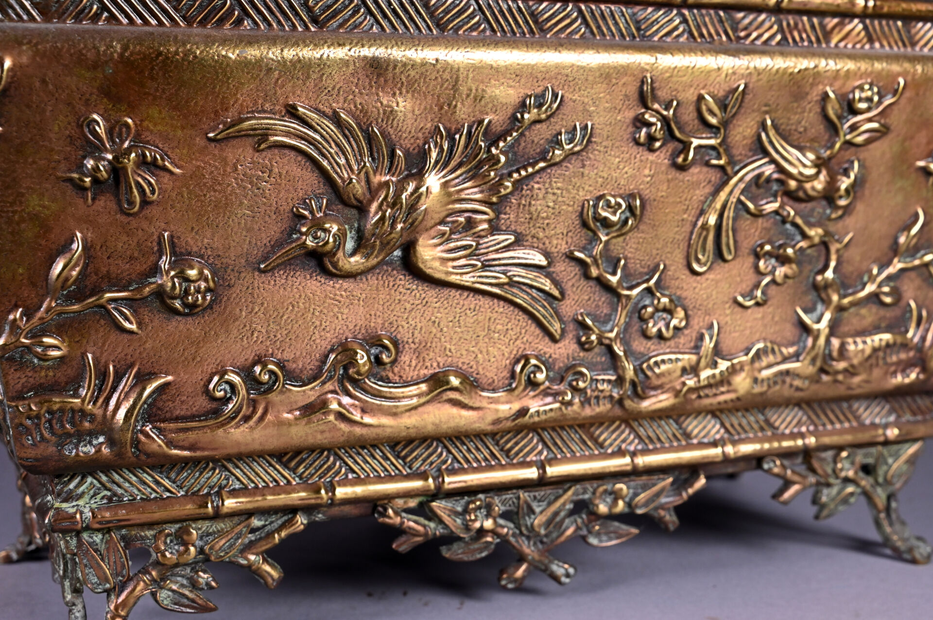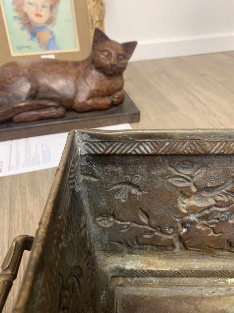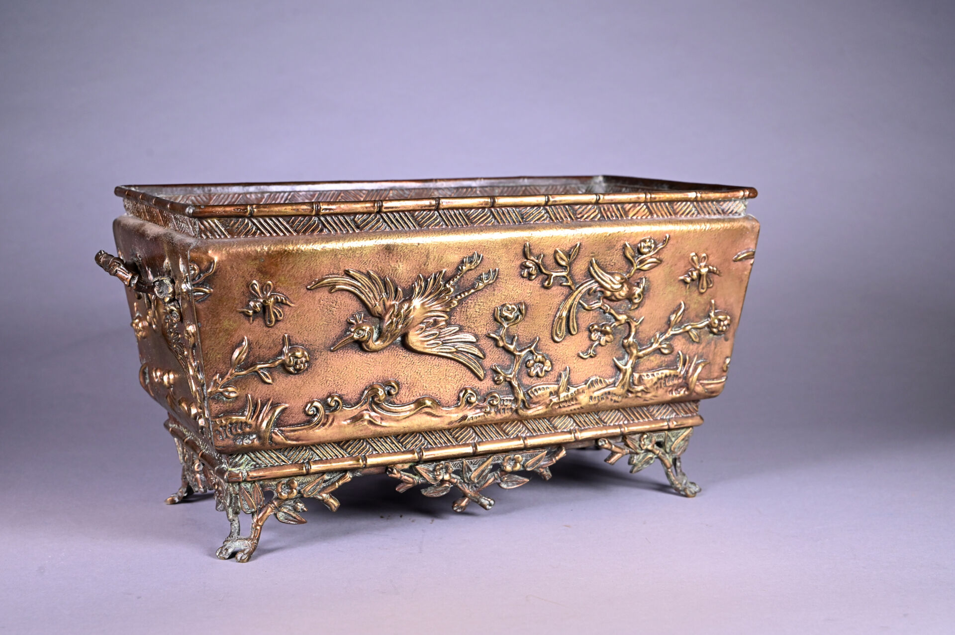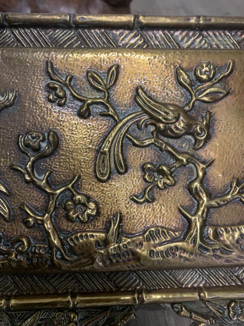 Jardinière en cuivre à décor en repoussé d’oiseaux fantastiques et bambous (dorure usée, petits enfoncements sur le bord, fêle dans un angle, ressoudures non visibles de l’extérieur). Fin du XIXe siècle. Haut. : 21,5 cm – Larg. : 44 cm – Prof. : 20 cm.