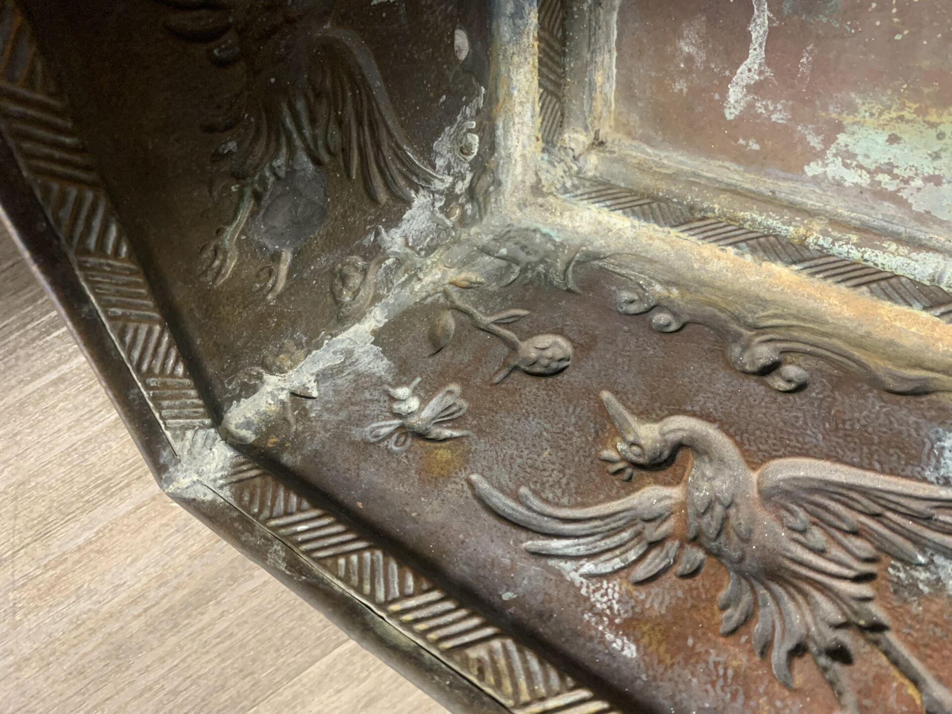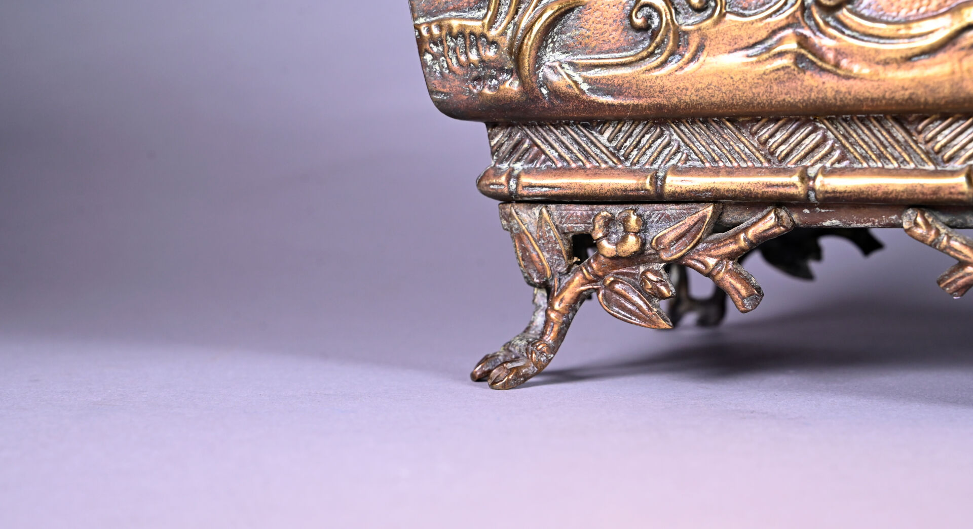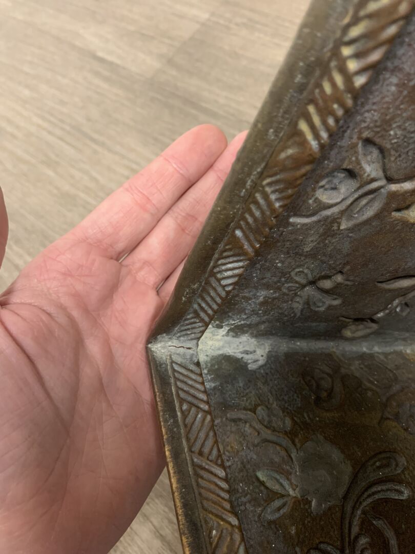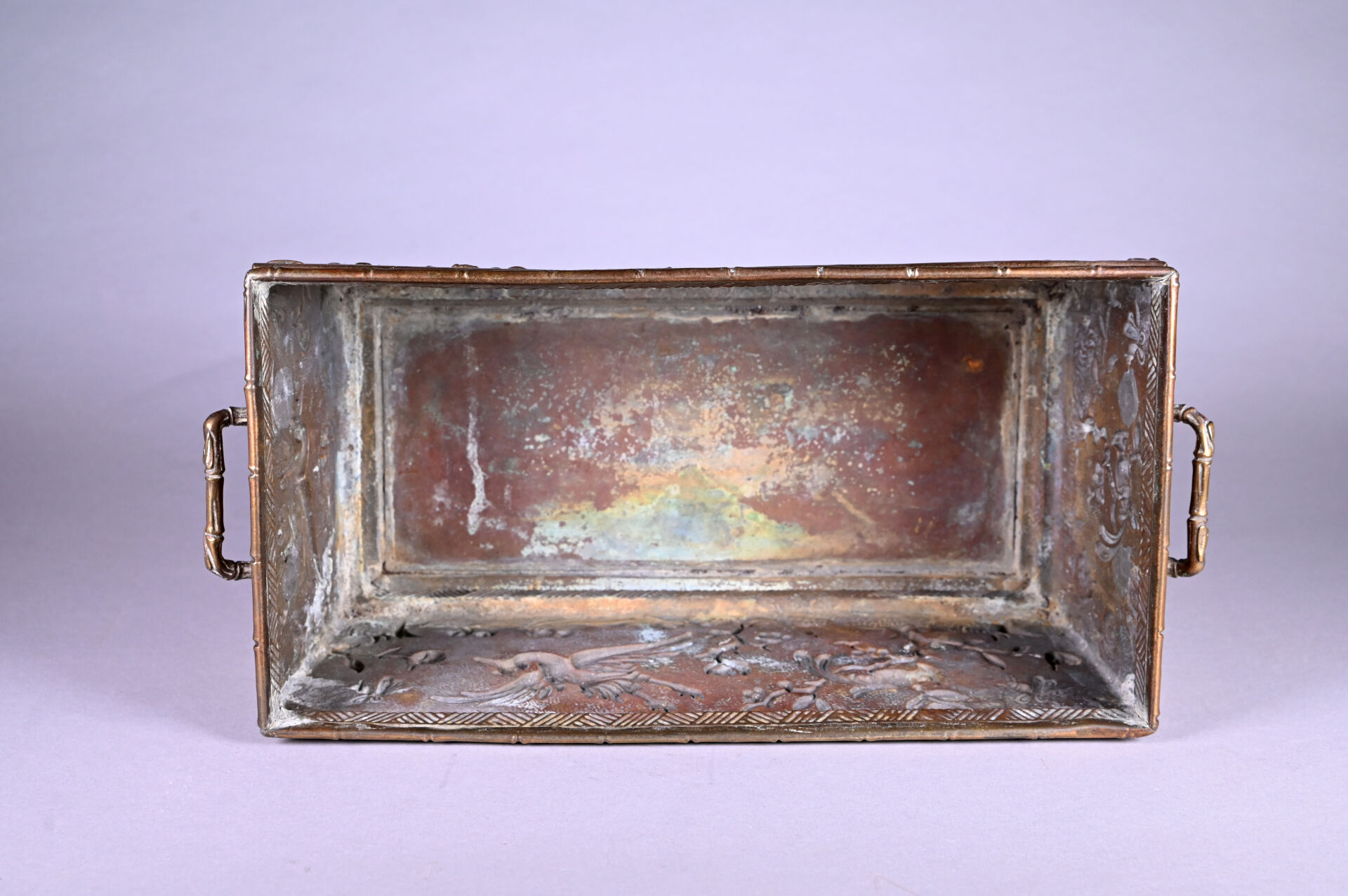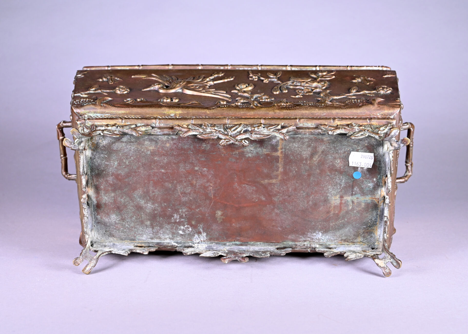 Jardinière en cuivre à décor en repoussé d’oiseaux fantastiques et bambous (dorure usée, petits enfoncements sur le bord, fêle dans un angle, ressoudures non visibles de l’extérieur). Fin du XIXe siècle. Haut. : 21,5 cm – Larg. : 44 cm – Prof. : 20 cm.