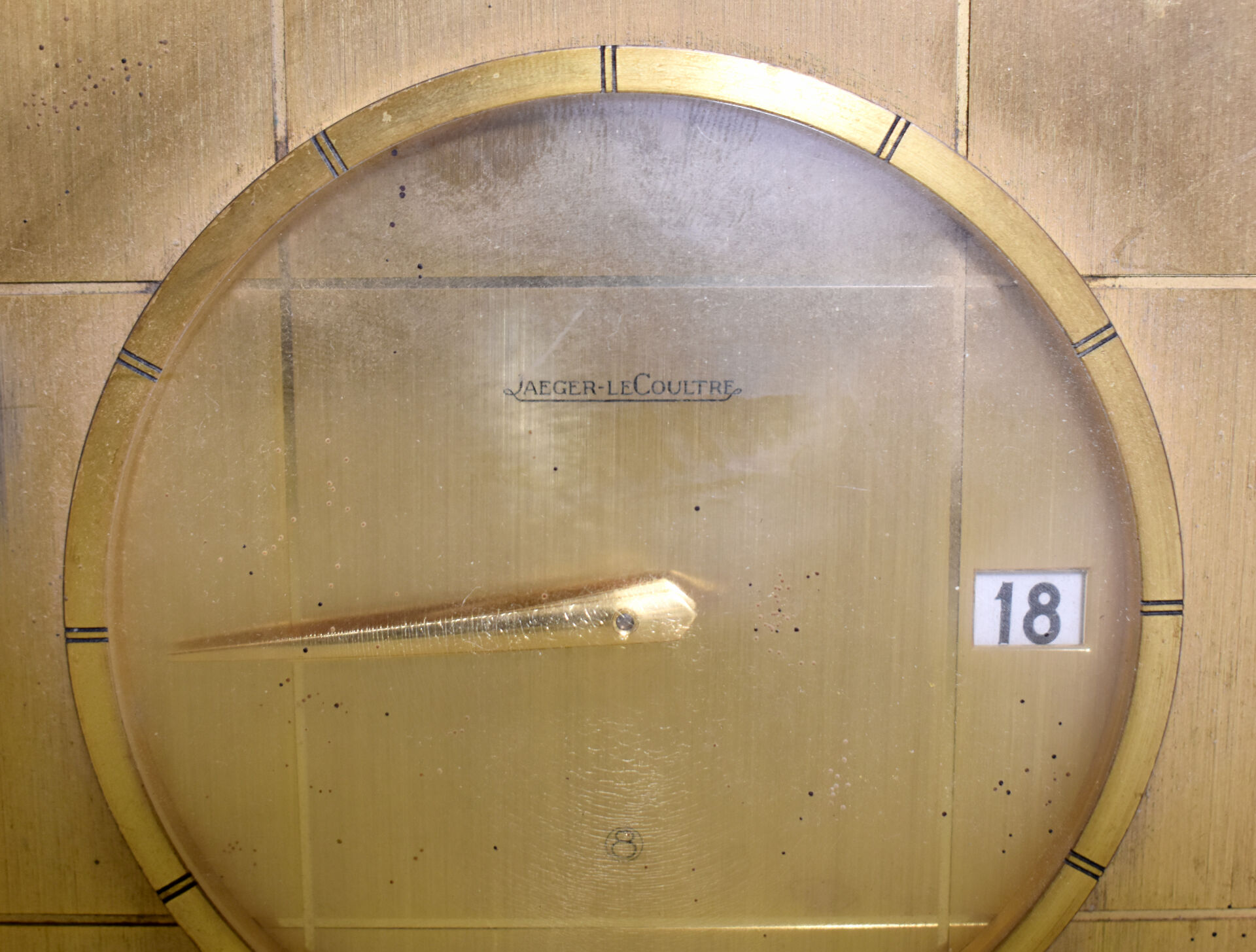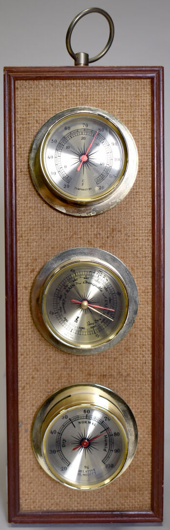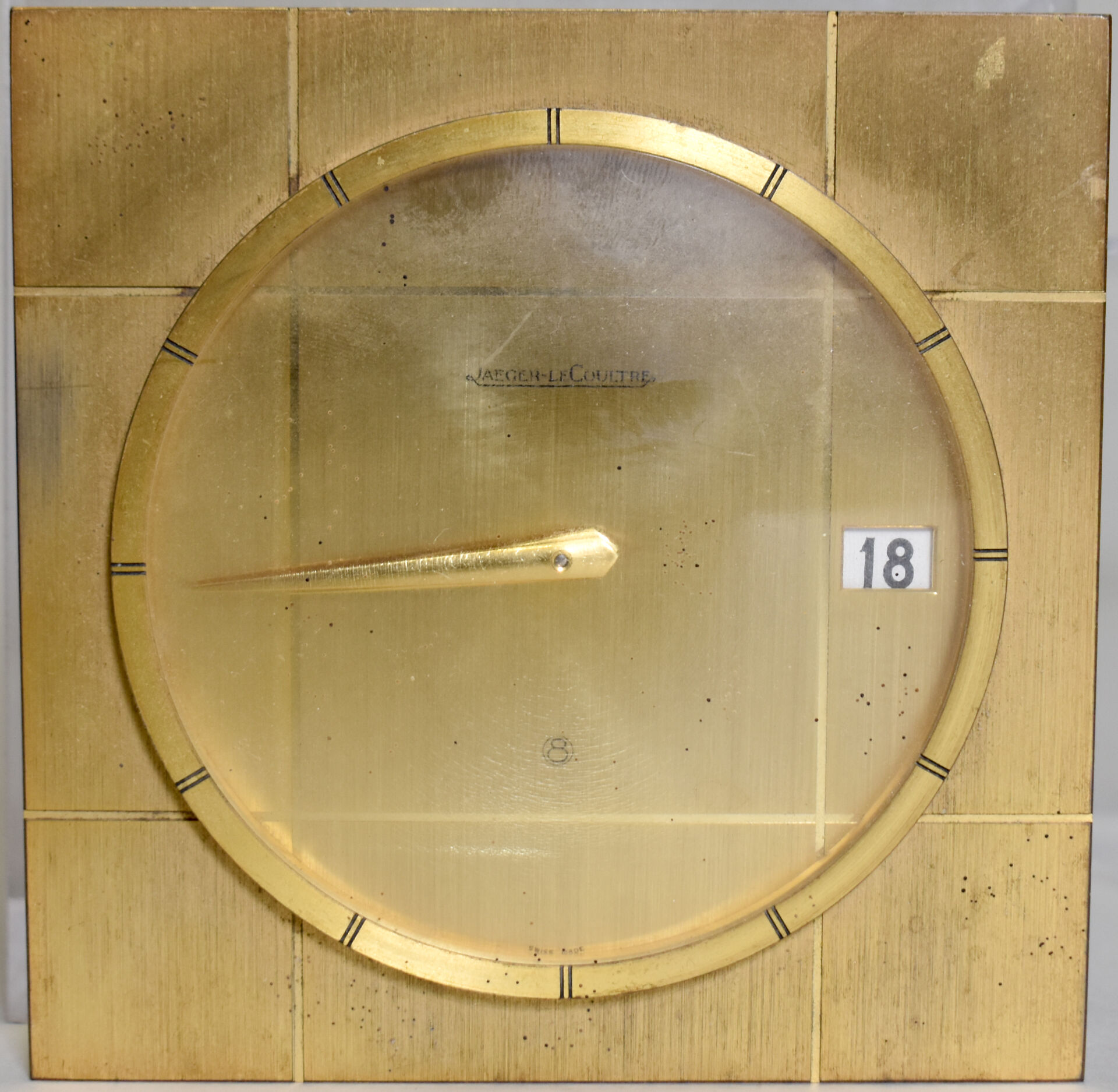JEAGER LECOULTRE. Réveil de table en métal doré, cadran signé, guichet date à 3H (craquelures sur le plexiglas). 11,5 x 11,5 cm. On joint un baromètre thermomètre sans marque apparente.