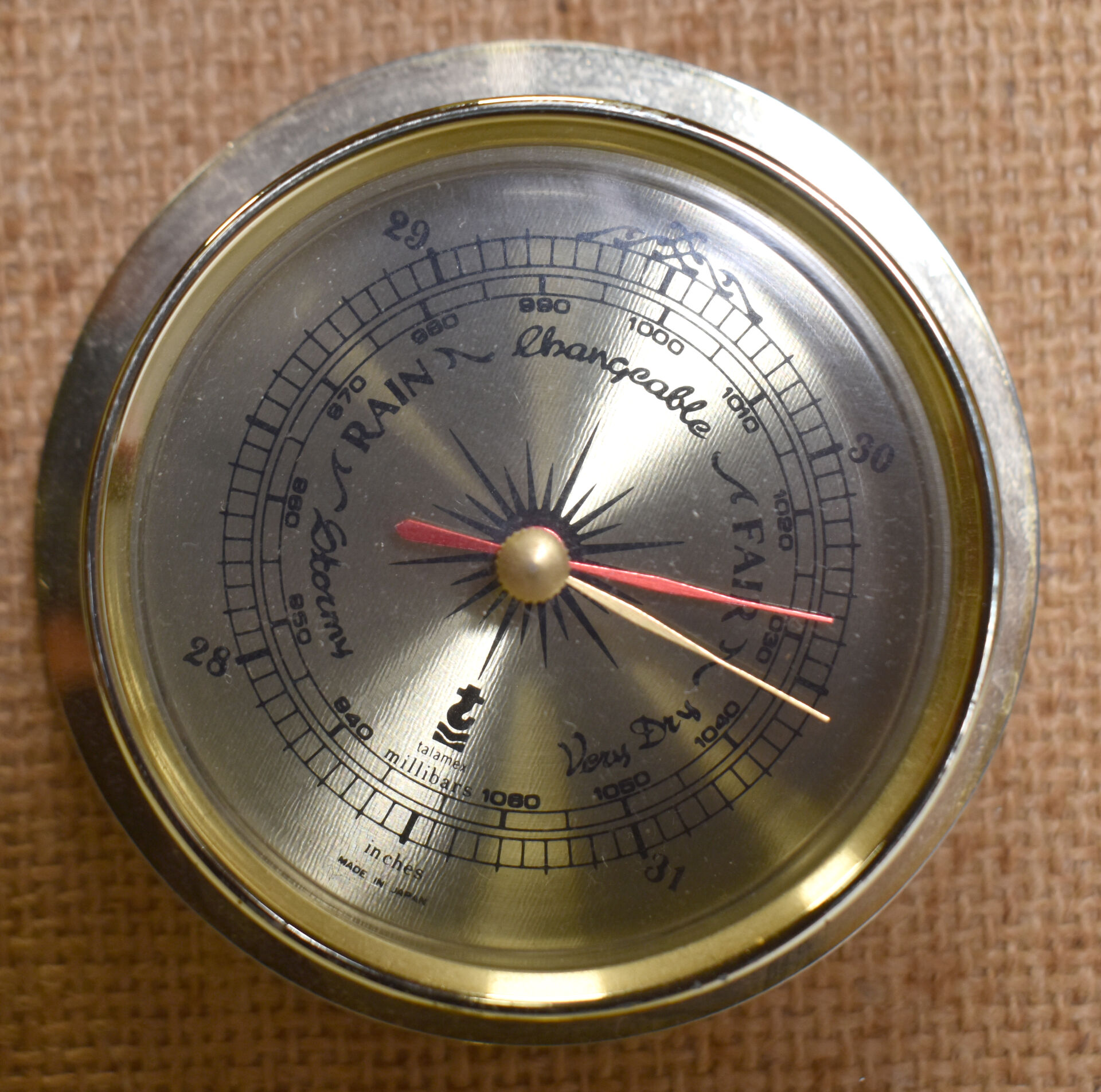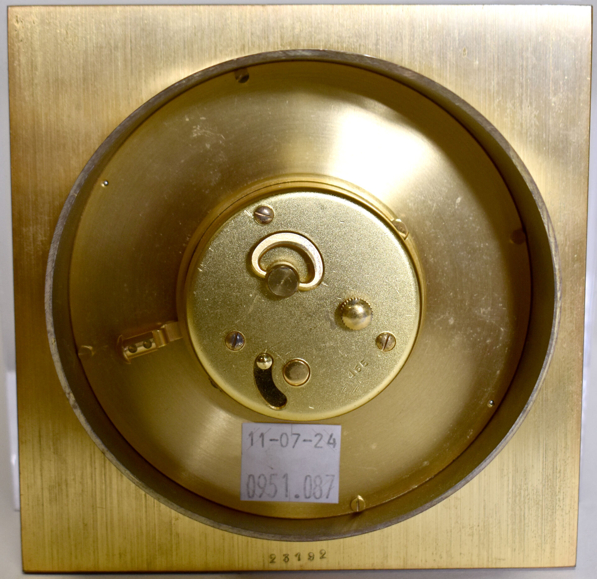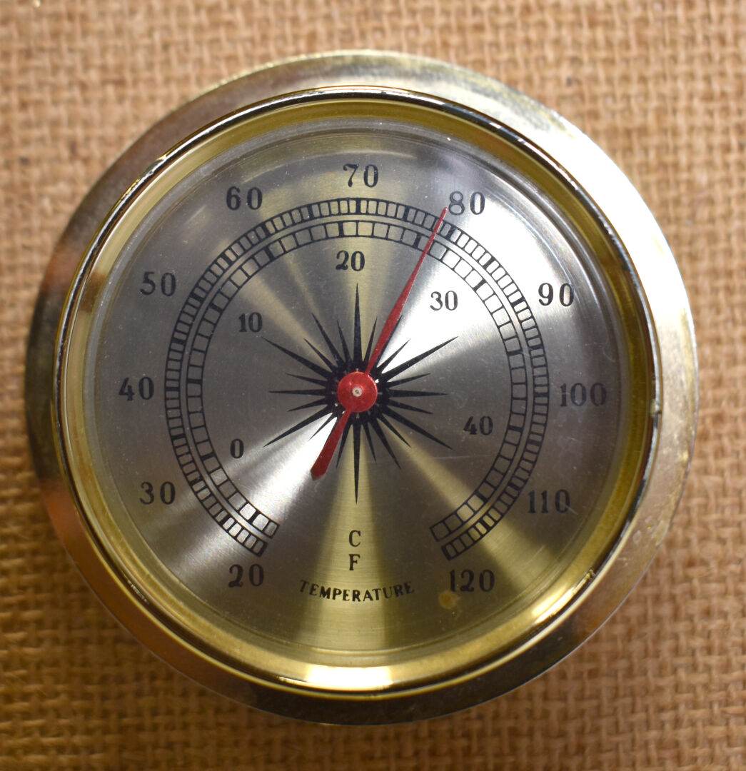 JEAGER LECOULTRE. Réveil de table en métal doré, cadran signé, guichet date à 3H (craquelures sur le plexiglas). 11,5 x 11,5 cm. On joint un baromètre thermomètre sans marque apparente.