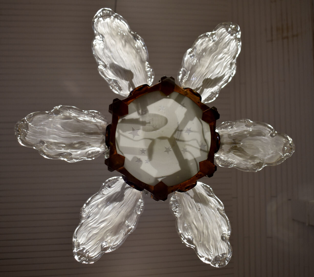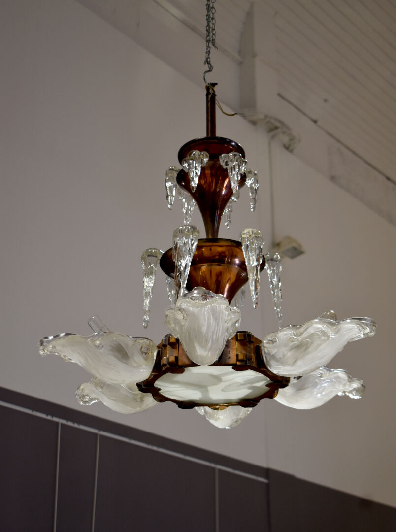 Jean Boris LACROIX (1902-1984). Lustre en bronze cuivré et verre moulé partiellement dépoli à décor sur le thème de l’eau. Marqué. Haut. : 76 cm.