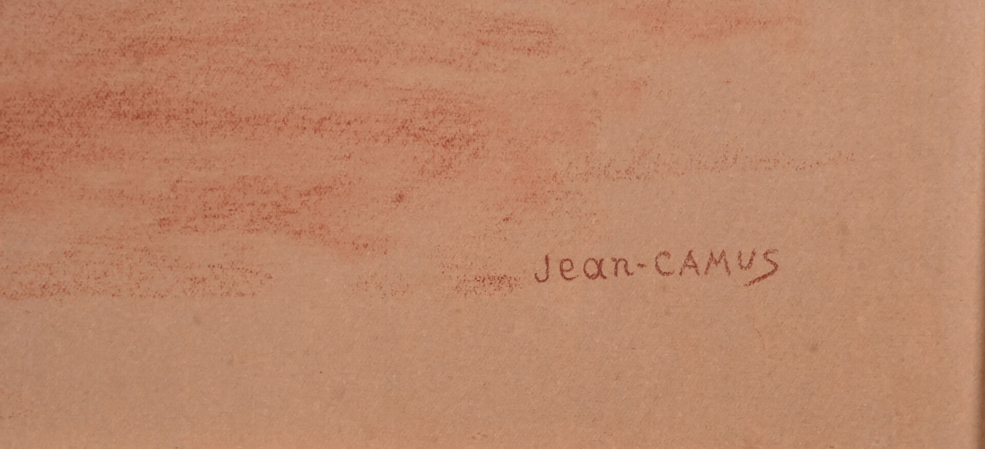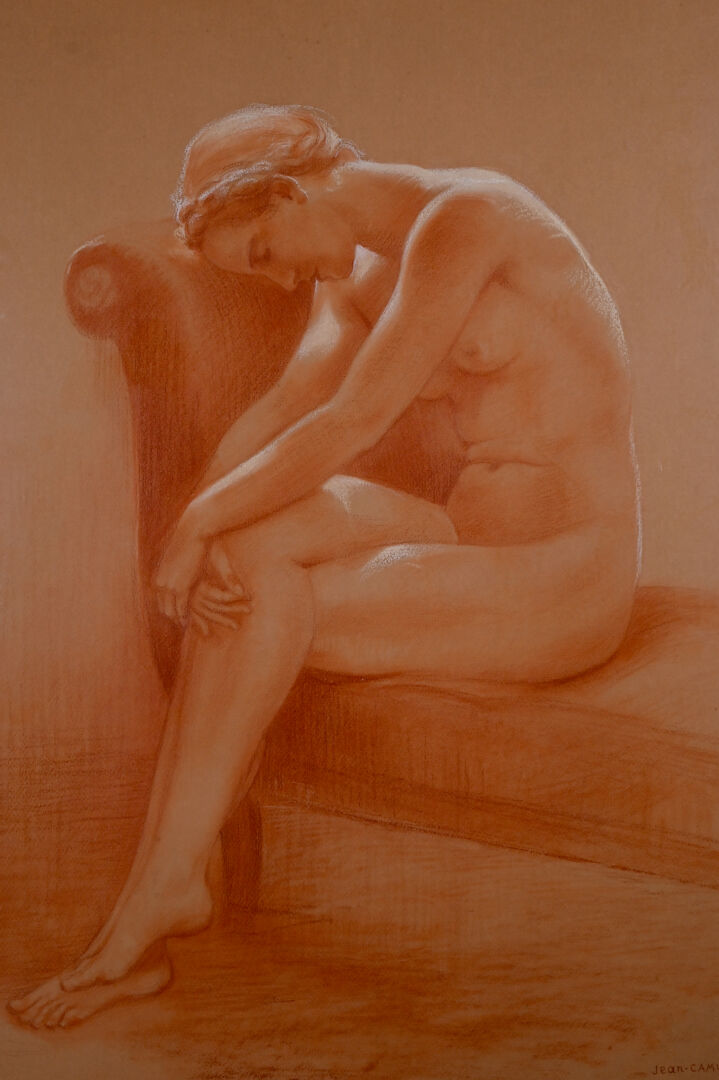 Jean CAMUS (XXe siècle). Nu assis. Dessin à la sanguine et rehauts de craie signé en bas à droite. 5ç,5 x 45 cm à vue.