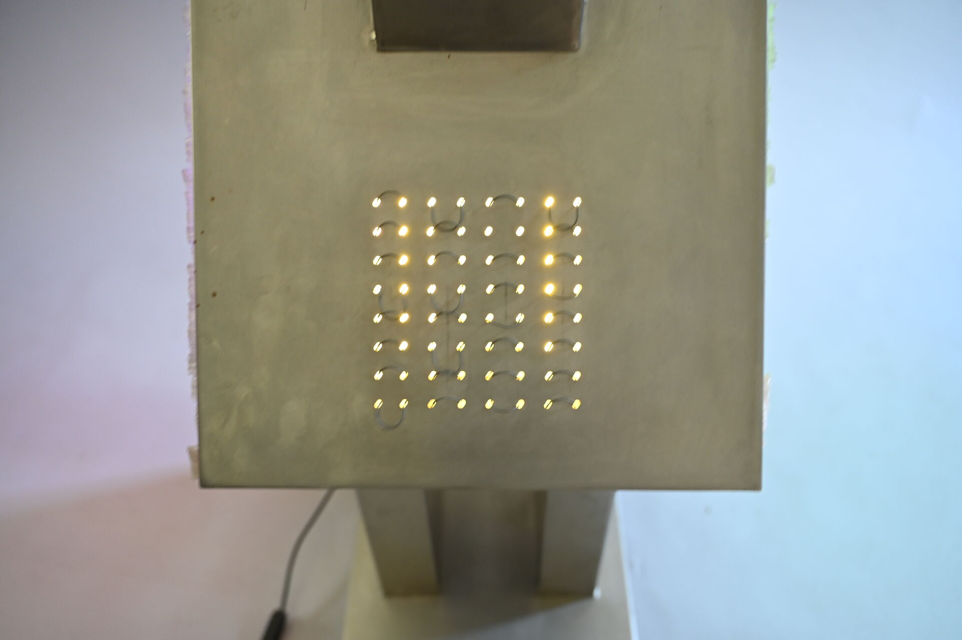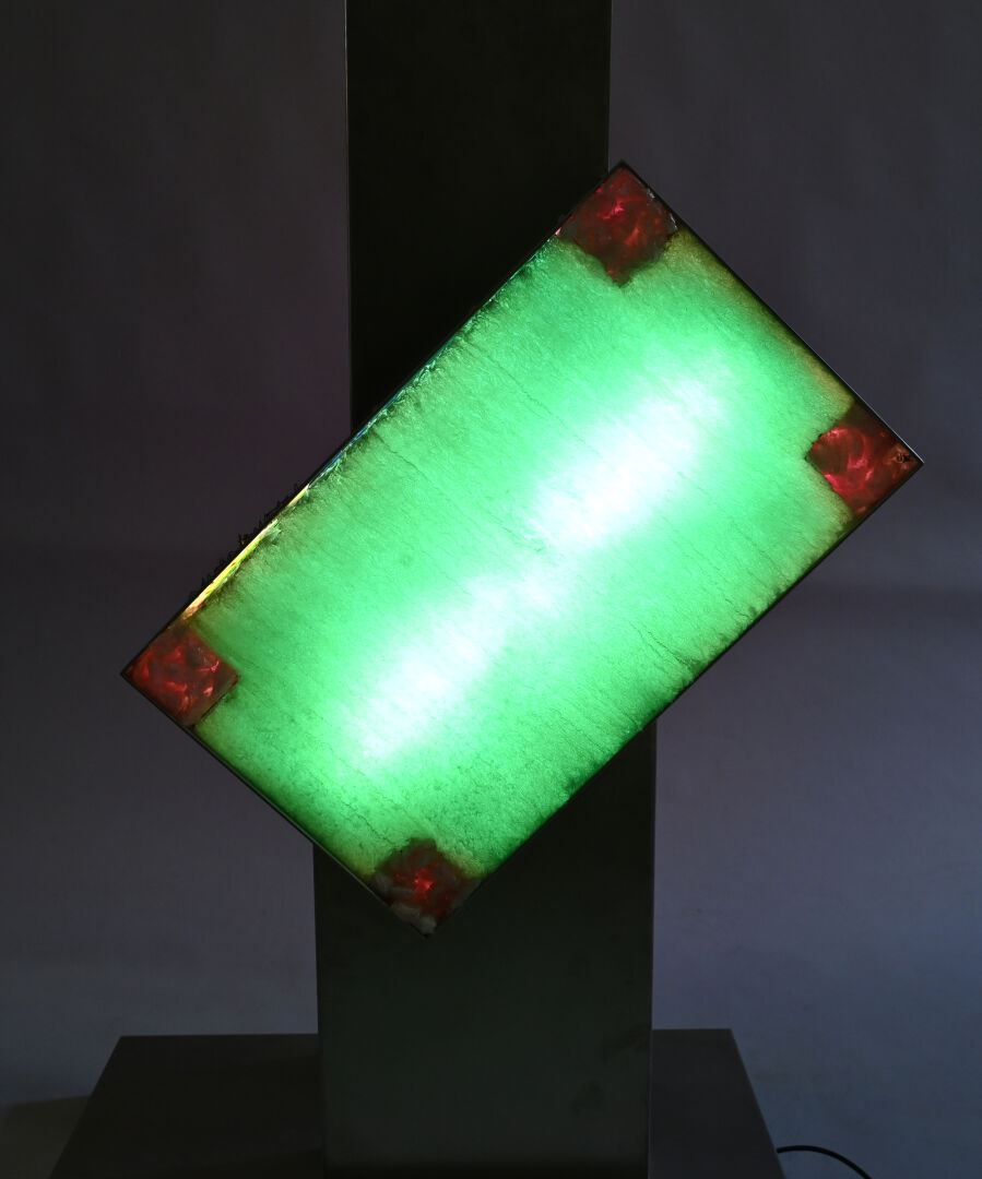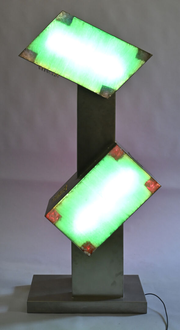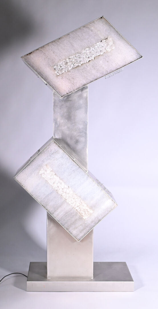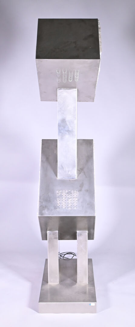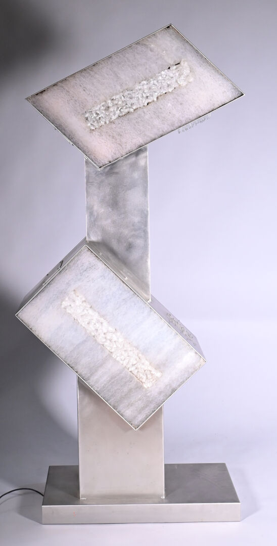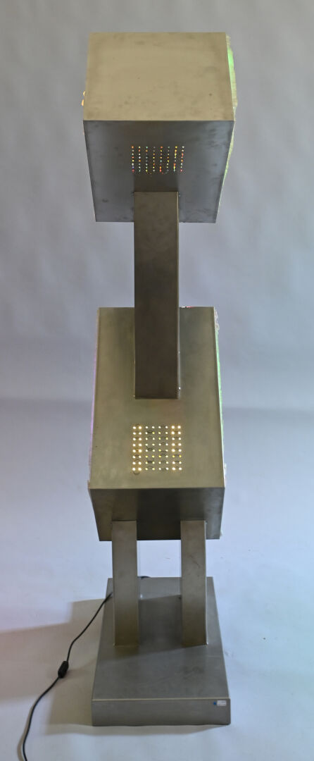 Jean-Claude CAPMARTY (XXe siècle). Grande sculpture lumineuse en métal et plastique. Signée. Haut. : 198 cm – Larg. : 100 cm – Prof. : 40 cm.