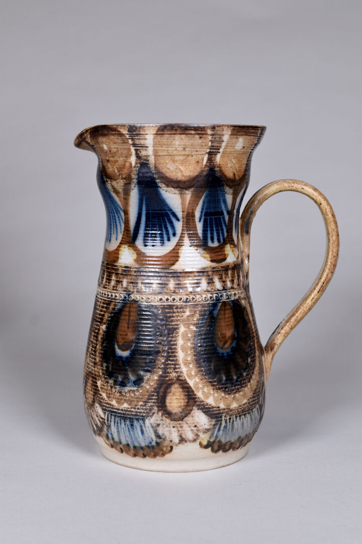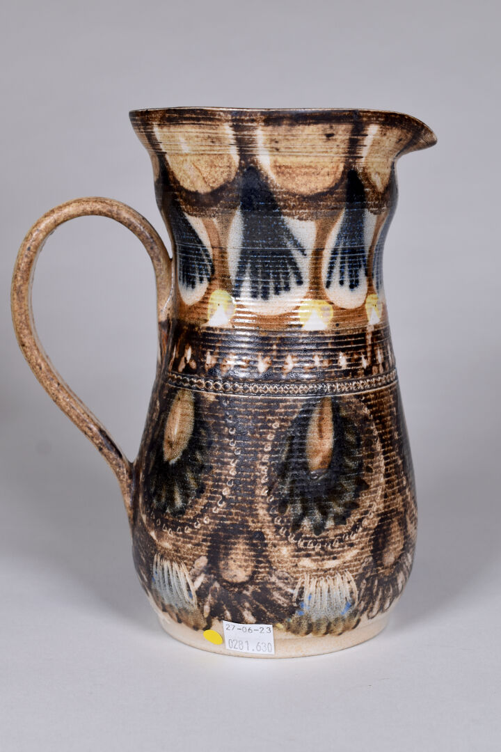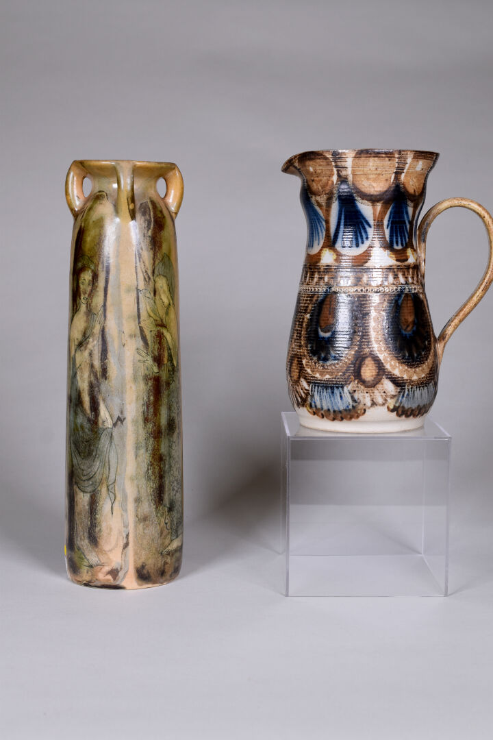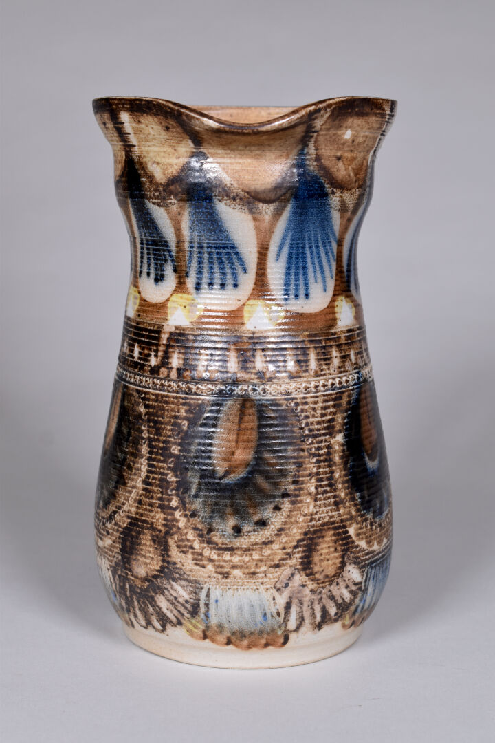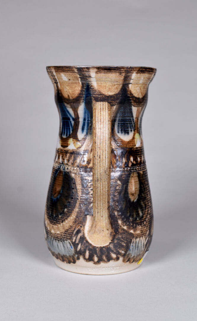 Jean Claude COURJAULT (né en 1962). Verseuse en céramique émaillée de motifs géométriques. Signée au dessous. Haut. : 22 cm. On joint un vase signé LENUZZA. Haut. : 34 cm.