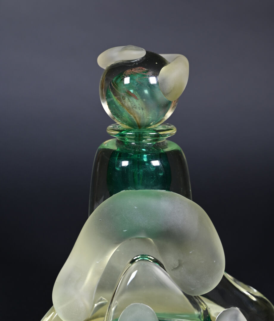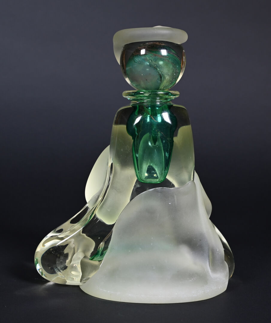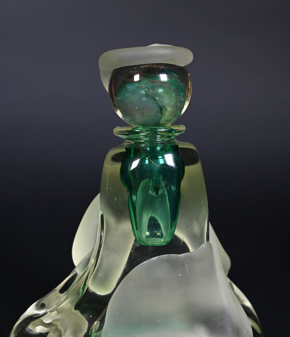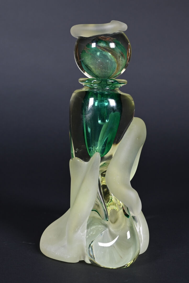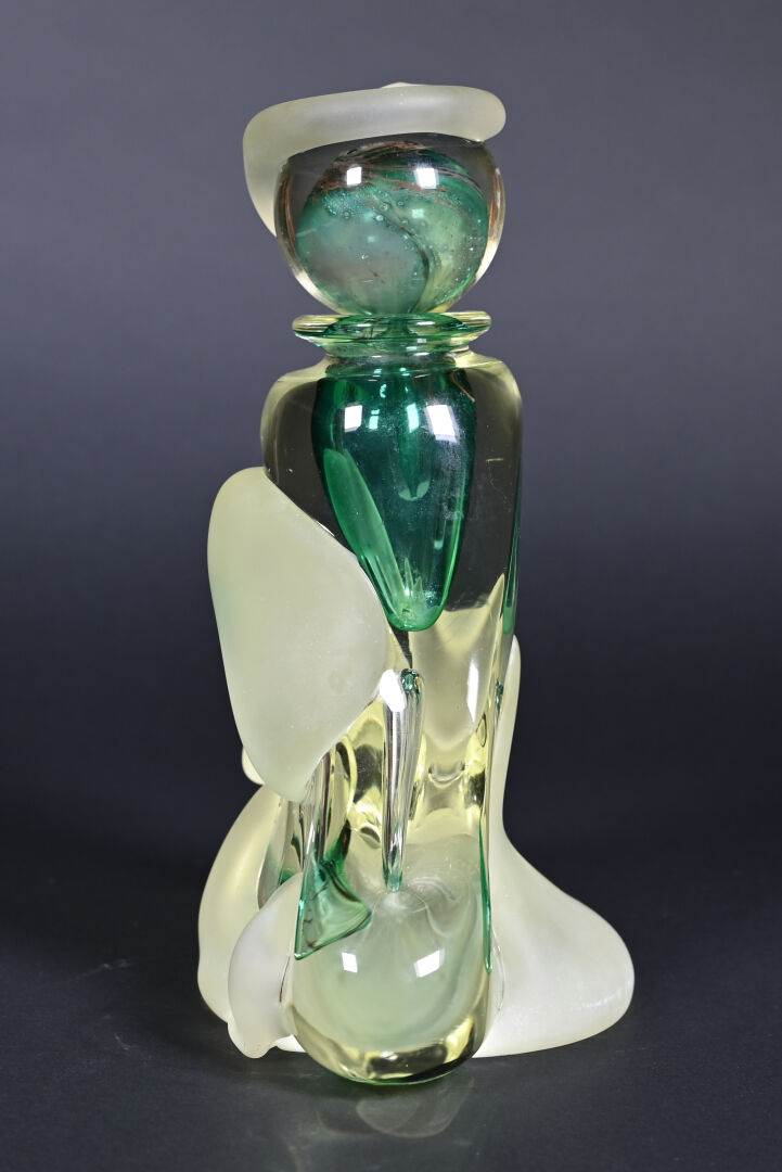 Jean-Claude NOVARO (1943-2015). Important flacon et son bouchon en verre clair, vert, légèrement jaune et dépoli. Signé et daté 1993 au dessous. Haut. : 30 cm.