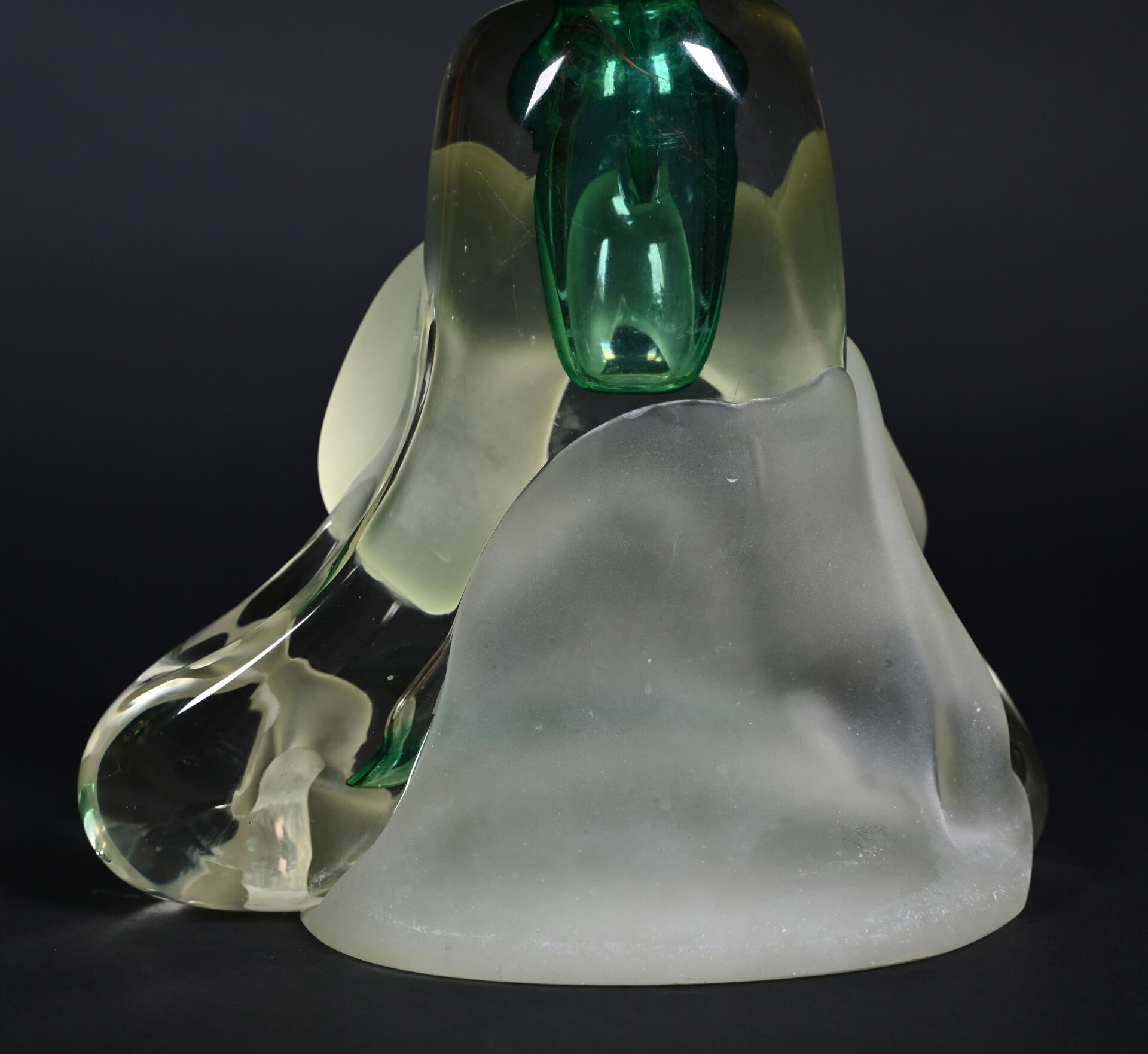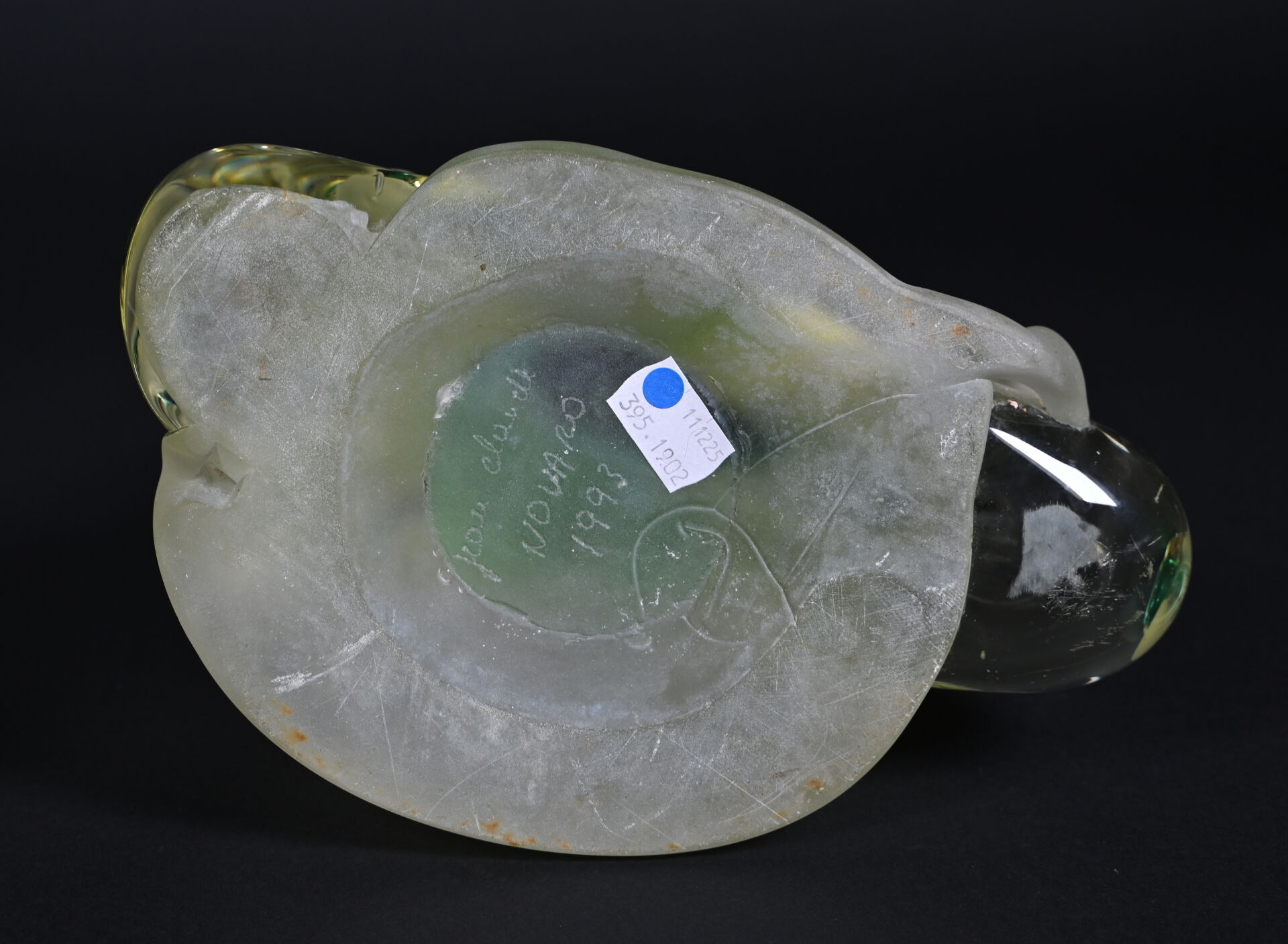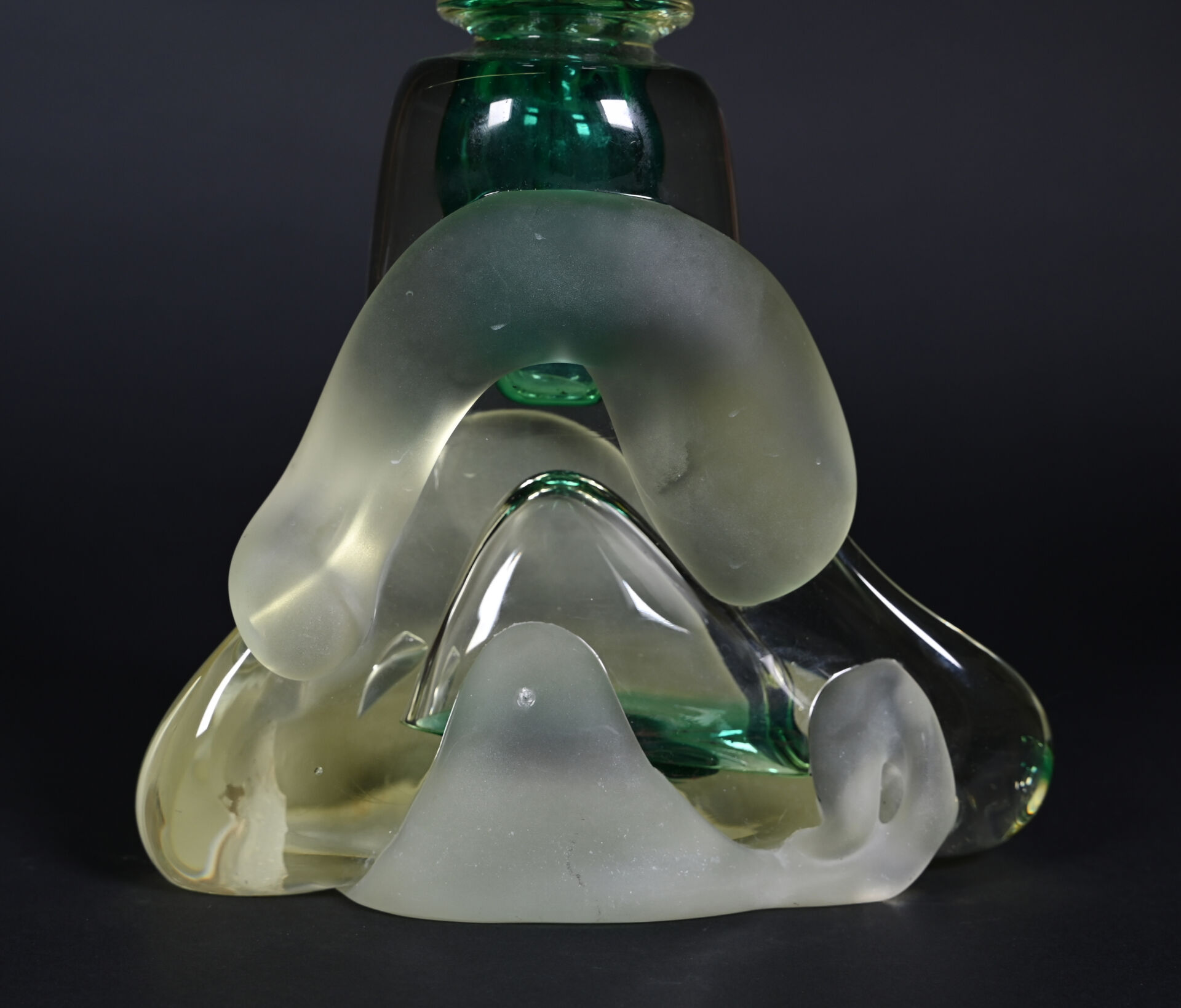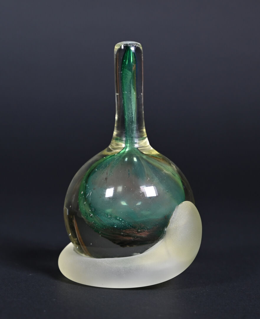 Jean-Claude NOVARO (1943-2015). Important flacon et son bouchon en verre clair, vert, légèrement jaune et dépoli. Signé et daté 1993 au dessous. Haut. : 30 cm.