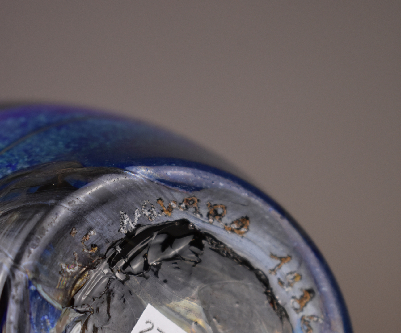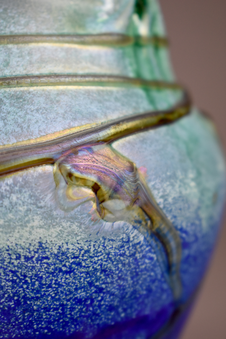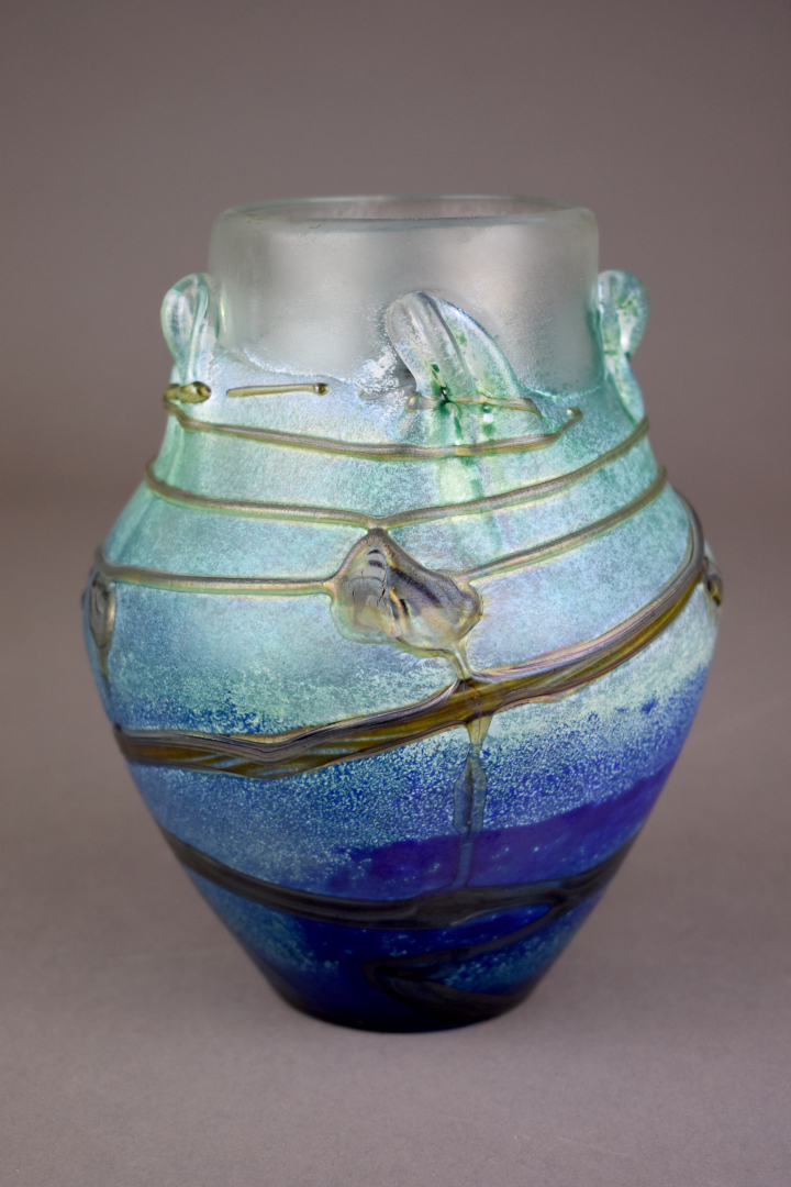 Vase en verre soufflé et appliqué bleu et vert à reflets irisé. Signé sous la base et daté 1986.