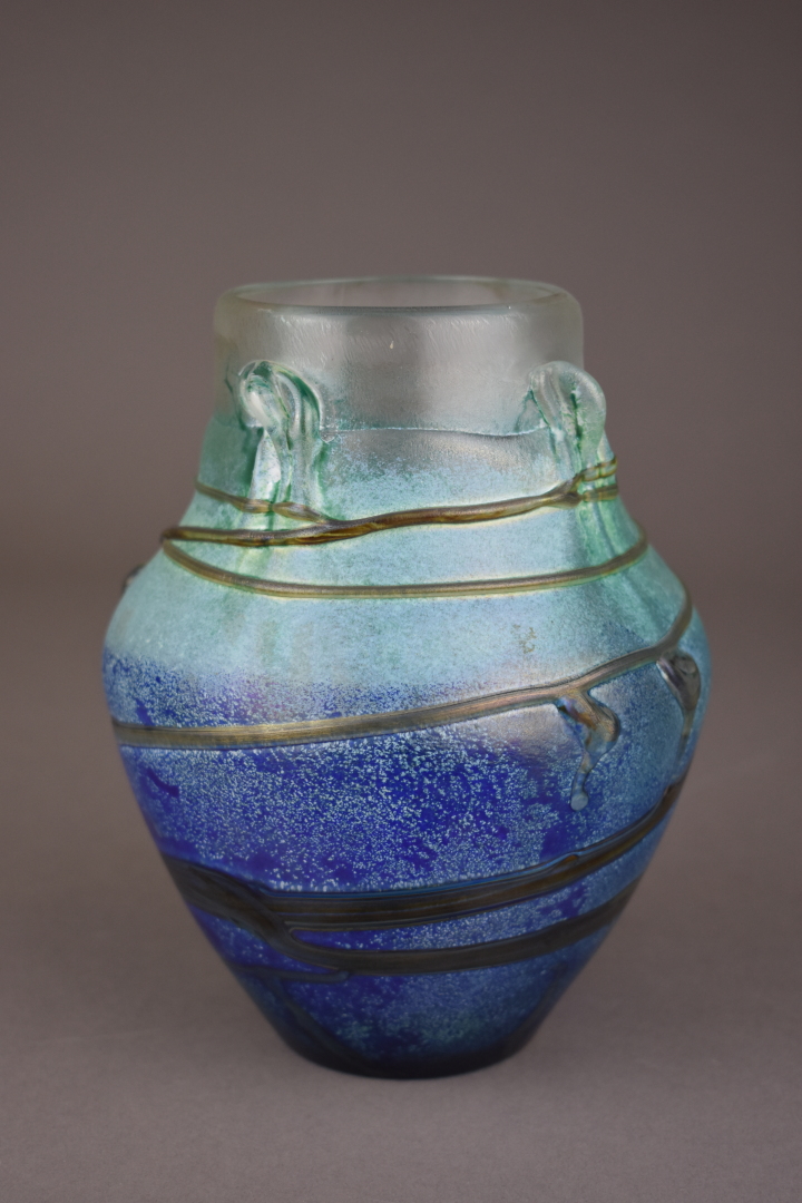 Jean-Claude NOVARO (1943 – 2015). Vase en verre soufflé et appliqué bleu et vert à reflets irisé. Signé sous la base et daté 1986. Haut. : 17,5 cm.