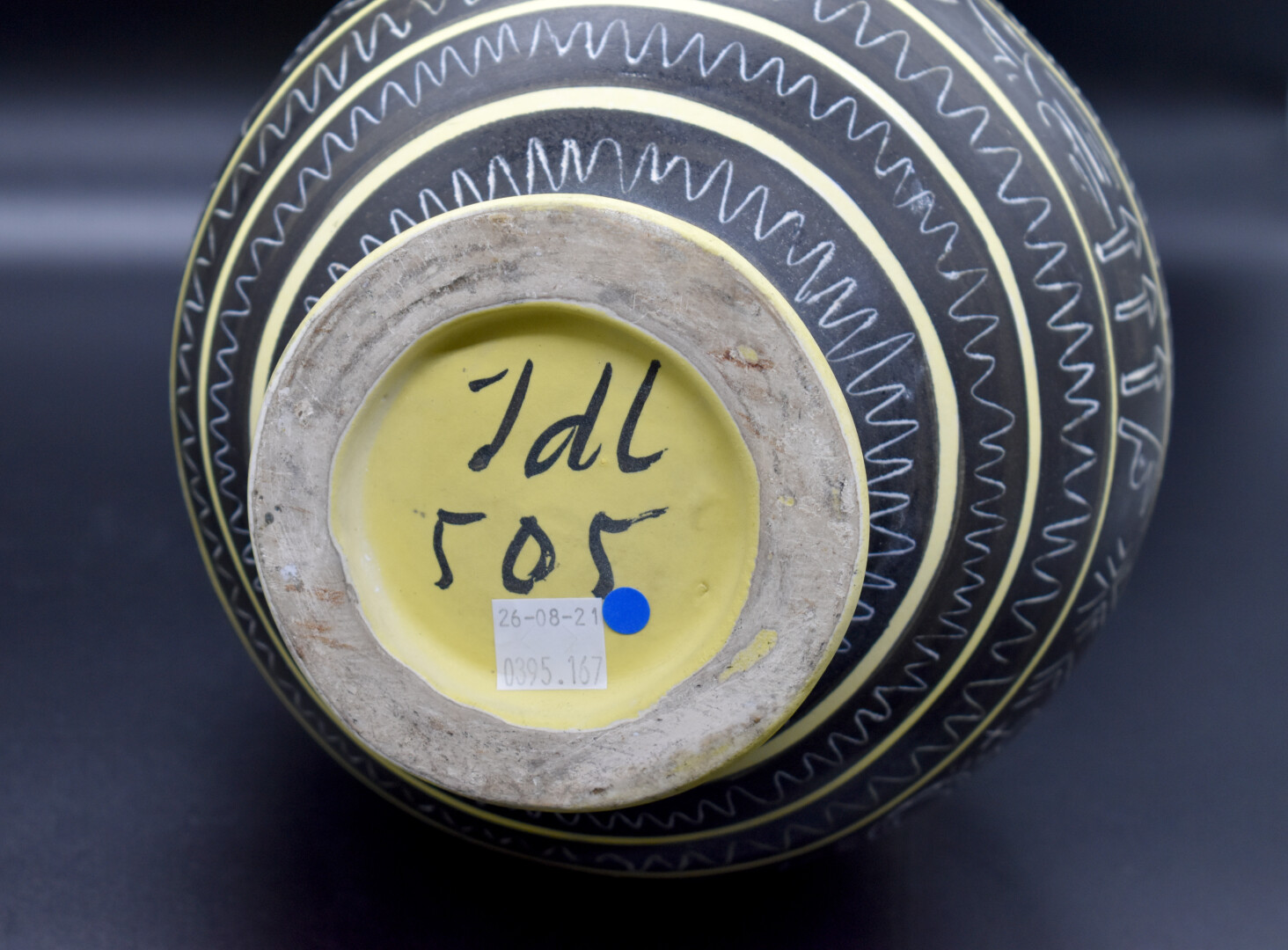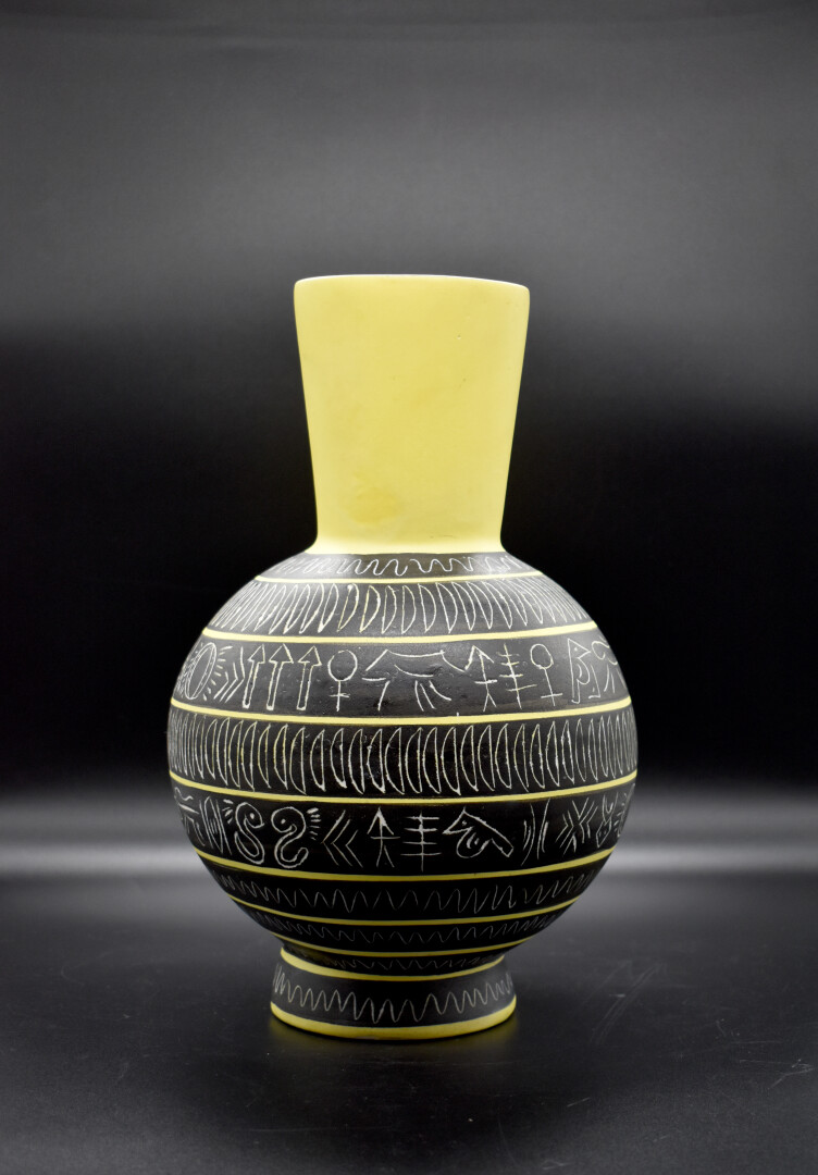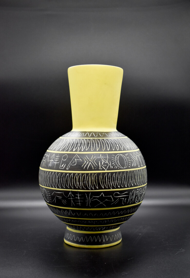 Jean de LESPINASSE (1896-1979). Vase boule à haut col en céramique émaillée à décor gravé de frises de motifs géométriques en creux sur fond noir et jaune. Monogrammé JDL et numéroté 505 sous la base. Haut. : 33 cm.
