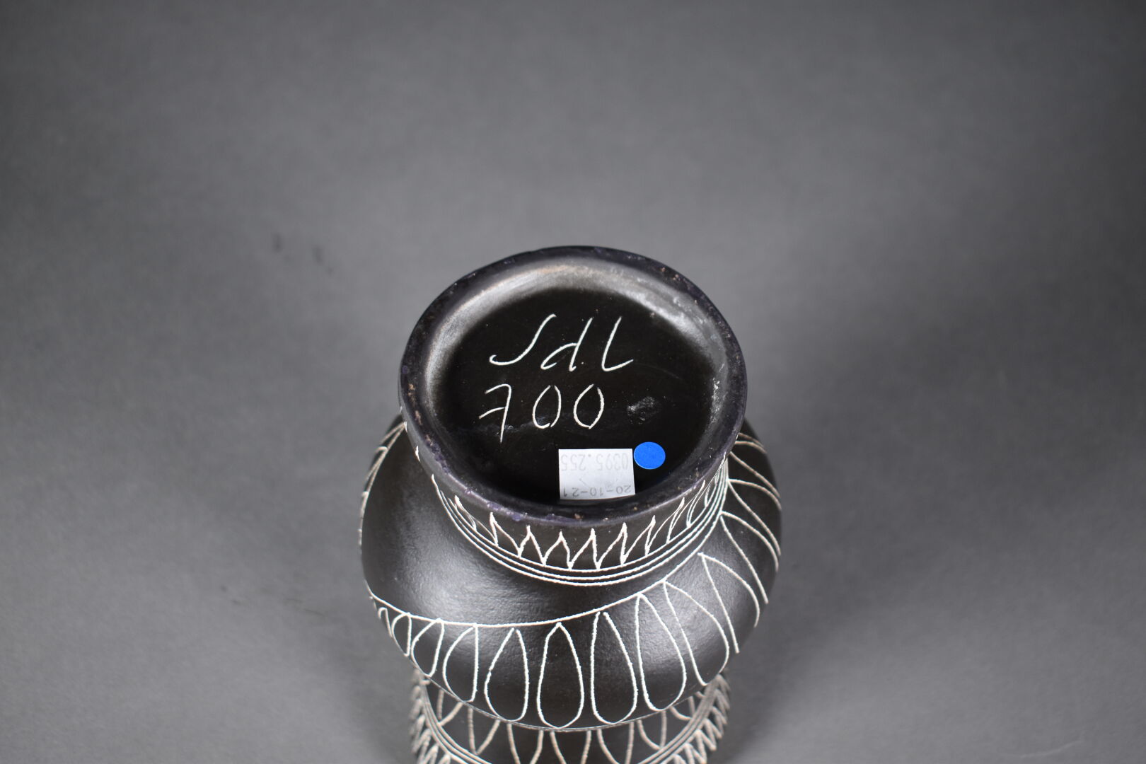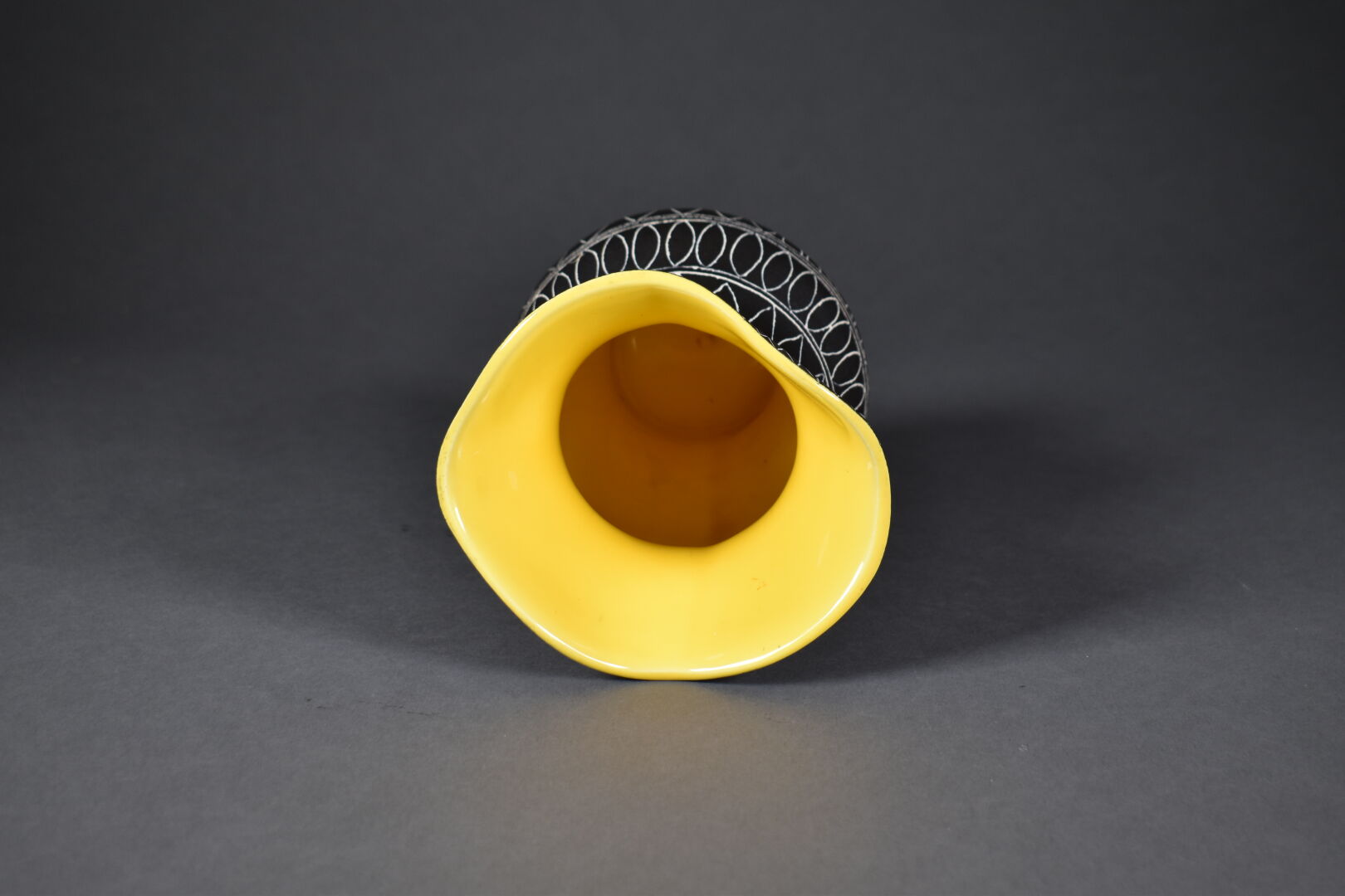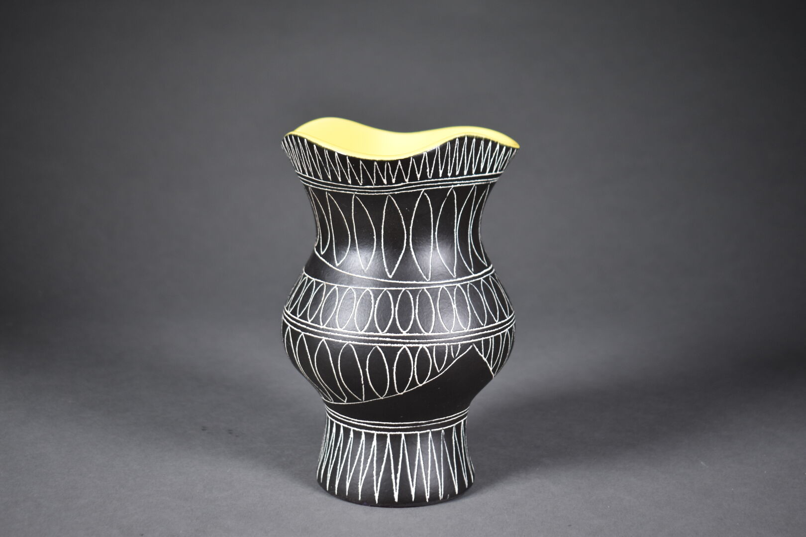 Jean de LESPINASSE (1896-1979). Vase pansu à col corolle en céramique émaillée à décor gravé de frises de motifs géométriques en creux sur fond noir et jaune. Monogrammé JDL et numéroté 700 sous la base. Haut. : 21 cm.