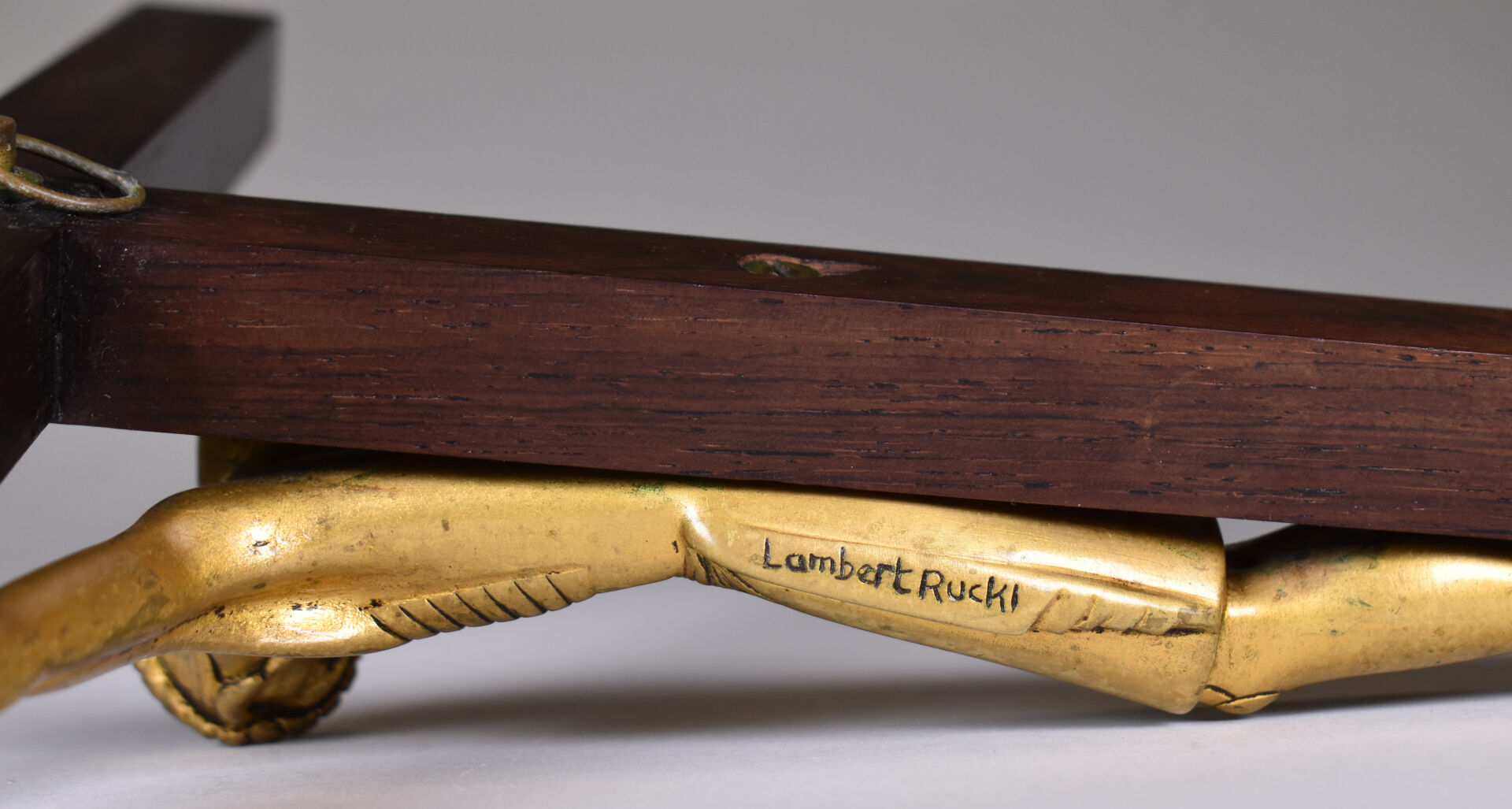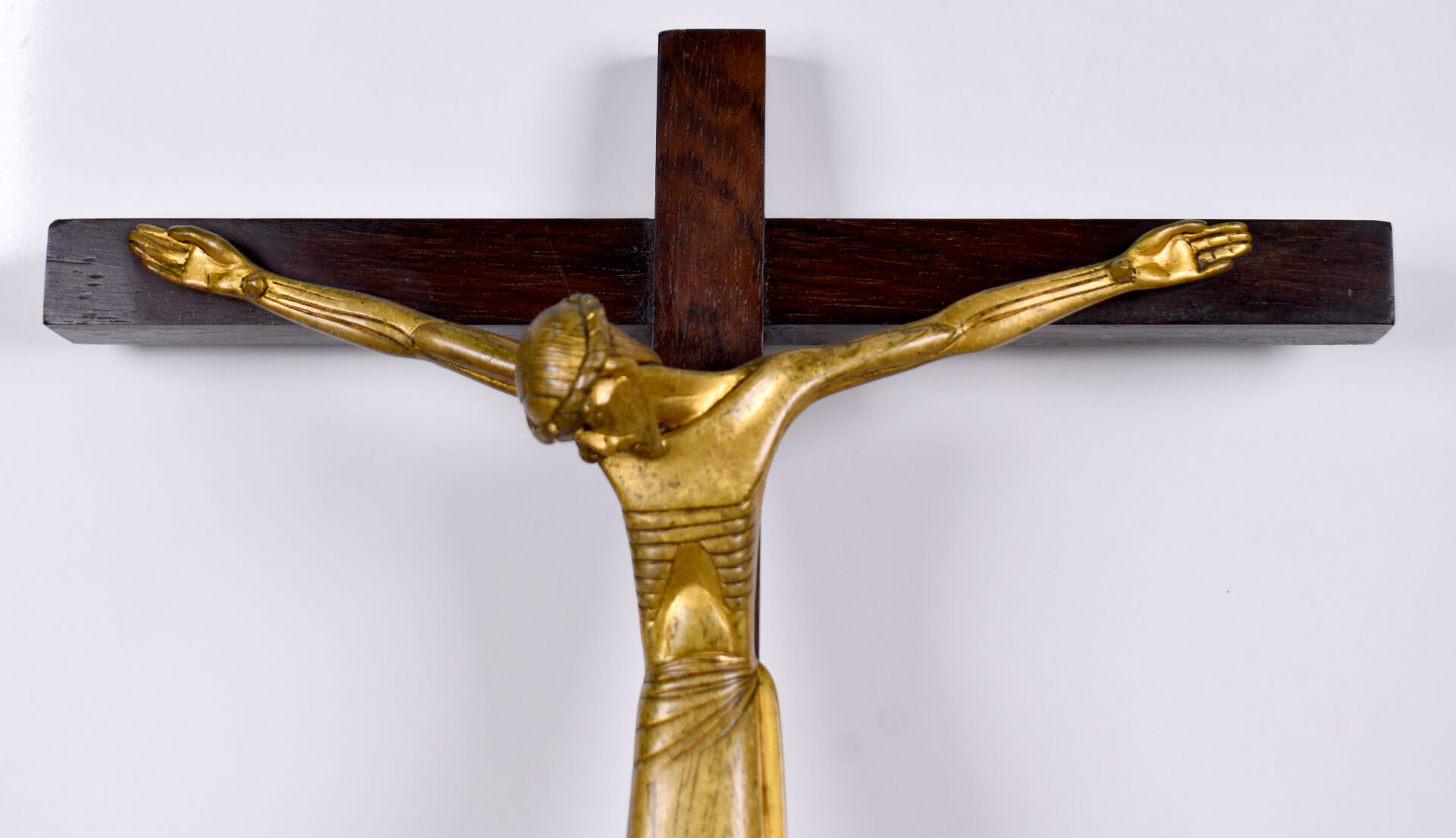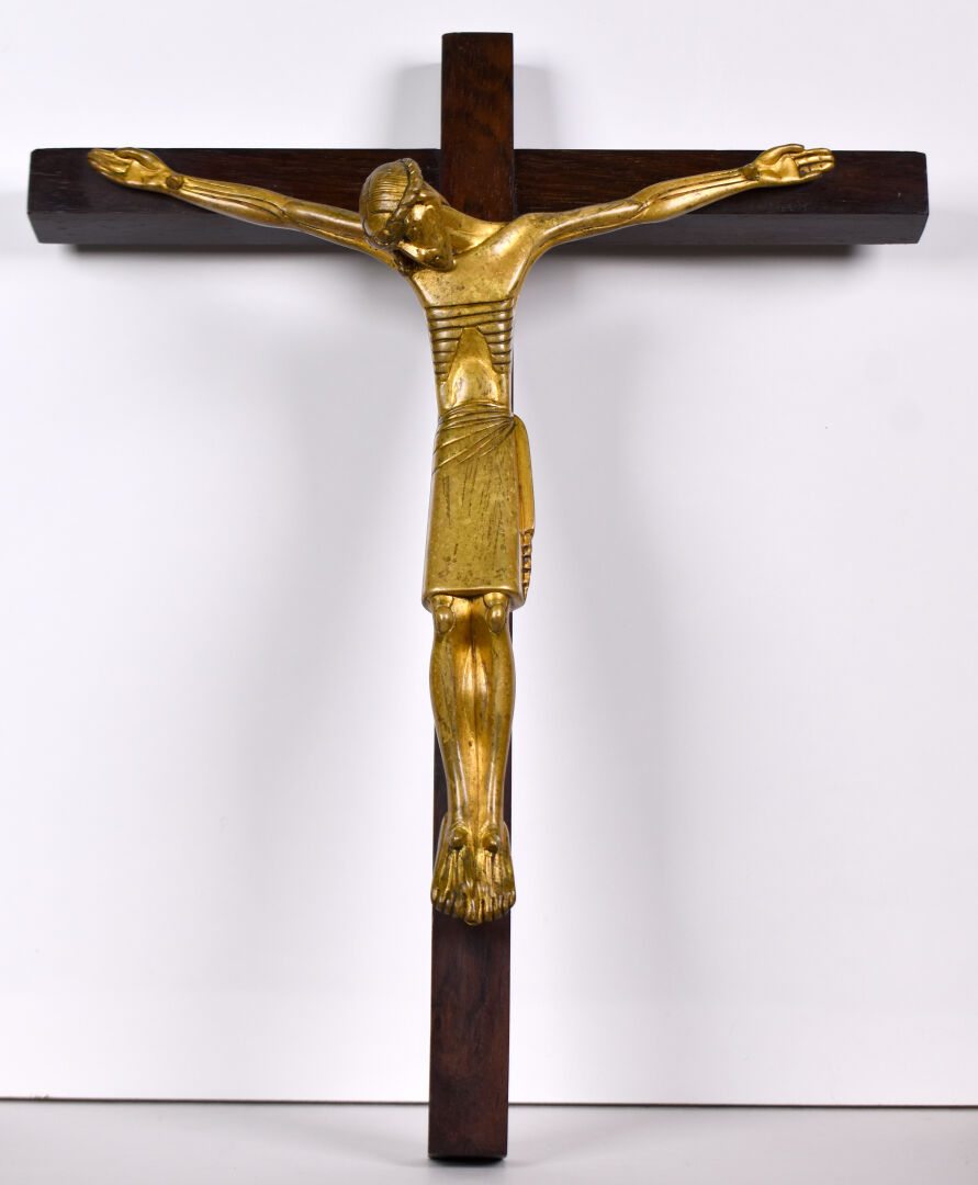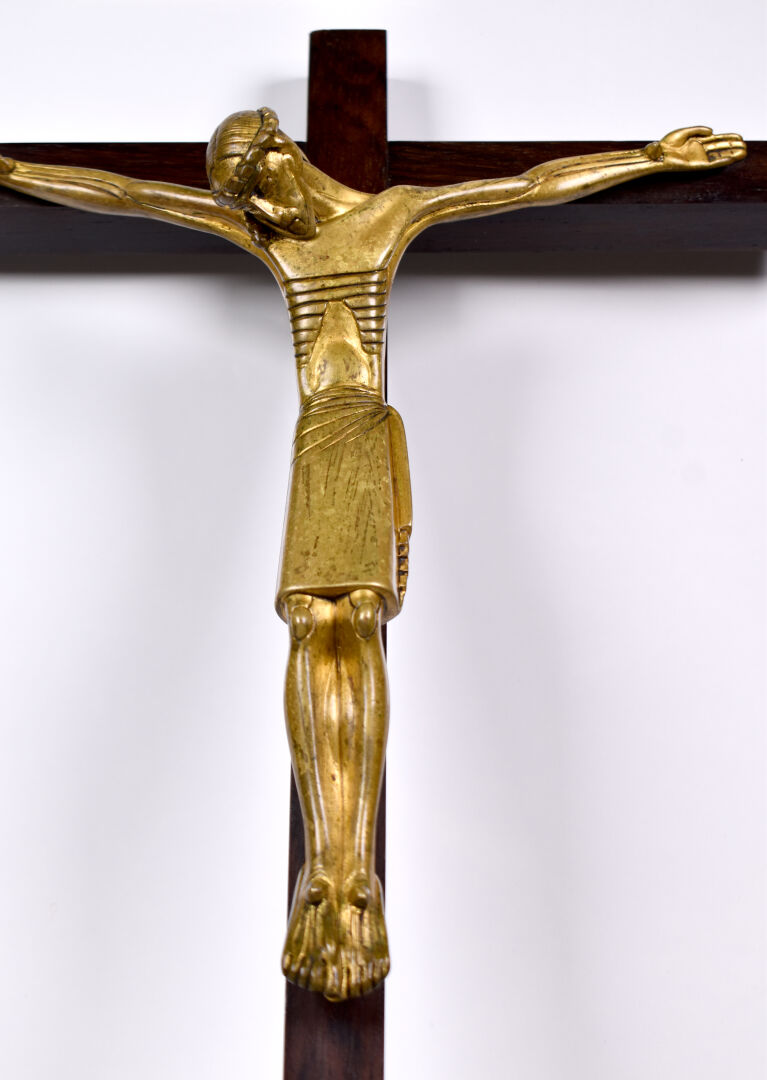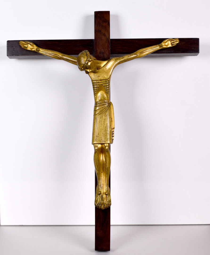 Jean LAMBERT-RUCKI (1888-1967). Crucifix en bronze doré sur palissandre. Signé. Haut. : 30,5 cm – Larg. : 24 cm.