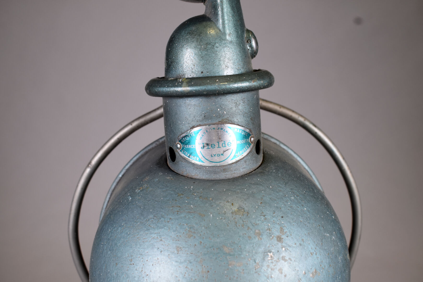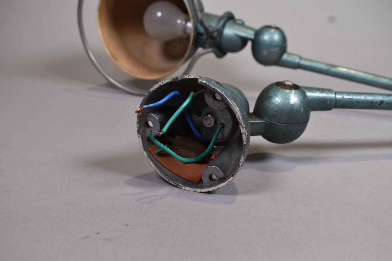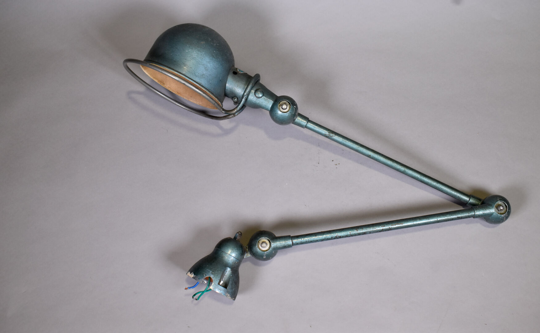 Jean-Louis DOMECQ (1920-1983) – JIELDE. Lampe d’atelier à trois articulations en métal laqué bleu. Plaque. Long. : 121,5 cm.