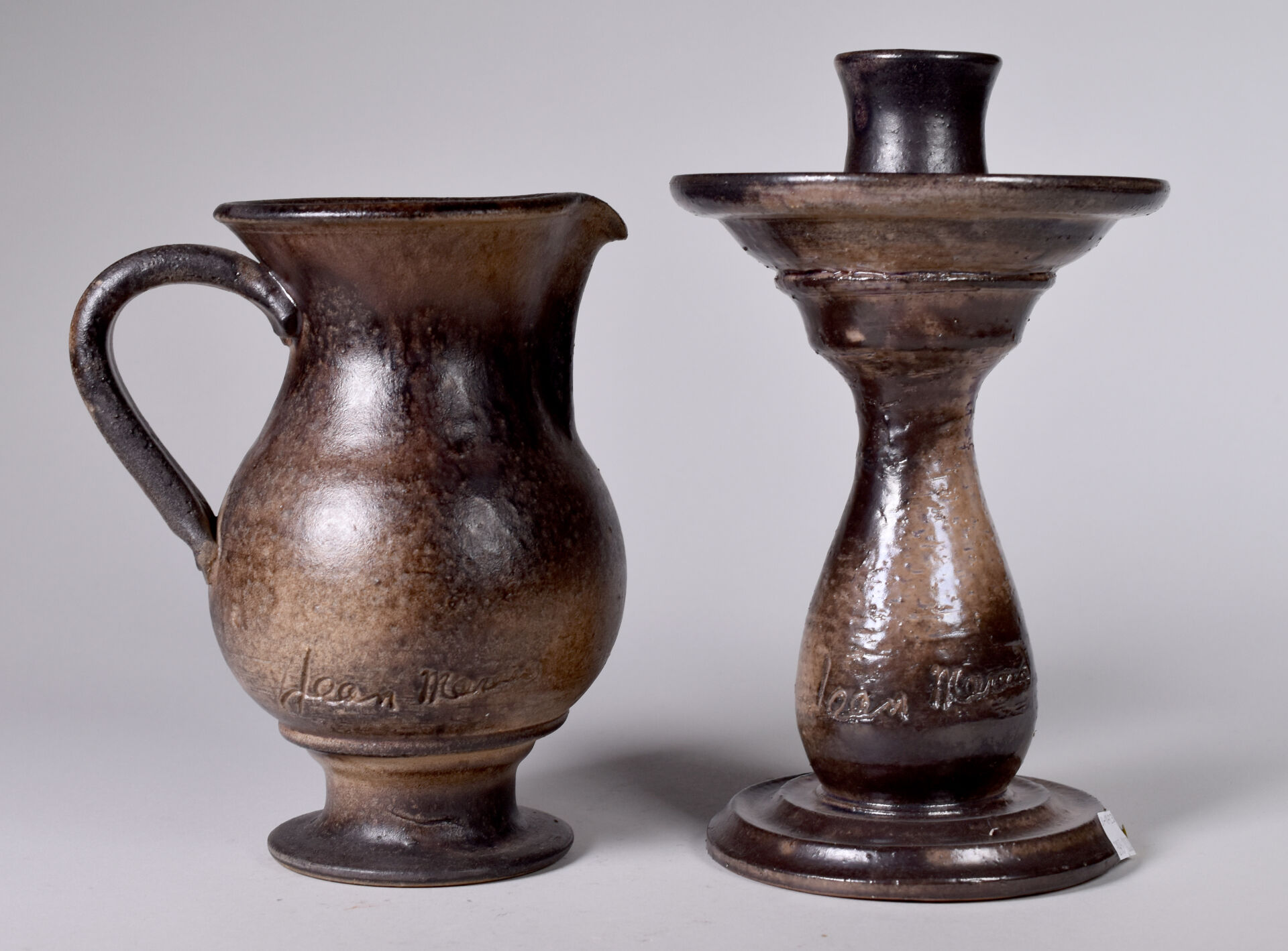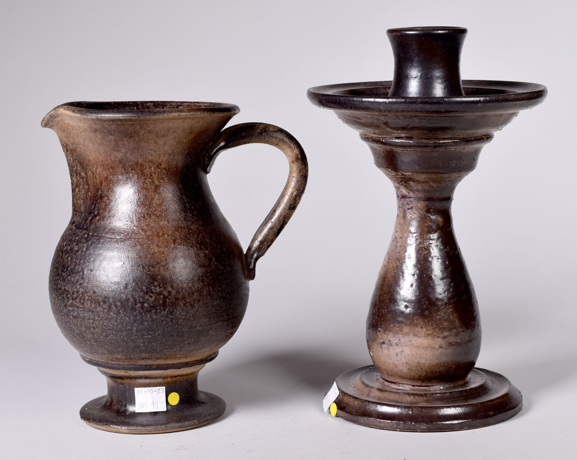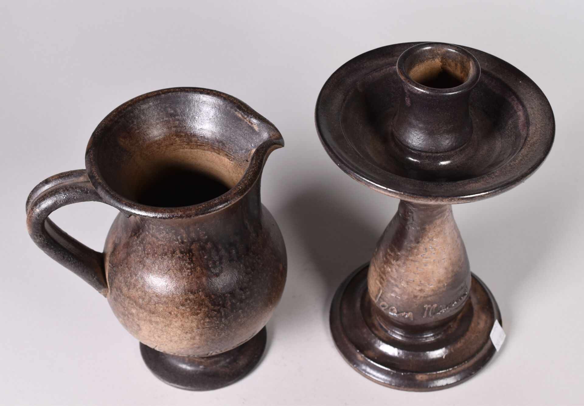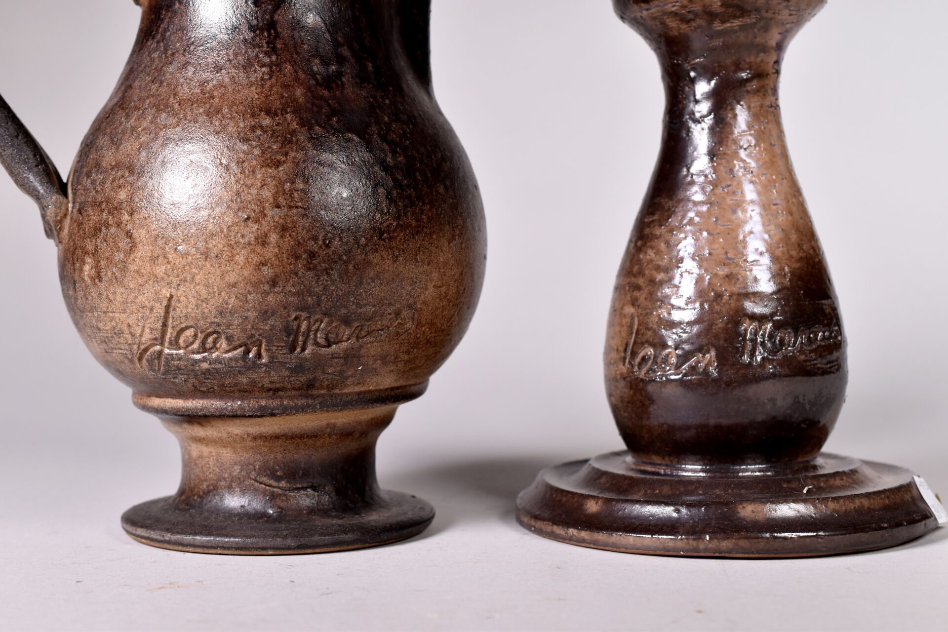 Jean MARAIS (1913-1998). Ensemble en céramique émaillée brun soit un pichet et un bougeoir. Les deux signés. Haut. du bougeoir : 27 cm.